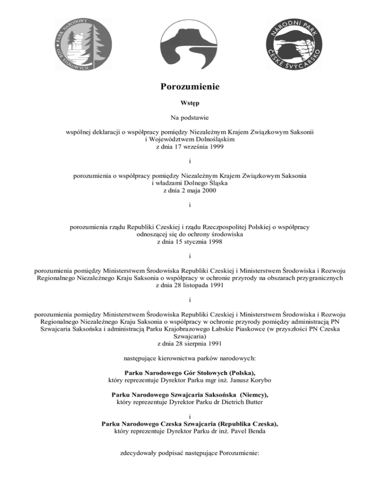Porozumienie Wstęp Na podstawie wspólnej deklaracji o współpracy pomiędzy NiezaleŜnym Krajem Związkowym Saksonii i Województwem Dolnośląskim z dnia 17 września 1999 i porozumienia o współpracy pomiędzy NiezaleŜnym Krajem Związkowym Saksonia i władzami Dolnego Śląska z dnia 2 maja 2000 i porozumienia rządu Republiki Czeskiej i rządu Rzeczpospolitej Polskiej o współpracy odnoszącej się do ochrony środowiska z dnia 15 stycznia 1998 i porozumienia pomiędzy Ministerstwem Środowiska Republiki Czeskiej i Ministerstwem Środowiska i Rozwoju Regionalnego NiezaleŜnego Kraju Saksonia o współpracy w ochronie przyrody na obszarach przygranicznych z dnia 28 listopada 1991 i porozumienia pomiędzy Ministerstwem Środowiska Republiki Czeskiej i Ministerstwem Środowiska i Rozwoju Regionalnego NiezaleŜnego Kraju Saksonia o współpracy w ochronie przyrody pomiędzy administracją PN Szwajcaria Saksońska i administracją Parku Krajobrazowego Łabskie Piaskowce (w przyszłości PN Czeska Szwajcaria) z dnia 28 sierpnia 1991 następujące kierownictwa parków narodowych: Parku Narodowego Gór Stołowych (Polska), który reprezentuje Dyrektor Parku mgr inŜ. Janusz Korybo Parku Narodowego Szwajcaria Saksońska (Niemcy), który reprezentuje Dyrektor Parku dr Dietrich Butter i Parku Narodowego Czeska Szwajcaria (Republika Czeska), który reprezentuje Dyrektor Parku dr inŜ. Pavel Benda zdecydowały podpisać następujące Porozumienie: Artykuł 1 Fundament porozumienia Regiony w których znajdują się wszystkie trzy parki narodowe – Góry Stołowe w Polsce, Szwajcaria Saksońska w Niemczech i Czeska Szwajcaria w Republice Czeskiej, są połączone bardzo podobną przyrodą i historią. Pochodzą z tej samej ery geologicznej, jak teŜ posiadają liczne podobieństwa zarówno w zakresie geojak i bioróŜnorodności. Ponadto, wszystkie trzy parki narodowe napotykają podobne wyzwania i zagroŜenia. Zatem, współpraca i wymiana doświadczeń jak teŜ inicjowanie wspólnych projektów ukierunkowanych na ochronę dziedzictwa przyrodniczego i kulturowego znajduje się w kręgu zainteresowania wszystkich trzech partnerów. Artykuł 2 Cel porozumienia Celem porozumienia jest: (i) zwiększanie wymiany doświadczeń w ochronie przyrody i krajobrazu, i dzielenie się informacjami oraz wiedzą odnoszącą się do wszystkich trzech Parków Narodowych oraz przylegających regionów, (ii) wspieranie monitoringu i działalności badawczej we wszystkich trzech Parkach Narodowych, (iii) wspieranie współpracy z lokalnymi władzami i społecznościami, (iv) współpraca w kreowaniu wizerunku, zarządzaniu udostępnianiem oraz w zakresie edukacji ekologicznej (v) inicjowanie wspólnych projektów oraz finansowe wsparcie programów związanych z wyŜej wymienionymi zagadnieniami Artykuł 3 Działania w ramach Porozumienia Działania podejmowane w celu osiągnięcia celów Porozumienia powinny pokrywać cały zakres działań związanych ze wszystkimi trzema Parkami Narodowymi, jednakŜe, powinny one skupiać się szczególnie na następujących problemach: (i) wspólne organizowanie konferencji, warsztatów, seminariów, szkoleń dla pracowników Parków Narodowych oraz partnerów Parków Narodowych, (ii) inicjowanie lub/i realizacji wspólnych projektów badawczych, edukacyjnych i wizerunkowych, (iii) wymiana danych, publikacji, i innych źródeł informacji, (iv) wspólna promocja partnerstwa poprzez Internet, publikacje i inne media. Wspólne działania w ramach niniejszego Memorandum będą prowadzone zgodnie z obowiązującymi przepisami i regulacjami prawnymi oraz z zastrzeŜeniem dostępności odpowiednich środków finansowych i personelu Stron zaangaŜowanych w realizację tych przedsięwzięć. Artykuł 4 Wnioski końcowe Zmiany w tym Porozumieniu są akceptowalne wyłącznie w formie pisemnej za zgodą wszystkich partnerów. Porozumienie wchodzi w Ŝycie z dniem podpisania przez wszystkich partnerów. Porozumienie zawarte zostaje na czas nieokreślony. KaŜdy z partnerów Porozumienia moŜe zrezygnować z partnerstwa w kaŜdej chwili. Rezygnacja powinna być przedstawiona w formie pisemnej z 3 miesięcznym okresem wypowiedzenia. Porozumienie zostało przygotowane w języku polskim, niemieckim, czeskim i angielskim. Wszystkie wersje językowe mają tą samą waŜność. Podpisano w Kudowie-Zdroju, dnia 25. 04. 2012 r. W imieniu Parku Narodowego Gór Stołowych Janusz Korybo W imieniu Parku Narodowego Szwajcaria Saksońska Jürgen Phoenix W imieniu Parku Narodowego Czeska Szwajcaria Pavel Benda