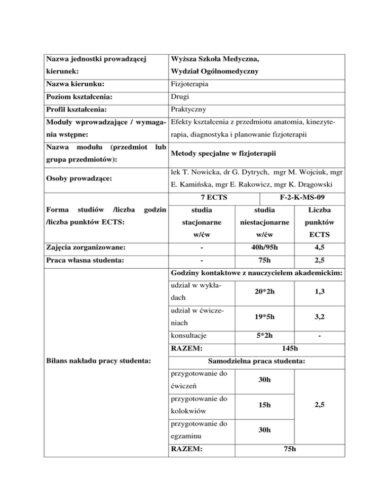 Nazwa jednostki prowadzącej Wyższa Szkoła Medyczna, kierunek: Wydział Ogólnomedyczny Nazwa kierunku: Fizjoterapia Poziom kształcenia: Drugi Profil kształcenia: Praktyczny Moduły wprowadzające / wymaga- Efekty kształcenia z przedmiotu anatomia, kinezytenia wstępne: Nazwa modułu rapia, diagnostyka i planowanie fizjoterapii (przedmiot lub grupa przedmiotów): Metody specjalne w fizjoterapii lek T. Nowicka, dr G. Dytrych, mgr M. Wojciuk, mgr Osoby prowadzące: E. Kamińska, mgr E. Rakowicz, mgr K. Drągowski 7 ECTS Forma studiów /liczba godzin F-2-K-MS-09 studia studia Liczba stacjonarne niestacjonarne punktów w/ćw w/ćw ECTS Zajęcia zorganizowane: - 40h/95h 4,5 Praca własna studenta: - 75h 2,5 /liczba punktów ECTS: Godziny kontaktowe z nauczycielem akademickim: udział w wykładach udział w ćwiczeniach konsultacje 20*2h 1,3 19*5h 3,2 5*2h - RAZEM: Bilans nakładu pracy studenta: 145h Samodzielna praca studenta: przygotowanie do 30h ćwiczeń przygotowanie do kolokwiów przygotowanie do egzaminu RAZEM: 2,5 15h 30h 75h Cele modułu: Student zrozumie specyfikę i przeznaczenie podstawowych metod reedukacji, neurorehabilitacji i terapii manualnej; będzie również potrafił zastosować metody specjalne w fizjoterapii. Efekty kształcenia: Odniesienie się Przedmiotowy Efekty kształcenia efekt kształcenia do kierunkowych efektów kształcenia P_W01 P_W02 ma wiedzę na temat roli specjalnych metod kinezytera- K2_W22 pii i zna ich systematykę K2_W32 ma wiedzę na temat metod reedukacji posturalnej K2_W22 K2_W32 P_W03 ma wiedzę na temat neurorehabilitacji K2_W22 K2_W32 P_W04 ma wiedzę na temat terapii manualnej K2_W22 K2_W32 P_W05 P_W06 ma wiedzę na temat biologicznego sprzężenia zwrotne- K2_W22 go K2_W32 ma wiedzę na temat terapii w środowisku wodnym K2_W22 K2_W32 P_U01 charakteryzuje metody reedukacji, neurorehabilitacji K2_U30 oraz terapii manualnej P_U02 stosuje odpowiednią metodę w danym problemie cho- K2_U30 robowym w obrębie narządu ruchu P_U03 weryfikuje sposób postępowania w zależności od K2_U26 wskazań i aktualnego stanu pacjenta P_U04 obsługuje zaawansowany sprzęt stosowany w wykony- K2_U07 waniu metod P_K01 jest otwarty na współpracę ze specjalistami dziedzin K2_K03 pokrewnych biorących udział w procesie leczniczego usprawniania P_K02 przestrzega zasad etycznych, czuje się odpowiedzialny K2_K06 za życie i zdrowie pacjenta Wiedza – student: • ma wiedzę na temat roli specjalnych metod kinezyterapii i zna ich systematykę. • ma wiedzę na temat metod reedukacji posturalnej, • ma wiedzę na temat neurorehabilitacji, • ma wiedzę na temat terapii manualnej, • ma wiedzę na temat biologicznego sprzężenia zwrotnego, • ma wiedzę na temat terapii w środowisku wodnym. Umiejętności – student: • charakteryzuje metody reedukacji, neurorehabilitacji oraz terapii manualnej, • stosuje odpowiednią metodę w danym problemie chorobowym w obrębie narządu ruchu, • weryfikuje sposób postępowania w zależności od wskazań i aktualnego stanu pacjenta, • obsługuje zaawansowany sprzęt stosowany w wykonywaniu metod. Kompetencje społeczne – student: • jest otwarty na współpracę ze specjalistami dziedzin pokrewnych biorących udział w procesie leczniczego usprawniania, • przestrzega zasad etycznych, czuje się odpowiedzialny za życie i zdrowie pacjenta Forma zajęć/metody dydaktyczne: Wykład informacyjny, multimedialny, ćwiczenia, praca w grupie, studium przypadku Forma i warunki zaliczenia przedmiotu w odniesieniu do efektów kształcenia. Nr efektu Metody weryfikacji efektu kształcenia kształcenia Formujące: Podsumowujące: P_W01 Test wstępny Egzamin pisemny – student generuje / P_W02 Ocena przygotowania do zajęć rozpoznaje odpowiedź (esej, raport; P_W03 Wejściówki na ćwiczeniach krótkie strukturyzowane pytania /SSQ/; P_W04 Sprawdzanie wiedzy w trakcie ćwiczeń test wielokrotnego wyboru /MCQ/; test P_W05 Kolokwium pisemne P_W06 wielokrotnej odpowiedzi /MRQ/; test dopasowania; test T/N; test uzupełniania odpowiedzi) P_U01 Obserwacja pracy studenta Obiektywny Strukturyzowany Egza- P_U02 Test wstępny min Kliniczny /OSCE/ - egzamin zor- P_U03 Zaliczenie poszczególnych czynności ganizowany w postaci stacji z określo- P_U04 Bieżąca informacja zwrotna nym zadaniem do wykonania /stacje Opis przypadku z chorym lub bez chorego, z materia- Ocena aktywności studenta w czasie łem klinicznym lub bez niego, z symuzajęć latorem, z fantomem, pojedyncze lub Dyskusja w czasie ćwiczeń sparowane, z obecnością dodatkowego Zaliczenia cząstkowe personelu, wypoczynkowe/ Kolokwium praktyczne ocena w systemie punktowym Mini-CEX Ocena przygotowania do zajęć examination) (mini – clinical Próba pracy Realizacja zleconego zadania P_K01 Obserwacja pracy studenta Przedłużona obserwacja przez opieku- P_K02 Obserwacja pracy na ćwiczeniach na / nauczyciela prowadzącego Bieżąca informacja zwrotna Ocena 360° (opinie nauczycieli, kole- Dyskusja w czasie ćwiczeń gów/koleżanek, pacjentów, innych Ocena wyciąganych wniosków z eks- współpracowników) perymentów Treści programowe: Wykłady: 40 godzin 1. Miejsce i rola specjalnych metod kinezyterapii i terapii manualnej w procesie fizjoterapii. Stanowiska i ich oprzyrządowanie 2 godz. 2. Metody specjalne jako zamknięta całość i jako zasób środków fizjoterapii. Systematyka metod kinezyterapeutycznych 4 godz. 3. Metody ukierunkowane na łagodzenie poszczególnych objawów. Kinezyterapeutyczne sposoby łagodzenia bólu 4 godz. 4. Metody fizjoterapii stosowane w schorzeniach narządu ruchu. Metody fizjoterapii stosowane w schorzeniach ośrodkowego układu nerwowego. Metody reedukacji nerwowo-mięśniowej 8 godz. 5. Metody neurorehabilitacji dorosłych. Metody neurorehabilitacji dzieci 6 godz. 6. Metody reedukacji posturalnej i tzw. „szkoły pleców” 4 godz. 7. Metody terapii manualnej 6 godz. 8. Metody biologicznego sprzężenia zwrotnego 2 godz. 
