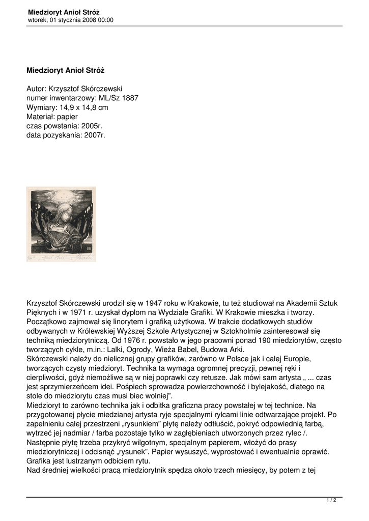 Miedzioryt Anioł Stróż wtorek, 01 stycznia 2008 00:00 Miedzioryt Anioł Stróż Autor: Krzysztof Skórczewski numer inwentarzowy: ML/Sz 1887 Wymiary: 14,9 x 14,8 cm Materiał: papier czas powstania: 2005r. data pozyskania: 2007r. Krzysztof Skórczewski urodził się w 1947 roku w Krakowie, tu też studiował na Akademii Sztuk Pięknych i w 1971 r. uzyskał dyplom na Wydziale Grafiki. W Krakowie mieszka i tworzy. Początkowo zajmował się linorytem i grafiką użytkowa. W trakcie dodatkowych studiów odbywanych w Królewskiej Wyższej Szkole Artystycznej w Sztokholmie zainteresował się techniką miedziorytniczą. Od 1976 r. powstało w jego pracowni ponad 190 miedziorytów, często tworzących cykle, m.in.: Lalki, Ogrody, Wieża Babel, Budowa Arki. Skórczewski należy do nielicznej grupy grafików, zarówno w Polsce jak i całej Europie, tworzących czysty miedzioryt. Technika ta wymaga ogromnej precyzji, pewnej ręki i cierpliwości, gdyż niemożliwe są w niej poprawki czy retusze. Jak mówi sam artysta „ ... czas jest sprzymierzeńcem idei. Pośpiech sprowadza powierzchowność i bylejakość, dlatego na stole do miedziorytu czas musi biec wolniej”. Miedzioryt to zarówno technika jak i odbitka graficzna pracy powstałej w tej technice. Na przygotowanej płycie miedzianej artysta ryje specjalnymi rylcami linie odtwarzające projekt. Po zapełnieniu całej przestrzeni „rysunkiem” płytę należy odtłuścić, pokryć odpowiednią farbą, wytrzeć jej nadmiar / farba pozostaje tylko w zagłębieniach utworzonych przez rylec /. Następnie płytę trzeba przykryć wilgotnym, specjalnym papierem, włożyć do prasy miedziorytniczej i odcisnąć „rysunek”. Papier wysuszyć, wyprostować i ewentualnie oprawić. Grafika jest lustrzanym odbiciem rytu. Nad średniej wielkości pracą miedziorytnik spędza około trzech miesięcy, by potem z tej 1/2 Miedzioryt Anioł Stróż wtorek, 01 stycznia 2008 00:00 „matrycy” móc uzyskać około stu dobrej jakości odbitek. Odbitki są numerowane ołówkiem według kolejności ich powstania – numer jest "łamany" przez przewidywany nakład prac. Po wyczerpaniu zakładanego nakładu płyta jest przekreślana, aby nie można było już z niej odbijać gorszej jakości sztychów. Miedzioryty Krzysztofa Skórczewskiego kolekcjonuje wiele muzeów, galerii, kolekcjonerów na całym świecie. Nasze Muzeum jest jedynym w Polsce gdzie w zbiorach znalazły się wszystkie prace miedziorytnicze tego znakomitego artysty. Łucja Wojtasik-Seredyszyn 2/2