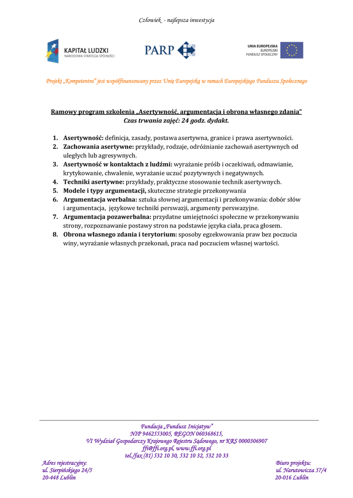 Człowiek - najlepsza inwestycja Projekt „Kompetentni” jest współfinansowany przez Unię Europejską w ramach Europejskiego Funduszu Społecznego Ramowy program szkolenia „Asertywność, argumentacja i obrona własnego zdania” Czas trwania zajęć: 24 godz. dydakt. 1. Asertywność: definicja, zasady, postawa asertywna, granice i prawa asertywności. 2. Zachowania asertywne: przykłady, rodzaje, odróżnianie zachowań asertywnych od uległych lub agresywnych. 3. Asertywność w kontaktach z ludźmi: wyrażanie próśb i oczekiwań, odmawianie, krytykowanie, chwalenie, wyrażanie uczuć pozytywnych i negatywnych. 4. Techniki asertywne: przykłady, praktyczne stosowanie technik asertywnych. 5. Modele i typy argumentacji, skuteczne strategie przekonywania 6. Argumentacja werbalna: sztuka słownej argumentacji i przekonywania: dobór słów i argumentacja, językowe techniki perswazji, argumenty perswazyjne. 7. Argumentacja pozawerbalna: przydatne umiejętności społeczne w przekonywaniu strony, rozpoznawanie postawy stron na podstawie języka ciała, praca głosem. 8. Obrona własnego zdania i terytorium: sposoby egzekwowania praw bez poczucia winy, wyrażanie własnych przekonań, praca nad poczuciem własnej wartości. Fundacja „Fundusz Inicjatyw” NIP 9462553005, REGON 060368615, VI Wydział Gospodarczy Krajowego Rejestru Sądowego, nr KRS 0000306907 [email protected], www.ffi.org.pl tel./fax (81) 532 10 30, 532 10 32, 532 10 33 Adres rejestracyjny: ul. Sierpińskiego 24/5 20-448 Lublin Biuro projektu: ul. Narutowicza 57/4 20-016 Lublin