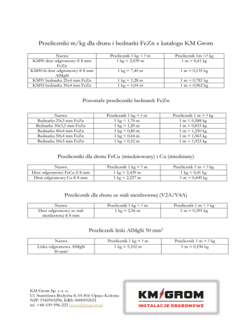 Przeliczniki m/kg dla drutu i bednarki FeZn z katalogu KM Grom