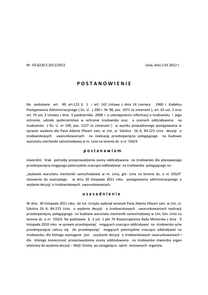 Nr OŚ.6220.5.2011/2012 Linia, dnia 2.01.2012 r. POSTANOWIENIE Na podstawie art. 49, art.123 § 1 i art. 142 Ustawy z dnia 14 czerwca 1960 r. Kodeksu Postępowania Administracyjnego ( Dz. U. z 200 r. Nr 98, poz. 1071 ze zmianami ), art. 63 ust. 2 oraz art. 74 ust. 3 Ustawy z dnia 3 października 2008 r. o udostępnieniu informacji o środowisku i jego ochronie, udziale społeczeństwa w ochronie środowiska oraz o ocenach oddziaływania na środowisko ( Dz. U. nr 199, poz. 1227 ze zmianami ) w wyniku prowadzonego postępowania w sprawie wydania dla Pana Adama Ellwart zam. w Lini, ul. Szkolna 26 A, 84-223 Linia decyzji o środowiskowych uwarunkowaniach na realizację przedsięwzięcia polegającego na budowie warsztatu mechaniki samochodowej w m. Linia na terenie dz. o nr 550/4 postanawiam stwierdzić brak potrzeby przeprowadzenia oceny oddziaływania na środowisko dla planowanego przedsięwzięcia mogącego potencjalnie znacząco oddziaływać na środowisko polegającego na : „budowie warsztatu mechaniki samochodowej w m. Linia, gm. Linia na terenie dz. o nr 550/4” stosownie do wszczętego w dniu 30 listopada 2011 roku postępowania administracyjnego o wydanie decyzji o środowiskowych uwarunkowaniach. uzasadnienie W dniu 30 listopada 2011 roku do tut. Urzędu wpłynął wniosek Pana Adama Ellwart zam. w Lini, ul. Szkolna 26 A, 84-223 Linia o wydanie decyzji o środowiskowych uwarunkowaniach realizacji przedsięwzięcia, polegającego na budowie warsztatu mechaniki samochodowej w Lini, Gm. Linia na terenie dz. o nr 550/4. Na podstawie § 3 ust. 1 pkt 76 Rozporządzenia Rady Ministrów z dnia 9 listopada 2010 roku w sprawie przedsięwzięć mogących znacząco oddziaływać na środowisko w/w przedsięwzięcie zalicza się do przedsięwzięć mogących potencjalnie znacząco oddziaływać na środowisko, dla którego wymagane jest uzyskanie decyzji o środowiskowych uwarunkowaniach i dla którego konieczność przeprowadzenia oceny oddziaływania na środowisko stwierdza organ właściwy do wydania decyzji – Wójt Gminy po zasięgnięciu opinii stosownych organów. - 2 - Stosownie do wymogów art. 64 ust. 1 pkt 1 i 2, art. 156 Ustawy z dnia 3 października 2008 r. o udostępnieniu informacji o środowisku i jego ochronie, udziale społeczeństwa w ochronie środowiska oraz o ocenach oddziaływania na środowisko (Dz. U. z 2008 roku Nr 199, poz. 1227 ) tut. organ zwrócił się do Regionalnego Dyrektora Ochrony Środowiska w Gdańsku oraz Państwowego Powiatowego Inspektora Sanitarnego w Wejherowie o wydania opinii w sprawie stwierdzenia obowiązku przeprowadzenia oceny oddziaływania na środowisko, a w przypadku stwierdzenia takiej potrzeby - co do zakresu raportu o oddziaływaniu na środowisko w/w przedsięwzięcia. Regionalny Dyrektor Ochrony Środowiska w Gdańsku wyraził opinię, że dla powyższego przedsięwzięcia nie zachodzi konieczność przeprowadzenia oceny oddziaływania na środowisko, w związku z czym sporządzenie raportu o oddziaływaniu na środowisko dla planowanego przedsięwzięcia nie jest uzasadnione. ( Postanowienie Regionalnego Dyrektora w Gdańsku Nr RDOŚGd-WOO.4240.861.2.2011.AT z dnia 30.12.2011 roku. Natomiast Państwowy Powiatowy Inspektor Sanitarny w Wejherowie również wyraził opinię, iż przeprowadzenie oceny oddziaływania planowanego przedsięwzięcia na środowisko nie jest konieczne ( opinia Nr SE.NS80/4910/055/PL/11 z dnia 27.12.2011 roku ). W tej sytuacji organ przystąpił do analizy przedmiotowego przedsięwzięcia. Planowane przedsięwzięcia polega na budowie warsztatu mechaniki samochodowej w m. Linia na terenie dz. o nr 550/4. Przedmiotowa działalność obejmuje prace z zakresu naprawy pojazdów oraz serwisowania opon. Planowany warsztat będzie wyposażony w 3 stanowiska naprawcze, biuro i magazyn oraz zaplecze socjalno – biurowe. Planowane zamierzenie kwalifikuje się zgodnie z § 3 ust. 1 pkt 76 Rozporządzenia Rady Ministrów z dnia 09 listopada 2010 roku w sprawie przedsięwzięć mogących znacząco oddziaływać na środowisko (Dz. U. Nr 213, poz. 1397 ze zmianami ) jako „ stacje obsługi lub remontowe sprzętu budowlanego, rolniczego lub środków transportu , inne niż wymienione w pkt 17 -19 i 46, z wyłączeniem myjni i stacji kontroli pojazdów „ w związku z czym realizacja w/w przedsięwzięcia wymaga uzyskania decyzji o środowiskowych uwarunkowaniach na realizację przedsięwzięcia. Analizując łącznie uwarunkowania określone w art. 63 ust. 1 w/w ustawy oraz informacje zawarte w karcie informacyjnej przedsięwzięcia tut. organ zważył co następuje : - rodzaj i charakterystykę przedsięwzięcia – budowa warsztatu usługowo – naprawczego samochodów z dominującą działalnością w zakresie usług wulkanizacyjnych. Planowany budynek będzie obiektem wolnostojącym, jednokondygnacyjnym z poddaszem użytkowym lub nieużytkowym. Warsztat będzie się składał z 3 stanowisk naprawczych, w tym jedno wyposażone w kanał, a pozostałe w podnośniki hydrauliczne. - 3 - Na terenie objętym inwestycją przewidziano organizację parkingu nie zadaszonego o utwardzonej powierzchni na minimum 4 samochody osobowe. W warsztacie będą wykonywane usługi wulkanizacyjne oraz naprawy typu : naprawa tłumików, zawieszeń, układów napędowych , klimatyzacji, wymiana płynów eksploatacyjnych pojazdów i klocków hamulcowych. Nie będą wykonywane naprawy blacharsko – lakiernicze. - usytuowanie przedsięwzięcia – przedsięwzięcie zlokalizowane na zabudowanej, uzbrojonej działce nr 550/4 w Lini obręb Linia o powierzchni 1.989 m 2.Działka znajduje się w centralnej części wsi, w sąsiedztwie drogi gminnej ( od strony zachodniej ). Od strony wschodniej, południowej i północnej graniczy z zabudową mieszkaniową , jednorodzinną. Zgodnie ze zmianą części miejscowego planu zagospodarowania przestrzennego fragmentu wsi Linia dla działki nr Ew. 550/2 położonej w Gminie Linia uchwalony Uchwałą Rady