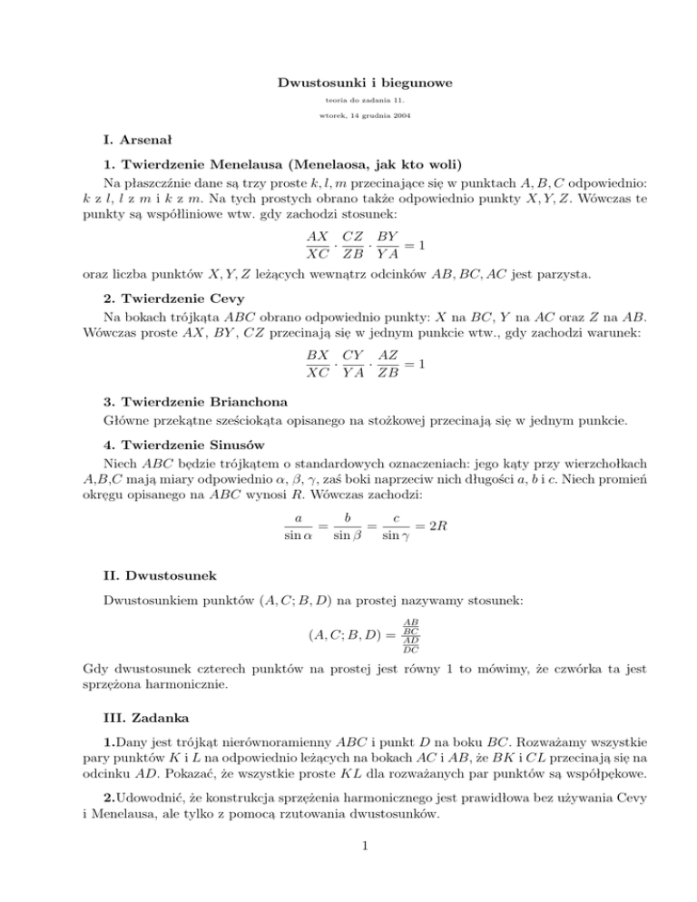 Dwustosunki i biegunowe teoria do zadania 11. wtorek, 14 grudnia 2004 I. Arsenał 1. Twierdzenie Menelausa (Menelaosa, jak kto woli) Na płaszczźnie dane sa, trzy proste k, l, m przecinajace sie, w punktach A, B, C odpowiednio: , k z l, l z m i k z m. Na tych prostych obrano także odpowiednio punkty X, Y, Z. Wówczas te punkty sa, współliniowe wtw. gdy zachodzi stosunek: AX CZ BY · · =1 XC ZB Y A oraz liczba punktów X, Y, Z leżacych wewnatrz odcinków AB, BC, AC jest parzysta. , , 2. Twierdzenie Cevy Na bokach trójkata ABC obrano odpowiednio punkty: X na BC, Y na AC oraz Z na AB. , Wówczas proste AX, BY , CZ przecinaja, sie, w jednym punkcie wtw., gdy zachodzi warunek: BX CY AZ · · =1 XC Y A ZB 3. Twierdzenie Brianchona Główne przekatne sześciokata opisanego na stożkowej przecinaja, sie, w jednym punkcie. , , 4. Twierdzenie Sinusów Niech ABC bedzie trójkatem o standardowych oznaczeniach: jego katy przy wierzchołkach , , , A,B,C maja, miary odpowiednio α, β, γ, zaś boki naprzeciw nich długości a, b i c. Niech promień okregu opisanego na ABC wynosi R. Wówczas zachodzi: , a b c = = = 2R sin α sin β sin γ II. Dwustosunek Dwustosunkiem punktów (A, C; B, D) na prostej nazywamy stosunek: (A, C; B, D) = AB BC AD DC Gdy dwustosunek czterech punktów na prostej jest równy 1 to mówimy, że czwórka ta jest sprzeżona harmonicznie. , III. Zadanka 1.Dany jest trójkat , nierównoramienny ABC i punkt D na boku BC. Rozważamy wszystkie pary punktów K i L na odpowiednio leżacych na bokach AC i AB, że BK i CL przecinaja, sie, na , odcinku AD. Pokazać, że wszystkie proste KL dla rozważanych par punktów sa, współpekowe. , 2.Udowodnić, że konstrukcja sprzeżenia harmonicznego jest prawidłowa bez używania Cevy , i Menelausa, ale tylko z pomoca, rzutowania dwustosunków. 1 3. Na płaszczyźnie dany jest okrag , i punkt A. Skonstruować za pomoca, samej linijki styczne do tego okregu przechodz ace przez punkt A. , , 4. (II etap, XLVII OM)Okrag , o środku w O wpisany w czworokat , ABCD styczny jest do boków AB, BC, CD, AD odpowiednio w punktach K, L, M , N , przy czym proste KL i M N przecinaja, sie, w punkcie S. Pokazać, że proste BD i OS sa, prostopadłe. 5. (IV WM) W okregu ω dana jest cieciwa CE niebed średnica., Punkt D jest środkiem , , , , aca krótszego łuku CE, odcinek KD zaś jest średnica, okregu ω. Punkty A i B należa, odpowiednio , | do odcinków KE i KC. F jest takim punktem na odcinku AB, że |BF = |BC| . Udowodnić, że |AF | |AE| |]F CE| = |]ADE|. 11. (I etap, LVI OM) Okrag , o środku I jest wpisany w czworokat , wypukły ABCD, przy czym punkt I nie leży na prostej AC. Przekatne AC i BD przecinaja, sie, w punkcie E. , Prosta przechodzaca przez punkt E oraz prostopadła do prostej BD przecina proste AI, CI , odpowiednio w punktach P , Q. Wykazać, że P E = EQ. 2