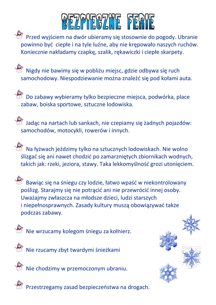 Przed wyjściem na dwór ubieramy się stosownie do pogody. Ubranie powinno byd ciepłe i na tyle luźne, aby nie krępowało naszych ruchów. Koniecznie nakładamy czapkę, szalik, rękawiczki i ciepłe skarpety. Nigdy nie bawimy się w pobliżu miejsc, gdzie odbywa się ruch samochodowy. Niespodziewanie można znaleźd się pod kołami auta. Do zabawy wybieramy tylko bezpieczne miejsca, podwórka, place zabaw, boiska sportowe, sztuczne lodowiska. Jadąc na nartach lub sankach, nie czepiamy się żadnych pojazdów: samochodów, motocykli, rowerów i innych. Na łyżwach jeździmy tylko na sztucznych lodowiskach. Nie wolno ślizgad się ani nawet chodzid po zamarzniętych zbiornikach wodnych, takich jak: rzeki, jeziora, stawy. Taka lekkomyślnośd grozi utonięciem. Bawiąc się na śniegu czy lodzie, łatwo wpaśd w niekontrolowany poślizg. Starajmy się nie potrącid ani nie przewrócid innej osoby. Uważajmy zwłaszcza na młodsze dzieci, ludzi starszych i niepełnosprawnych. Zasady kultury muszą obowiązywad także podczas zabawy. Nie wrzucamy kolegom śniegu za kołnierz. Nie rzucamy zbyt twardymi śnieżkami Nie chodzimy w przemoczonym ubraniu. Przestrzegamy zasad bezpieczeostwa na drogach.