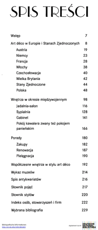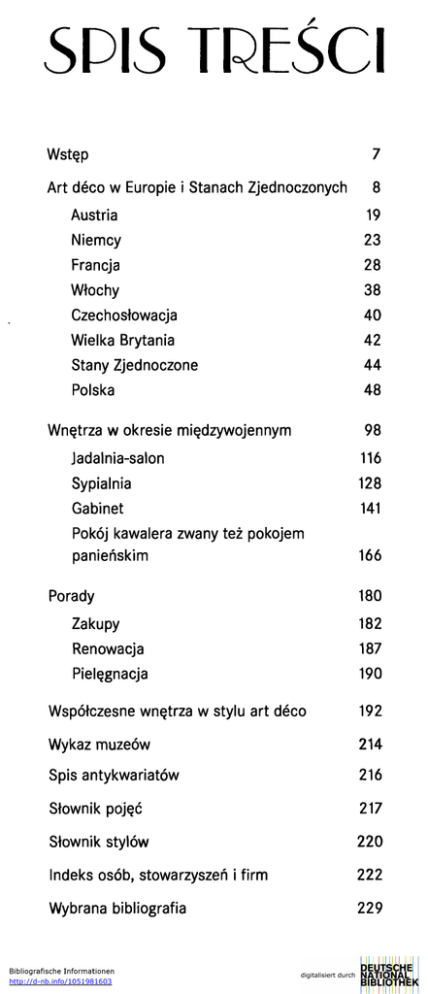 SPIS TREŚCI Wstęp 7 Art deco w Europie i Stanach Zjednoczonych 8 Austria 19 Niemcy 23 Francja 28 Włochy 38 Czechosłowacja 40 Wielka Brytania 42 Stany Zjednoczone 44 Polska 48 Wnętrza w okresie międzywojennym 98 Jadalnia-salon 116 Sypialnia 128 Gabinet 141 Pokój kawalera zwany też pokojem panieńskim Porady 166 180 Zakupy 182 Renowacja 187 Pielęgnacja 190 Współczesne wnętrza w stylu art deco 192 Wykaz muzeów 214 Spis antykwariatów 216 Słownik pojęć 217 Słownik stylów 220 Indeks osób, stowarzyszeń i firm 222 Wybrana bibliografia 229 http://d-nb.info/1051981603