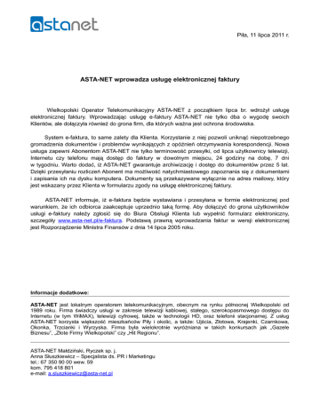 Piła, 11 lipca 2011 r. ASTA-NET wprowadza usługę elektronicznej faktury Wielkopolski Operator Telekomunikacyjny ASTA-NET z początkiem lipca br. wdrożył usługę elektronicznej faktury. Wprowadzając usługę e-faktury ASTA-NET nie tylko dba o wygodę swoich Klientów, ale dołączyła również do grona firm, dla których ważna jest ochrona środowiska. System e-faktura, to same zalety dla Klienta. Korzystanie z niej pozwoli uniknąć niepotrzebnego gromadzenia dokumentów i problemów wynikających z opóźnień otrzymywania korespondencji. Nowa usługa zapewni Abonentom ASTA-NET nie tylko terminowość przesyłki, od lipca użytkownicy telewizji, Internetu czy telefonu mają dostęp do faktury w dowolnym miejscu, 24 godziny na dobę, 7 dni w tygodniu. Warto dodać, iż ASTA-NET gwarantuje archiwizację i dostęp do dokumentów przez 5 lat. Dzięki przesyłaniu rozliczeń Abonent ma możliwość natychmiastowego zapoznania się z dokumentami i zapisania ich na dysku komputera. Dokumenty są przekazywane wyłącznie na adres mailowy, który jest wskazany przez Klienta w formularzu zgody na usługę elektronicznej faktury. ASTA-NET informuje, iż e-faktura będzie wystawiana i przesyłana w formie elektronicznej pod warunkiem, że ich odbiorca zaakceptuje uprzednio taką formę. Aby dołączyć do grona użytkowników usługi e-faktury należy zgłosić się do Biura Obsługi Klienta lub wypełnić formularz elektroniczny, szczegóły www.asta-net.pl/e-faktura. Podstawą prawną wprowadzania faktur w wersji elektronicznej jest Rozporządzenie Ministra Finansów z dnia 14 lipca 2005 roku. Informacje dodatkowe: ASTA-NET jest lokalnym operatorem telekomunikacyjnym, obecnym na rynku północnej Wielkopolski od 1989 roku. Firma świadczy usługi w zakresie telewizji kablowej, stałego, szerokopasmowego dostępu do Internetu (w tym WiMAX), telewizji cyfrowej, także w technologii HD, oraz telefonii stacjonarnej. Z usług ASTA-NET korzysta większość mieszkańców Piły i okolic, a także: Ujścia, Złotowa, Krajenki, Czarnkowa, Okonka, Trzcianki i Wyrzyska. Firma była wielokrotnie wyróżniana w takich konkursach jak „Gazele Biznesu”, „Złote Firmy Wielkopolski” czy „Hit Regionu”. ASTA-NET Małdziński, Ryczek sp. j. Anna Słuszkiewicz – Specjalista ds. PR i Marketingu tel.: 67 350 90 00 wew. 59 kom. 795 418 801 e-mail: [email protected]