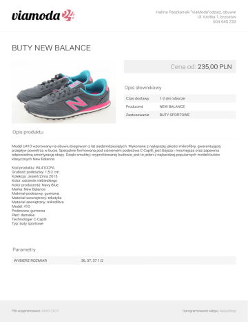 Halina Paszkaniak "ViaModa"odzież, obuwie Ul. Krótka 1, brzozów 604 645 233 BUTY NEW BALANCE Cena od: 235,00 PLN Opis słownikowy Czas dostawy 1-2 dni robocze Producent NEW BALANCE Zastosowanie BUTY SPORTOWE Opis produktu Model U410 wzorowany na obuwiu biegowym z lat siedemdziesiątych. Wykonane z najlepszej jakości mikrofibry, gwarantującej przepływ powietrza w bucie. Specjalnie formowana pod ciśnieniem podeszwa C-Cap®, jest lżejsza i mocniejsza oraz zapewnia odpowiednią amortyzację stopy. Dzięki smukłej i wyprofilowanej budowie, jest to jeden z najbardziej popularnych modeli butów klasycznych New Balance. Kod produktu: WL410CPA Grubość podeszwy: 1,5-2 cm Kolekcja: Jesień/Zima 2015 Kolor: odcienie niebieskiego Kolor producenta: Navy Blue Marka: New Balance Materiał podeszwy: gumowa Materiał wewnętrzny: tekstylia Materiał zewnętrzny: mikrofibra Model: 410 Podeszwa: gumowa Płeć: damskie Technologie: C-Cap® Typ: buty sportowe Parametry WYBIERZ ROZMIAR Plik wygenerowano: 04-03-2017 36, 37, 37 1/2 Oprogramowanie sklepu: AptusShop Halina Paszkaniak "ViaModa"odzież, obuwie Ul. Krótka 1, brzozów 604 645 233 Warianty produktu BUTY NEW BALANCE 235,00 PLN BUTY NEW BALANCE WL410CPA Galeria Plik wygenerowano: 04-03-2017 Powered by TCPDF (www.tcpdf.org) Oprogramowanie sklepu: AptusShop