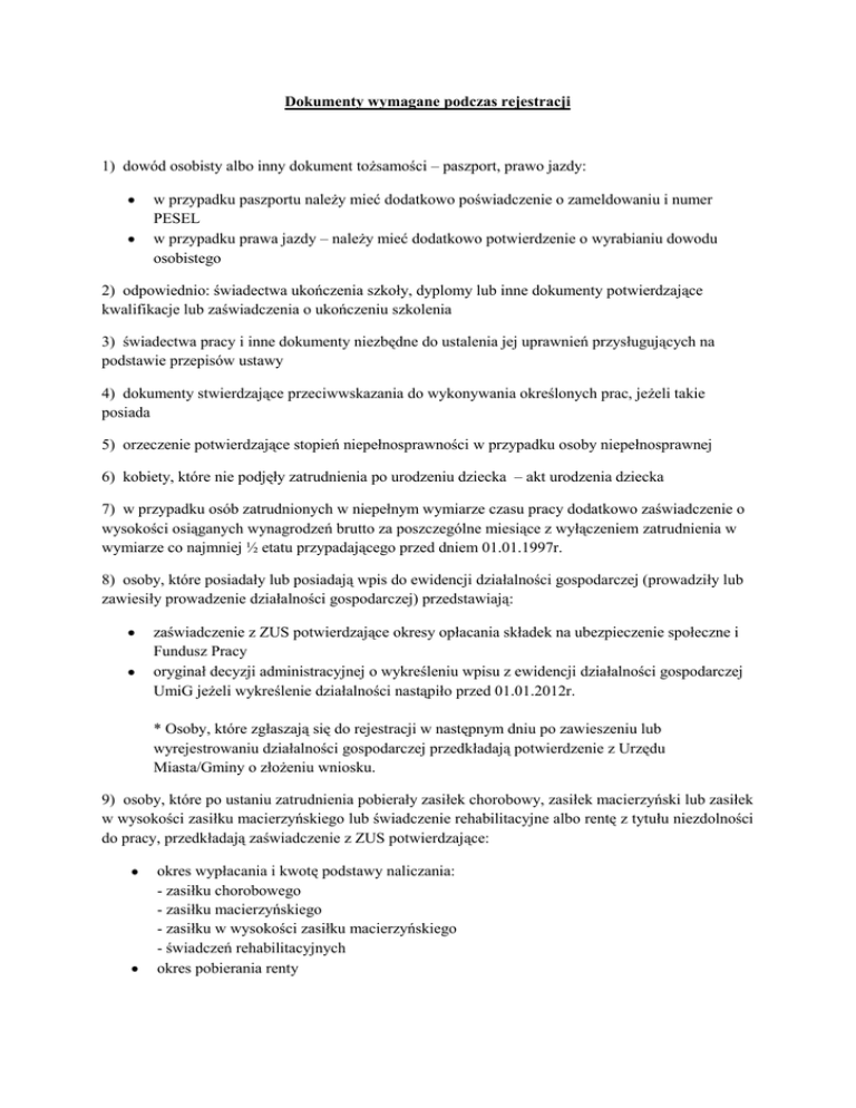 Dokumenty wymagane podczas rejestracji 1) dowód osobisty albo inny dokument tożsamości – paszport, prawo jazdy: w przypadku paszportu należy mieć dodatkowo poświadczenie o zameldowaniu i numer PESEL w przypadku prawa jazdy – należy mieć dodatkowo potwierdzenie o wyrabianiu dowodu osobistego 2) odpowiednio: świadectwa ukończenia szkoły, dyplomy lub inne dokumenty potwierdzające kwalifikacje lub zaświadczenia o ukończeniu szkolenia 3) świadectwa pracy i inne dokumenty niezbędne do ustalenia jej uprawnień przysługujących na podstawie przepisów ustawy 4) dokumenty stwierdzające przeciwwskazania do wykonywania określonych prac, jeżeli takie posiada 5) orzeczenie potwierdzające stopień niepełnosprawności w przypadku osoby niepełnosprawnej 6) kobiety, które nie podjęły zatrudnienia po urodzeniu dziecka – akt urodzenia dziecka 7) w przypadku osób zatrudnionych w niepełnym wymiarze czasu pracy dodatkowo zaświadczenie o wysokości osiąganych wynagrodzeń brutto za poszczególne miesiące z wyłączeniem zatrudnienia w wymiarze co najmniej ½ etatu przypadającego przed dniem 01.01.1997r. 8) osoby, które posiadały lub posiadają wpis do ewidencji działalności gospodarczej (prowadziły lub zawiesiły prowadzenie działalności gospodarczej) przedstawiają: zaświadczenie z ZUS potwierdzające okresy opłacania składek na ubezpieczenie społeczne i Fundusz Pracy oryginał decyzji administracyjnej o wykreśleniu wpisu z ewidencji działalności gospodarczej UmiG jeżeli wykreślenie działalności nastąpiło przed 01.01.2012r. * Osoby, które zgłaszają się do rejestracji w następnym dniu po zawieszeniu lub wyrejestrowaniu działalności gospodarczej przedkładają potwierdzenie z Urzędu Miasta/Gminy o złożeniu wniosku. 9) osoby, które po ustaniu zatrudnienia pobierały zasiłek chorobowy, zasiłek macierzyński lub zasiłek w wysokości zasiłku macierzyńskiego lub świadczenie rehabilitacyjne albo rentę z tytułu niezdolności do pracy, przedkładają zaświadczenie z ZUS potwierdzające: okres wypłacania i kwotę podstawy naliczania: - zasiłku chorobowego - zasiłku macierzyńskiego - zasiłku w wysokości zasiłku macierzyńskiego - świadczeń rehabilitacyjnych okres pobierania renty 10) osoby, które były zatrudnione w ramach umowy- zlecenie, przedstawiają zaświadczenie potwierdzające okres wykonywania pracy oraz: informację od zleceniodawcy o wysokości podstawy wymiaru składek na ubezpieczenie społeczne i Fundusz Pracy za każdy miesiąc osobno rachunek do umowy – zlecenia albo druki ZUS RMUA z dodatkową informacją od zleceniodawcy o składkach na Fundusz Pracy 11) osoby, które wykonywały pracę w ramach umowy o dzieło przedstawiają umowy lub zaświadczenie potwierdzające okres wykonywania dzieła 12) osoby uprawnione do pobierania renty rodzinnej przedkładają decyzję ZUS o jej przyznaniu z aktualną wysokością renty 13) osoby zwolnione z zakładów karnych, aresztów śledczych przedstawiają: świadectwo zwolnienia z zakładu karnego lub aresztu śledczego zaświadczenie o wykonywaniu pracy w trakcie odbywania kary pozbawienia wolności z wysokością uzyskanych dochodów za każdy miesiąc pracy postanowienie sądu o odbywaniu kary pozbawienia wolności w formie dozoru elektronicznego