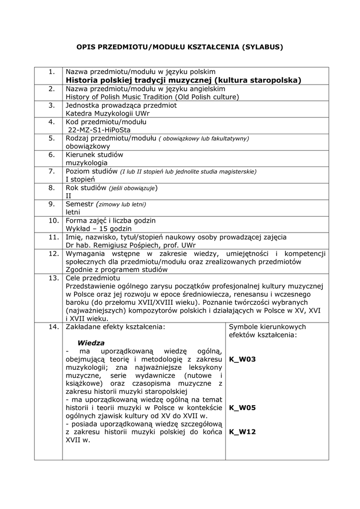 OPIS PRZEDMIOTU/MODUŁU KSZTAŁCENIA (SYLABUS) 1. Nazwa przedmiotu/modułu w języku polskim Historia polskiej tradycji muzycznej (kultura staropolska) 2. 3. 4. 5. 6. 7. 8. 9. 10. 11. 12. 13. 14. Nazwa przedmiotu/modułu w języku angielskim History of Polish Music Tradition (Old Polish culture) Jednostka prowadząca przedmiot Katedra Muzykologii UWr Kod przedmiotu/modułu 22-MZ-S1-HiPoSta Rodzaj przedmiotu/modułu ( obowiązkowy lub fakultatywny) obowiązkowy Kierunek studiów muzykologia Poziom studiów (I lub II stopień lub jednolite studia magisterskie) I stopień Rok studiów (jeśli obowiązuje) II Semestr (zimowy lub letni) letni Forma zajęć i liczba godzin Wykład – 15 godzin Imię, nazwisko, tytuł/stopień naukowy osoby prowadzącej zajęcia Dr hab. Remigiusz Pośpiech, prof. UWr Wymagania wstępne w zakresie wiedzy, umiejętności i kompetencji społecznych dla przedmiotu/modułu oraz zrealizowanych przedmiotów Zgodnie z programem studiów Cele przedmiotu Przedstawienie ogólnego zarysu początków profesjonalnej kultury muzycznej w Polsce oraz jej rozwoju w epoce średniowiecza, renesansu i wczesnego baroku (do przełomu XVII/XVIII wieku). Poznanie twórczości wybranych (najważniejszych) kompozytorów polskich i działających w Polsce w XV, XVI i XVII wieku. Zakładane efekty kształcenia: Symbole kierunkowych efektów kształcenia: Wiedza ma uporządkowaną wiedzę ogólną, obejmującą teorię i metodologię z zakresu K_W03 muzykologii; zna najważniejsze leksykony muzyczne, serie wydawnicze (nutowe i książkowe) oraz czasopisma muzyczne z zakresu historii muzyki staropolskiej - ma uporządkowaną wiedzę ogólną na temat historii i teorii muzyki w Polsce w kontekście K_W05 ogólnych zjawisk kultury od XV do XVII w. - posiada uporządkowaną wiedzę szczegółową z zakresu historii muzyki polskiej do końca K_W12 XVII w. Umiejętności - potrafi wyszukiwać, analizować, oceniać i selekcjonować wiedzę zaczerpniętą z literatury K_U02 przedmiotowej (książki, artykuły, leksykony, Internet, bazy danych), także przy użyciu nowoczesnych technologii (ICT) - posiada umiejętność charakteryzowania muzyki oraz stylów i gatunków muzycznych K_U07 charakterystycznych dla muzyki staropolskiej; orientuje się w twórczości najważniejszych kompozytorów polskich od XV do XVII w. - potrafi używać języka specjalistycznego i porozumiewać się w sposób precyzyjny i K_U14 spójny przy użyciu różnych kanałów i technik komunikacyjnych ze specjalistami w zakresie muzykologii, jak i z odbiorcami spoza grona specjalistów, w języku polskim i obcym Kompetencje społeczne - ma świadomość poziomu swojej wiedzy i umiejętności, rozumie potrzebę ciągłego K_K01 zdobywania wiedzy, dokształcania się zawodowego i zdobywania umiejętności potrafi odpowiednio określić priorytety służące realizacji określonego przez siebie lub K_K03 innych zadania związanego z badaniami muzykologicznymi - ma świadomość odpowiedzialności za zachowanie polskiego dziedzictwa K_K05 muzycznego ze szczególnym uwzględnieniem muzyki regionu Śląska 15. Treści programowe: 1) Kultura staropolska – pojęcie, zakres czasowy, problematyka, źródła i edycje. 2) Średniowieczna monodia liturgiczna diecezjalna i zakonna w Polsce i na Śląsku. 3) Początki i rozwój polskiej pieśni kościelnej. 4) Muzyka wielogłosowa w Polsce i na Śląsku do końca XV w. (klasztor w Starym Sączu, klasztor w Żaganiu, Mikołaj z Radomia, Piotr z Grudziądza). 5) Pieśń wielogłosowa w Polsce XVI w. (przedstawiciele, repertuar religijny i świecki). 6) Msza i motet w Polsce i na Śląsku w okresie renesansu (przedstawiciele, ośrodki). 7) Znaczenie twórczości M. Zieleńskiego jako przedstawiciela okresu przejściowego pomiędzy renesansem a barokiem. 8) Kapele kościelne i dworskie jako ośrodki rozwoju kultury muzycznej w Polsce i na Śląsku. 9) Muzyka religijna w XVII-wiecznej Polsce w stile antico (pieśń wielogłosowa, motety i hymny). 10) Styl koncertujący w polskiej muzyce religijnej XVII i XVIII w. 11) 12) 13) 14) Polska twórczość dramatyczna XVII i XVIII stulecia. Muzyka instrumentalna polskiego baroku. Życie i twórczość M. Mielczewskiego oraz B. Pękiela. Twórczość W. Leszczyńskiego, S.S. Szarzyńskiego, J. Różyckiego i D. Stachowicza. 15) Życie i twórczość G.G. Gorczyckiego. 16. Zalecana literatura (podręczniki) Literatura obowiązkowa: - Feicht H., Studia nad muzyką polskiego średniowiecza, Kraków 1975. - Feicht H., Studia nad muzyką polskiego renesansu i baroku, Kraków 1980. Literatura zalecana: - Morawski J., Średniowiecze, cz. 1: do roku 1320 (seria: Historia muzyki polskiej, t. I/1), Warszawa 2006; - Morawska K., Średniowiecze, cz. 2: 1320-1500 (seria: Historia muzyki polskiej, t. I/2), Warszawa 1998; - Morawska K., Renesans 1500-1600 (seria: Historia muzyki polskiej, t. II), Warszawa 1994; - Przybyszewska-Jarmińska B., Barok, część pierwsza 1595-1696 (seria: Historia muzyki polskiej, t. III), Warszawa 2006. Literatura uzupełniająca: - Brzezińska Barbara, Repertuar polskich tabulatur organowych z pierwszej połowy XVI wieku, Kraków 1987; - Chomiński J., Chomińska-Wilkowska K., Historia muzyki polskiej cz. I, Kraków 1995; - Dąbek S., Wielogłosowy repertuar kancjonałów staniąteckich (XVI-XVIII w.), Lublin 1997. - Gancarczyk Paweł, Musica scripts. Kodeksy menzuralne II połowy XV wieku na wschodzie Europy Łacińskiej, Warszawa 2001; - Głuszcz-Zwolińska Elżbieta, Muzyka nadworna ostatnich Jagiellonów, Kraków 1988; - Guzy-Pasiakowa J., Leszczyńska A., Perz M., (red.), Staropolszczyzna muzyczna, Warszawa 1998. - Jasiński T., Polska barokowa retoryka muzyczna, Lublin 2006; - Jochymczyk M., Pietas & musica. Damian Stachowicz SchP. Życie i twórczość w kontekście epoki, Kraków 2009; - Kubieniec Jakub, Uniwersalizm i swoistość w średniowiecznych antyfonarzach krakowskich, Kraków 2006; - Krzyżaniak B., Kantyczki z rękop