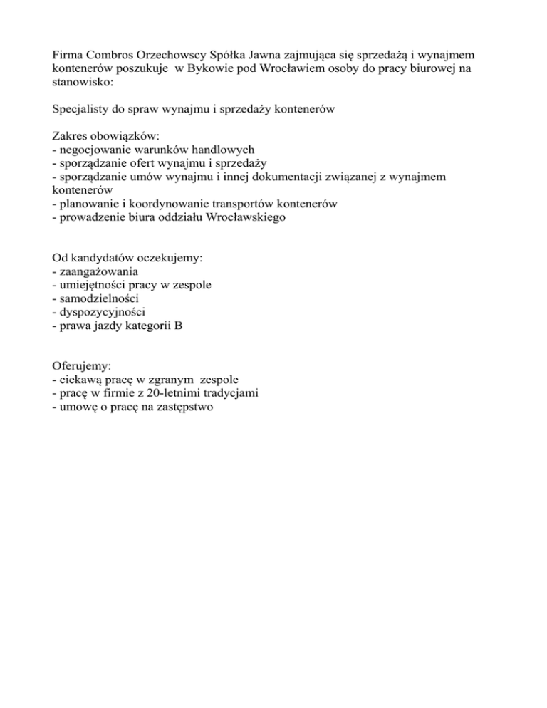 Firma Combros Orzechowscy Spółka Jawna zajmująca się sprzedażą i wynajmem kontenerów poszukuje w Bykowie pod Wrocławiem osoby do pracy biurowej na stanowisko: Specjalisty do spraw wynajmu i sprzedaży kontenerów Zakres obowiązków: - negocjowanie warunków handlowych - sporządzanie ofert wynajmu i sprzedaży - sporządzanie umów wynajmu i innej dokumentacji związanej z wynajmem kontenerów - planowanie i koordynowanie transportów kontenerów - prowadzenie biura oddziału Wrocławskiego Od kandydatów oczekujemy: - zaangażowania - umiejętności pracy w zespole - samodzielności - dyspozycyjności - prawa jazdy kategorii B Oferujemy: - ciekawą pracę w zgranym zespole - pracę w firmie z 20-letnimi tradycjami - umowę o pracę na zastępstwo