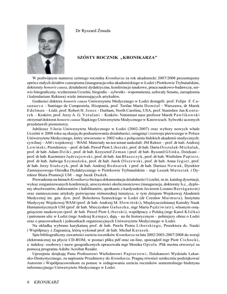 Dr Ryszard Żmuda SZÓSTY ROCZNIK „KRONIKARZA” W podwójnym numerze szóstego rocznika Kronikarza za rok akademicki 2007/2008 prezentujemy oprócz stałych działów czasopisma (inauguracja roku akademickiego w Łodzi i Piotrkowie Trybunalskim, doktoraty honoris causa, działalność dydaktyczna, konferencje naukowe, praca naukowo-badawcza, serwis fotograficzny, wydarzenia Uczelni, biografie – sylwetki - wspomnienia, uchwały Senatu, zarządzenia i kalendarium Rektora) wiele interesujących artykułów. Godności doktora honoris causa Uniwersytetu Medycznego w Łodzi dostąpili: prof. Felipe F. C asanueva - Santiago de Compostela, Hiszpania, prof. Teofan Maria D o m ż a ł - Warszawa, dr Marek Edelman – Łódź, prof. Robert H. Jones - Durham, North Carolina, USA, prof. Stanisław Jan K o n t u rek – Kraków, prof. Jerzy A. G. Vetulan i – Kraków. Natomiast nasz profesor Marek P a w l i k o w s k i otrzymał doktorat honoris causa Śląskiego Uniwersytetu Medycznego w Katowicach. Sylwetki uczonych przedstawili promotorzy. Jubileusz 5-lecia Uniwersytetu Medycznego w Łodzi (2002-2007) oraz wybory nowych władz Uczelni w 2008 roku są okazją do podsumowania działalności, osiągnięć i rozwoju pierwszego w Polsce Uniwersytetu Medycznego, który utworzono w 2002 roku z połączenia łódzkich akademii medycznych: cywilnej – AM i wojskowej – WAM. Materiały na ten temat nadesłali: JM Rektor – prof. dr hab. Andrzej Lewiński, Prorektorzy – prof. dr hab. Paweł Piotr Liberski, prof. dr hab. Daria Orszulak-Michalak, prof. dr hab. Adam D z i k i , prof. dr hab. Krzysztof Z e m a n i prof. dr hab. Ryszard G l i n k a , Dziekani – prof. dr hab. Kazimierz Jędrzejewski, prof. dr hab. Jan Błaszczyk, prof. dr hab. Wielisław Papierz, prof. dr hab. Jadwiga Szymańska, prof. dr hab. Jurek O l s z e w s k i , prof. dr hab. Anna J e g i e r , prof. dr hab. Jerzy Stańczyk, prof. dr hab. Andrzej B e d n a r e k i prof. dr hab. Dariusz N o w a k , Dyrektor Zamiejscowego Ośrodka Dydaktycznego w Piotrkowie Trybunalskim – mgr Leszek M a t u s i a k i Dyrektor Biura Promocji UM – mgr Jacek Du d e k . Prowadzona na łamach Kronikarza bieżąca dokumentacja działalności Uczelni, m.in. katalog dysertacji, wykaz zorganizowanych konferencji, uroczystości okolicznościowe (inauguracja, doktoraty h.c., dyplomy absolwentów, doktorantów i habilitantów, spotkanie z kardynałem Javierem Lozano B a r r á g a n e m ) oraz zamieszczone artykuły poświęcone różnorodnej tematyce, w tym dziejom Wojskowej Akademii Medycznej im. gen. dyw. prof. Bolesława Szareckiego w Łodzi (dr Czesław M a r m u r a ), Instytutu Medycyny Wojskowej WAM (prof. dr hab. Andrzej M. S ł o w i ń s k i ), Międzyuczelnianej Katedry Nauk Humanistycznych UM (prof. dr hab. Mieczysław G a ł u s z k a , mgr Maria P ę d z i w i a t r ), własnym osiągnięciom naukowym (prof. dr hab. Paweł Piotr L i b e r s k i ), współpracy z Polską (mgr Karol K l i č k a ) i patronom ulic w Łodzi (mgr Andrzej Ke m p a ), dają – na tle historycznym – pełniejszy obraz o Łodzi oraz o pracownikach i jednostkach organizacyjnych Uniwersytetu Medycznego w Łodzi. Na okładkę wybrano karykaturę prof. dr hab. Pawła Piotra L i b e r s k i e g o , Prorektora ds. Nauki i Współpracy z Zagranicą, którą wykonał prof. dr hab. Michał Ka r a s e k . Spis bibliograficzny zawartości sześciu roczników Kronikarza za lata 2002/2003-2007/2008 do wersji elektronicznej na płycie CD-ROM, w postaci pliku pdf oraz on-line, sporządził mgr Piotr C i ch o ck i , a indeksy: osobowy i nazw geograficznych opracowała mgr Monika O p i o ł a . Plik można otworzyć za pomocą programu Adobe Acrobat Reader. Uprzejmie dziękuję Panu Profesorowi Wielisławowi P a p i e r z o w i , Dziekanowi Wydziału Lekarsko-Dentystycznego, za napisanie Przedmowy do Kronikarza. Pragnę również serdecznie podziękować Autorom i Współpracownikom za pomoc w redagowaniu sześciu roczników semestralnego biuletynu informacyjnego Uniwersytetu Medycznego w Łodzi. 6 KRONIKARZ