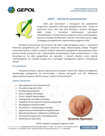 QGIS – szkolenie podstawowe QGIS jest darmowym i intuicyjnym dla użytkownika programem Systemów Informacji Geograficznej (GIS). Działa na systemach Linux, Unix, Mac OSX, Windows i Android. Obsługuje wiele funkcji i formatów: wektorowych, rastrowych i bazodanowych. Funkcjonalność programu można rozbudowywać, poprzez instalację dodatkowych wtyczek, tworzonych przez ciągle rozwijającą się społeczność użytkowników programu QGIS. Szkolenie przeznaczone jest zarówno dla osób rozpoczynających pracę z systemami informacji geograficznej jak i chcących poszerzyć swoją dotychczasową wiedzę. Program został opracowany z myślą o osobach chcących opanować posługiwanie się programem QGIS, poznać zasady rysowania map i wykonywania podstawowych analiz przestrzennych. Z map korzystają już nie tylko geografowie, ale specjaliści z różnych dziedzin, coraz częściej marketingowiec czy urzędnik spotyka się z wymogiem wzbogacenia raportu o wizualizację danych. Cel szkolenia: Pozyskanie wiedzy z zakresu wykorzystania narzędzi i metod GIS. Nabycie umiejętności świadomego posługiwania się terminologią z zakresu kartografii oraz GIS. Efektywne wykorzystanie programu QGIS do pracy z danymi przestrzennymi. Zakres szkolenia: Wprowadzenie do środowiska GIS Poznanie programu QGIS Konfiguracja programu Praca z plikami rastrowymi Praca z plikami wektorowymi Posługiwanie się tabelą atrybutów Zapytania do baz danych za pomocą języka SQL Wczytywanie serwerów WMS Korzystanie z narzędzi geoprocesingu Zapoznanie ze standardami kartograficznymi Wizualizacja danych, nadawanie symbolizacji Tworzenie kartogramów i kartodiagramów Generowanie wydruków GEPOL wspiera inicjatywę programu QGIS