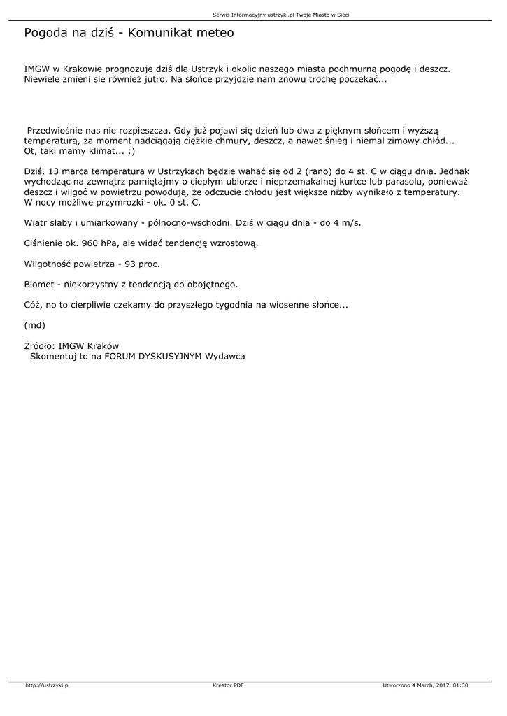 Serwis Informacyjny ustrzyki.pl Twoje Miasto w Sieci Pogoda na dziś - Komunikat meteo IMGW w Krakowie prognozuje dziś dla Ustrzyk i okolic naszego miasta pochmurną pogodę i deszcz. Niewiele zmieni sie również jutro. Na słońce przyjdzie nam znowu trochę poczekać... Przedwiośnie nas nie rozpieszcza. Gdy już pojawi się dzień lub dwa z pięknym słońcem i wyższą temperaturą, za moment nadciągają ciężkie chmury, deszcz, a nawet śnieg i niemal zimowy chłód... Ot, taki mamy klimat... ;) Dziś, 13 marca temperatura w Ustrzykach będzie wahać się od 2 (rano) do 4 st. C w ciągu dnia. Jednak wychodząc na zewnątrz pamiętajmy o ciepłym ubiorze i nieprzemakalnej kurtce lub parasolu, ponieważ deszcz i wilgoć w powietrzu powodują, że odczucie chłodu jest większe niżby wynikało z temperatury. W nocy możliwe przymrozki - ok. 0 st. C. Wiatr słaby i umiarkowany - północno-wschodni. Dziś w ciągu dnia - do 4 m/s. Ciśnienie ok. 960 hPa, ale widać tendencję wzrostową. Wilgotność powietrza - 93 proc. Biomet - niekorzystny z tendencją do obojętnego. Cóż, no to cierpliwie czekamy do przyszłego tygodnia na wiosenne słońce... (md) Źródło: IMGW Kraków Skomentuj to na FORUM DYSKUSYJNYM Wydawca http://ustrzyki.pl Kreator PDF Utworzono 4 March, 2017, 01:30 Serwis Informacyjny ustrzyki.pl Twoje Miasto w Sieci portalu ustrzyki.pl nie ponosi odpowiedzialności za treść komentarzy http://ustrzyki.pl Kreator PDF Utworzono 4 March, 2017, 01:30 Serwis Informacyjny ustrzyki.pl Twoje Miasto w Sieci zamieszczanych przez użytkowników. Osoby zamieszczające wypowiedzi naruszające prawo lub http://ustrzyki.pl Kreator PDF Utworzono 4 March, 2017, 01:30 Serwis Informacyjny ustrzyki.pl Twoje Miasto w Sieci prawem chronione dobra osób trzecich mogą ponieść z tego tytułu odpowiedzialność http://ustrzyki.pl Kreator PDF Utworzono 4 March, 2017, 01:30 Serwis Informacyjny ustrzyki.pl Twoje Miasto w Sieci karną lub cywilną. http://ustrzyki.pl Kreator PDF Utworzono 4 March, 2017, 01:30