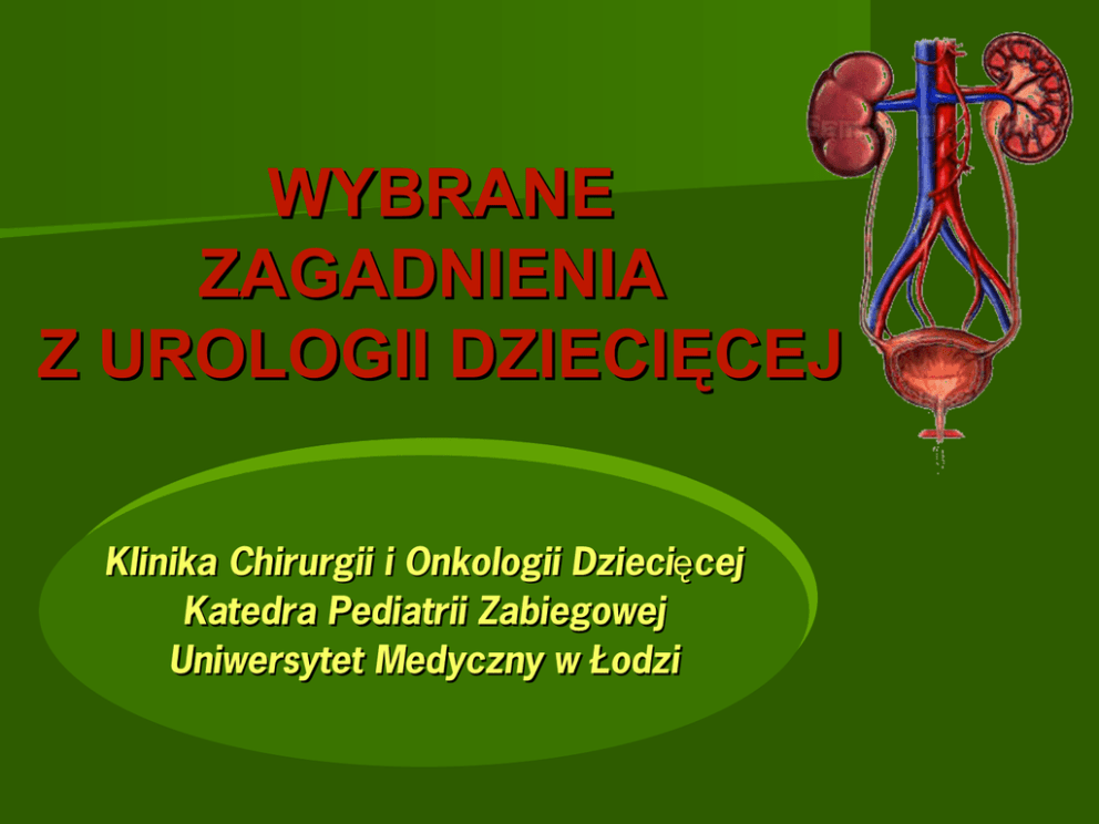 WYBRANE ZAGADNIENIA Z UROLOGII DZIECIĘCEJ Klinika Chirurgii i Onkologii Dziecięcej Katedra Pediatrii Zabiegowej Uniwersytet Medyczny w Łodzi Embriologia układu moczowego pochodzenie – mezoderma pośrodkowa Przednercze zanika pod koniec 4 tyg życia Śródnercze Embriologia układu moczowego Nerka ostateczna powstaje w 5 tyg życia Wady układu moczowego ok.10% noworodków odpowiedzialne za ok.45% przypadków niewydolności nerek Wady rozwojowe nerek Obustronny brak nerki Agenesia renum bilateralis Zaburzenia liczby Jednostronny brak nerki Agenesia renis 1:1500 urodzonych towarzyszące wady narządów płciowych Nerka nadliczbowa Ren supranumerarius Jednostronny brak nerki Wady układu moczowego Wady rozwojowe nerek Niedorozwój nerki Hypoplasia renis leczenie w przypadku HA lub ZUM Zwyrodnienie wielotorbielowate nerki Ren polycysticus 1:4500 żywo urodzonych Zaburzenia wielkości i kształtu Autosomalna recesywna wielotorbielowatość nerek 1:10 000-40 000 żywo urodzonych nieuleczalna prowadzi do niewydolności nerek Autosomalna dominująca wielotorbielowatość nerek 1:400-1000 żywo urodzonych biorcy przeszczepów nerek Autosomalna dominująca wielotorbielowatość nerek Wady układu moczowego Wady rozwojowe nerek Torbiel pojedyńcza nerki Cystis renis przezskórna punkcja z podaniem substancji obliterującej Zaburzenia wielkości i kształtu Wady układu moczowego Wady rozwojowe nerek Ektopia nerki Ren ectopicus 1:500-1200 10% obustronnie inne unaczynienie Zaburzenia położenia Wady układu moczowego Wady rozwojowe nerek Nerka podkowiasta Ren arcuatum 1:400 ♂:♀ 2:1 w 95% nerki leżą po przeciwnych i zrastają się biegunami dolnymi Zaburzenia położenia i kształtu stronach Nerka podkowiasta Wady układu moczowego Wodonercze Hydronephrosis polega na utrudnieniu odpływu moczu z miedniczki do moczowodu,prowadzące do poszerzenia układu kielichowomiedniczkowego nerki poszerzenie ukm nerki u 1:500 płodów w usg prenatalnym stanowi ok. 50% wszystkich wad układu moczowego u dzieci u dzieci do 15 roku życia częstość występowania 2% (80% w pierwszym roku życia) częściej dotyczy chłopców i nerki lewej Wady układu moczowego Wodonercze Przyczyny: Miedniczka nerkowa Połączenie miedniczkowomoczowodowe • wada wrodzona (zwężenie połączenia kielichowomiedniczkowego) • stan zapalny • kamienie • nowotwór (guz Wilmsa, neuroblastoma) • wada wrodzona stan zapalny • kamienie • stan zapalny • zmainy pourazowe • zrosty pooperacyjne • nowotwór Wady układu moczowego Wodonercze Przyczyny: Moczowód • upośledzona czynność perystaltyczna (zaburzenia rozwoju autonomicznego unerwienia) • przeszkodowy moczowód olbrzymi • ektopiczne ujście moczowodu • torbiel ujścia moczowodu • polipy • zastawki • kamienie • zrosty • ucisk z zewnątrz (nowotwór,stan zapalny,krwiak, zaciek moczu) Wady układu moczowego Wodonercze Przyczyny: Szyja pęcherza i cewka moczowa • zaburzenia neurogenne • zastawka cewki tylnej • uchyłek • zwężenie cewki (wrodzone, pourazowe, jatrogenne) • zwężenie ujścia zewnętrznego cewki • kamienie • ciało obce • stulejka • wady zatoki moczowo-płciowej Wady układu moczowego Wodonercze Uropatia zaporowa całokształt zmian morfologicznych i czynnościowych w układzie moczowym, spowodowanych zastojem moczu w miedniczce nerkowej,w wyniku całkowitej lub częściowej, jednostronnej lub obustronnej niedrożności dróg wyprowadzających mocz Wady układu moczowego Uropatia zaporowa zaburzenia krążenia wewnątrznerkowego (m.in. znaczne pobudzenie układu renina-angiotensyna) reakcje immunologiczne Uszkodzenie komórek Naciek zapalny z limfocytów i makrofagów Wzmożona synteza cytokin (TGF-ß1, PDGF, FGF) włóknienie apoptoza komórkowa Wydzielanie czynników prozapalnych (TNF-α, IL-1ß, INF, LPS) Wydzielanie chemokin (CCL2/MCP-1, CCL5/RANTES) Wady układu moczowego Wodonercze Objawy kliniczne: • guz brzucha u noworodków • infekcje układu moczowego • ból • krwiomocz • nadciśnienie tętnicze Wady układu moczowego Wodonercze Diagnostyka • Badanie ultrasonograficzne nerek • Renoscyntygrafia Wady układu moczowego Wodonercze Diagnostyka • urografia dożylna Wady układu moczowego Wodonercze Diagnostyka • cystografia mikcyjna (wykluczenie odpływów pęcherzowo-moczowodowych • tomografia komputerowa • rezonans magnetyczny Wady układu moczowego Wodonercze Leczenie operacyjne - wskazania • cechy uszkodzenia miąższu nerek w badaniu renoscyntygraficznym • poszerzenie wymiaru AP miedniczki nerkowej > 20 mm • kamica nerkowa • nawracające infekcje dróg moczowych • nadciśnienie tętnicze Leczenie operacyjne Plastyka połączenia miedniczkowomoczowodowego met.Hynes-Andersona Wady układu moczowego Wady moczowodu Moczowód podwójny i rozdwojony Ureter duplex et bifidus wczesne rozdzielenie pęczka moczowodowego może doprowadzić do całkowitego lub częściowego podwojenia moczowodu Moczowód podwójny Moczowód podwójny Ureter duplex wykształcenie 2 pęczków moczowodowych: jeden zajmuje położenie prawidłowe drugi przemieszcza się ku dołowi dlatego ma nieprawidłowo niskie ujście do pęcherza moczowego pochwy, cewki moczowej lub okolicy najądrza Torbielowate rozszerzenie pęcherzowego ujścia moczowodu Ureterocele wczesnopłodowa przeszkoda w odpływie moczu powstała w ujściu pęcherzowym moczowodu w postaci torbieli proste (u 90% chorych dotyczy moczowodu pojedyńczego) ektopowe Torbielowate rozszerzenie pęcherzowego ujścia moczowodu Diagnostyka: USG urografia/scyntygrafia informująca o stopniu uszkodzenia czynności górnego segmentu cystografia mikcyjna cystoskopia Leczenie: cystoskopowe nacięcie torbieli (doraźnie) heminephrectomia usunięcie operacyjne torbieli i przeszczepienie moczowodu Wady układu moczowego Wady moczowodu Moczowody olbrzymie Megaureter poszerzenie średnicy moczowodu powyżej 5 mm poszerzenie > 10 mm i obniżona funkcja nerki 