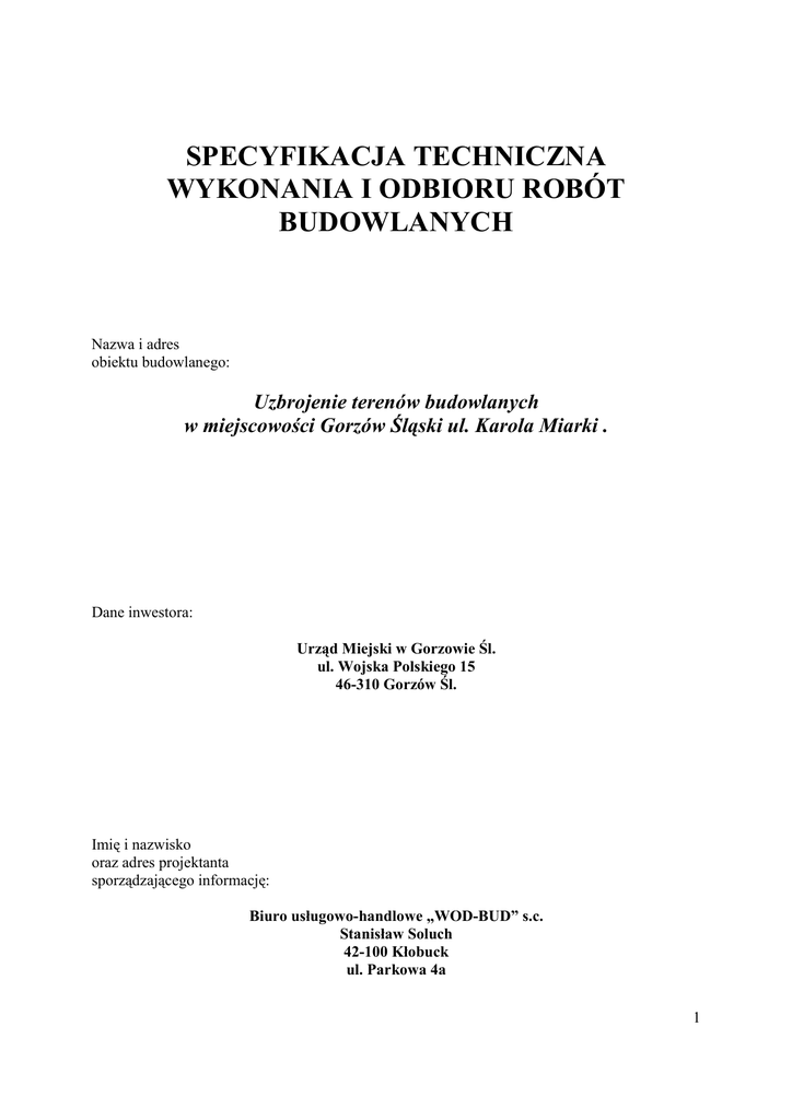 SPECYFIKACJA TECHNICZNA WYKONANIA I ODBIORU ROBÓT BUDOWLANYCH Nazwa i adres obiektu budowlanego: Uzbrojenie terenów budowlanych w miejscowości Gorzów Śląski ul. Karola Miarki . Dane inwestora: Urząd Miejski w Gorzowie Śl. ul. Wojska Polskiego 15 46-310 Gorzów Śl. Imię i nazwisko oraz adres projektanta sporządzającego informację: Biuro usługowo-handlowe „WOD-BUD” s.c. Stanisław Soluch 42-100 Kłobuck ul. Parkowa 4a 1 SIEĆ KANALIZACJI ŚCIEKOWEJ, KANALIZACJI DESZCZOWEJ I SIECI WODOCIĄGOWEJ 1. Wstęp 1.1. Przedmiot Specyfikacji Technicznej (ST) Przedmiotem niniejszej ogólnej specyfikacji technicznej (ST) są wymagania dotyczące wykonania i odbioru robót związanych z budową kanalizacji ściekowej, deszczowej i sieci wodociągowej. 1.2. Zakres robót objętych ST Ustalenia zawarte w niniejszej specyfikacji dotyczą zasad prowadzenia robót związanych z wykonaniem kanalizacji ściekowej, deszczowej i sieci wodociągowej. W zakres tych robót wchodzą: - roboty przygotowawcze, - roboty montaŜowe sieciowe, - budowa obiektów na sieci (studnie, hydrant), - kontrola jakości. 1.3. Określenia podstawowe Określenia podstawowe są zgodne z obowiązującymi, odpowiednimi polskimi normami i z definicjami. Wymagania ogólne. 1.3.1 Kanalizacja ściekowa – sieć kanalizacyjna zewnętrzna przeznaczona do odprowadzania ścieków. 1.3.1.1 Kanały Kanał - liniowa budowla przeznaczona do grawitacyjnego odprowadzania ścieków. Przykanalik - kanał przeznaczony do połączenia studzienki kanalizacyjnej z siecią kanalizacji ściekowej. 2 Kanał zbiorczy - kanał przeznaczony do zbierania ścieków z co najmniej dwóch kanałów bocznych. Kolektor główny - kanał przeznaczony do zbierania ścieków z kanałów oraz kanałów zbiorczych. 1.3.1.2 Urządzenia (elementy) uzbrojenia sieci Studzienka kanalizacyjna - studzienka rewizyjna przeznaczona do kontroli i prawidłowej eksploatacji kanałów. Studzienka przelotowa - studzienka kanalizacyjna zlokalizowana na załamaniach osi kanału w planie, na załamaniach spadku kanału oraz na odcinkach prostych. Studzienka połączeniowa - studzienka kanalizacyjna przeznaczona do łączenia co najmniej dwóch kanałów dopływowych w jeden kanał odpływowy. Studzienka kaskadowa (spadowa) - studzienka kanalizacyjna mająca dodatkowy przewód pionowy umoŜliwiający wytrącenie nadmiaru energii ścieków, spływających z wyŜej połoŜonego kanału dopływowego do niŜej połoŜonego kanału odpływowego. 1.3.1.3 Elementy studzienek i komór Płyta przykrycia studzienki - płyta przykrywająca komorę roboczą. Właz kanałowy - element Ŝeliwny przeznaczony do przykrycia podziemnych studzienek rewizyjnych, umoŜliwiający dostęp do urządzeń kanalizacyjnych. Kineta - wyprofilowany rowek w dnie studzienki, przeznaczony do przepływu w nim ścieków. 1.3.2 Kanalizacja deszczowa – sieć kanalizacyjna zewnętrzna przeznaczona do odprowadzania ścieków opadowych. 1.3.2.1. Kanały Kanał - liniowa budowla przeznaczona do grawitacyjnego odprowadzania ścieków. Kanał deszczowy - kanał przeznaczony do odprowadzania ścieków opadowych. Przykanalik - kanał przeznaczony do połączenia wpustu deszczowego lub rury spustowej z siecią kanalizacji deszczowej. Kanał zbiorczy - kanał przeznaczony do zbierania ścieków z co najmniej dwóch kanałów bocznych. 3 Kolektor główny - kanał przeznaczony do zbierania ścieków z kanałów oraz kanałów zbiorczych i odprowadzenia ich do odbiornika. 1.3.2.2 Urządzenia (elementy) uzbrojenia sieci Studzienka kanalizacyjna - studzienka rewizyjna przeznaczona do kontroli i prawidłowej eksploatacji kanałów. Studzienka przelotowa - studzienka kanalizacyjna zlokalizowana na załamaniach osi kanału w planie, na załamaniach spadku kanału oraz na odcinkach prostych. Studzienka połączeniowa - studzienka kanalizacyjna przeznaczona do łączenia co najmniej dwóch kanałów dopływowych w jeden kanał odpływowy. Wylot ścieków - element na końcu kanału odprowadzającego ścieki do odbiornika. Wpust deszczowy - urządzenie do odbioru ścieków opadowych, spływających do kanału z utwardzonych powierzchni terenu. Studzienka kaskadowa (spadowa) - studzienka kanalizacyjna mająca dodatkowy przewód pionowy umoŜliwiający wytrącenie nadmiaru energii ścieków, spływających z wyŜej połoŜonego kanału dopływowego do niŜej połoŜonego kanału odpływowego. 1.3.2.3 Elementy studzienek i komór Płyta przykrycia studzienki - płyta przykrywająca komorę roboczą. Właz kanałowy - element Ŝeliwny przeznaczony do przykrycia podziemnych studzienek rewizyjnych, umoŜliwiający dostęp do urządzeń kanalizacyjnych. Kineta - wyprofilowany rowek w dnie studzienki, przeznaczony do przepływu w nim ścieków. 1.3.3 Sieć wodociągowa – naleŜy przez to rozumieć układ połączonych przewodów i ich uzbrojenia, przesyłających i rozprowadzających wodę przeznaczoną do spoŜycia przez ludzi, znajdujących się poza budynkiem, w granicach od stacji uzdatniania wody do zestawu wodomierzowego na przyłączu wodociągowym. 1.3.3.1 Uzbrojenie przewodów wodociągowych – naleŜy przez to rozumieć armaturę i przyrządy pomiarowe zapewniające prawidłowe działanie i eksploatację sieci wodociągowej. 1.3.3.2 Armatura sieci wodociągowych – naleŜy przez to rozumieć, w zaleŜności od przeznaczenia: - armaturę zaporową – zasuwy, przepustnice, zawory - armaturę przeciwpoŜarową – hydranty 4 2. Materiały 2.1. Rury PCV Rury kanałowe - całkowita długość kanalizacji sanitarnej PCV śr.200: 245,50 mb, całkowita długość sieci wodociągowej PCV śr.110/5,3mm: 290,00mb, całkowita długość kanalizacji deszczowej: L=149 mb- rury PCV. 2.2. Studzienki kanalizacyjne rewizyjne, zasuwy, hydrant Na kanale ściekowym i deszczowym zabudowane zostaną studnie rewizyjne monolityczno-prefabrykowane Ŝelbetowe śr.1000mm łączone na uszczelki z włazem Ŝeliwnym typu cięŜkiego z wypełnieniem be