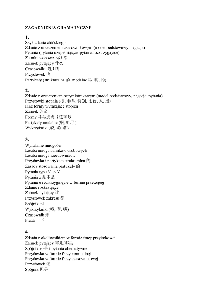 ZAGADNIENIA GRAMATYCZNE 1. Szyk zdania chińskiego Zdanie z orzeczeniem czasownikowym (model podstawowy, negacja) Pytania (pytania uzupełniające, pytania rozstrzygające) Zaimki osobowe i Zaimek pytający Czasowniki i Przysłówek Partykuły (strukturalna , modalne , , ) 2. Zdanie z orzeczeniem przymiotnikowym (model podstawowy, negacja, pytania) Przysłówki stopnia ( , , , , , ) Inne formy wyrażające stopień Zaimek 个i Formy Partykuły modalne ( , , ) Wykrzykniki ( , , ) 3. Wyrażanie mnogości Liczba mnoga zaimków osobowych Liczba mnoga rzeczowników Przydawka i partykuła strukturalna Zasady stosowania partykuły Pytania typu V V Pytania z Pytania o rozstrzygnięcie w formie przeczącej Zdanie rozkazujące Zaimek pytający Przysłówek zakresu Spójnik Wykrzykniki ( , , ) Czasownik Fraza 4. Zdania z okolicznikiem w formie frazy przyimkowej Zaimek pytający / Spójnik i pytania alternatywne Przydawka w formie frazy nominalnej Przydawka w formie frazy czasownikowej Przysłówek Spójnik Czasownik modalny 5. Liczebniki główne Podawanie numerów Zdania z czasownikiem Fraza z Zdania rozkazujące (2) Czasownik modalny Zaimek pytajny Przyimek 6. Klasyfikatory Fraza ilościowa (liczebnik-klasyfikator) Liczebnik 2 Liczebniki 100-199 i wyrażanie wielkości przybliżonych Liczebnik Pytanie o liczbę Zaimek Zaimek Przysłówki zakresu ( , ) Przysłówek Zdania z dwoma dopełnieniami Kolejność elementów w przydawce złożonej Zaimek 7. Zdanie z orzeczeniem nominalnym Okolicznik – kolejność elementów w okoliczniku wieloelementowym Pytania o uzupełnienie z konstrukcją „ + przymiotnik” Fraza w pytaniach o wiek Porównania – zdania z Zaimki wskazujące i Przysłówki temporalne ( , ) Przysłówek ilościowy Partykuły modalne ( , , ) Przysłówek Czasownik Frazy typu 8. Komplementy Komplement sposobu Zdania z komplementem sposobu Przydawka w postaci frazy werbalnej Okoliczniki opisowe Czasowniki modalne wyrażające możliwość ( , Czasowniki Czasowniki złożone Reduplikacja czasowników Liczebnik Przysłówek Fraza liczebnik-klasyfikator , ) 9. Zdania z orzeczeniem w formie frazy podmiotowo-orzeczeniowej Komplement sposobu odnoszący się do wykonawcy/odbiorcy czynności Partykuły aspektualne Partykuła aspektualna Rodzaje przydawek Przydawka wyodrębniająca Przydawka opisowa Kolejność przydawek Czasownik i mowa zależna Czasownik modalny 10. Zdania z serią konstrukcji werbalnych Relacje między czasownikami lub frazami czasownikowymi pełniącymi funkcję orzezenia w zdaniu z serią konstrukcji werbalnych Zdania złożone i spójnik Zaimek Zaimki i Przysłówek i Wyrażenie Użycie czasowników i …… Wyrażenia …… Przysłówki i Partykuły modalne ( , , ) jako wskaźnik zespolenia 11. Frazy temporalne wyrażające moment w czasie Wyrażanie częstotliwości wykonywania czynności Konstrukcje teleskopowe wyrażające sprawstwo i z czasownikiem Zdania przyczynowe Zdania celowe z Konstrukcje z przyimkiem Spójnik , Pytania z frazami Partykuły Liczebnik Przysłówek 12. Zdania złożone z konstrukcjami: …, Frazy temporalne … ,… ,… Komplement temporalny Przysłówki temporalne Wyrażanie wielkości przybliżonych Rzeczowniki Czasowniki …; …, …; 13. Kategoria aspektu i partykuły aspektualne Partykuła aspektualna Partykuła modalna Partykuła strukturalna Komplement kierunkowy prosty Przysłówki 14. i frazy oznaczające miejsce Zdania egzystencjalne z , i innymi czasownikami Partykuła aspektualna 15. Klasyfikatory (indywidualne, zbiorowe, nieokreślone, tymczasowe) Jednostki miary z przymiotnikami i czasownikami Użycie Reduplikacja klasyfikatorów Konstrukcja …, … Konstrukcja …, … Konstrukcja …, … 16. Komplement rezultatywny Zdania o znaczeniu biernym Zdania z Konstrukcja / / …, / …. 17. Komplement sposobu w zdaniach porównawczych Przysłówki …, … Konstrukcja Spójnik …, … 18. Komplement kierunkowy prosty Komplement kierunkowy złożony Przysłówek Zdania z konstrukcją …, … Pytania z przysłówkiem Liczebniki do 10000 19. Partykuła aspektualna Reduplikacja czasowników Reduplikacja przymiotników Zdania złożone … … Klasyfikatory werbalne … … 20. Komplement kierunkowy wyrażający rezultat ( Komplement potencjalny Zdania wyrażające pojawianie się obiektu Zdania z konstrukcją … … ) 21. Zdania z konstrukcją … Komplement potencjalny … /… + czasownik + + czasownik z komplementem potencjalnym Konstrukcja Konstrukcja … 22. Komplement stopnia z Zdania rozkazujące Przysłówek 23. Wyrażanie identyczności: … -A B … Wyrażanie porównania: -A B / … -A B … Zdania z 24. Zdania z Liczebniki pow. 10 000 Wyrażania wielokrotności Ułamki zwykłe Ułamki dziesiętne i bez