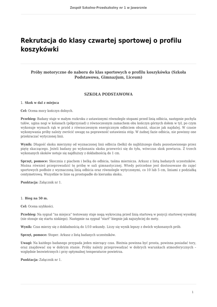 Zespół Szkolno-Przedszkolny nr 1 w Jaworznie Rekrutacja do klasy czwartej sportowej o profilu koszykówki Próby motoryczne do naboru do klas sportowych o profilu koszykówka (Szkoła Podstawowa, Gimnazjum, Liceum) SZKOŁA PODSTAWOWA 1. Skok w dal z miejsca Cel: Ocena mocy kończyn dolnych. Przebieg: Badany staje w małym rozkroku z ustawionymi równolegle stopami przed linią odbicia, następnie pochyla tułów, ugina nogi w kolanach (półprzysiad) z równoczesnym zamachem obu kończyn górnych dołem w tył, po czym wykonuje wymach rąk w przód z równoczesnym energicznym odbiciem obunóż, skacze jak najdalej. W czasie wykonywania próby należy zwrócić uwagę na poprawność ustawienia stóp. W żadnej fazie odbicia, nie powinny one przekraczać wytyczonej linii. Wynik: Długość skoku mierzymy od wyznaczonej linii odbicia (belki) do najbliższego śladu pozostawionego przez piętę skaczącego. Jeżeli badany po wykonaniu skoku przewróci się do tyłu, wówczas skok powtarza. Z trzech wykonanych skoków notuje się najdłuższy z dokładnością do 1 cm. Sprzęt, pomoce: Skocznia z piachem i belką do odbicia, taśma miernicza. Arkusz z listą badanych uczestników. Można również przeprowadzić tę próbę w sali gimnastycznej. Wtedy potrzebne jest dostosowane do zajęć sportowych podłoże z wyznaczoną linią odbicia oraz równolegle wytyczonymi, co 10 lub 5 cm, liniami z podziałką centymetrową. Wszystkie te linie są prostopadłe do kierunku skoku. Punktacja: Załącznik nr 1. 1. Bieg na 50 m. Cel: Ocena szybkości. Przebieg: Na sygnał "na miejsca" testowany staje nogą wykroczną przed linią startową w pozycji startowej wysokiej (nie stosuje się startu niskiego). Następnie na sygnał "start" biegnie jak najszybciej do mety. Wynik: Czas mierzy się z dokładnością do 1/10 sekundy. Liczy się wynik lepszy z dwóch wykonanych prób. Sprzęt, pomoce: Stoper. Arkusz z listą badanych uczestników. Uwagi: Na każdego badanego przypada jeden mierzący czas. Bieżnia powinna być prosta, powinna posiadać tory, oraz znajdować się w dobrym stanie. Próby należy przeprowadzać w dobrych warunkach atmosferycznych – względnie bezwietrznych i przy optymalnej temperaturze powietrza. Punktacja: Załącznik nr 1. 1 Zespół Szkolno-Przedszkolny nr 1 w Jaworznie 1. Bieg wahadłowy 4 x 10 m z przekładaniem klocków. Cel: Próba zwinnościowo – szybkościowa. Przebieg: Na sygnał "na miejsca" badany staje na linii startu. Na komendę "start" biegnie do drugiej linii (odległość 10 m), podnosi z półkola klocek, po czym wraca na linię startu, gdzie kładzie klocek (klocek nie może być rzucony). Następnie biegnie po drugi klocek i wracając kładzie go ponownie w półkolu. Wynik: Próbę wykonuje się dwukrotnie. Liczy się lepszy czas, mierzony z dokładnością do 1/10 s Próba zostaje zakończona z chwilą, gdy drugi klocek znajduje się w półkolu. Sprzęt, pomoce: Stoper, dwa klocki o wymiarach 5x5x5, kreda, chorągiewki lub pachołki. Arkusz z listą badanych uczestników. Uwagi: Próba zostaje unieważniona, gdy klocek jest do półkola wrzucony. Tak wykonaną próbę należy powtórzyć. Punktacja: Załącznik nr 1. 1. Bieg przedłużony 600 m. Cel: Ocena wytrzymałości. Przebieg: 600 m - dla chłopców i dziewcząt. Na sygnał "na miejsca" badany staje za linią startu w pozycji startowej wysokiej. Na sygnał "start" biegnie odpowiadającym mu tempem do linii mety. Wynik: Czas mierzy się z dokładnością do 1 sekundy. Sprzęt, pomoce: Stoper. Arkusz z listą badanych uczestników. Uwagi: Najlepiej jest próbę przeprowadzić na bieżni lekkoatletycznej. Jeżeli nie ma dostępu do bieżni, bieg można wykonać na równym twardym podłożu. Wskazane jest wówczas wytyczenie zamkniętego toru o odpowiedniej długości, z jak najbardziej łagodnymi zakrętami. Punktacja: Załącznik nr 1. Załącznik nr 1 SZKOŁA PODSTAWOWA 2