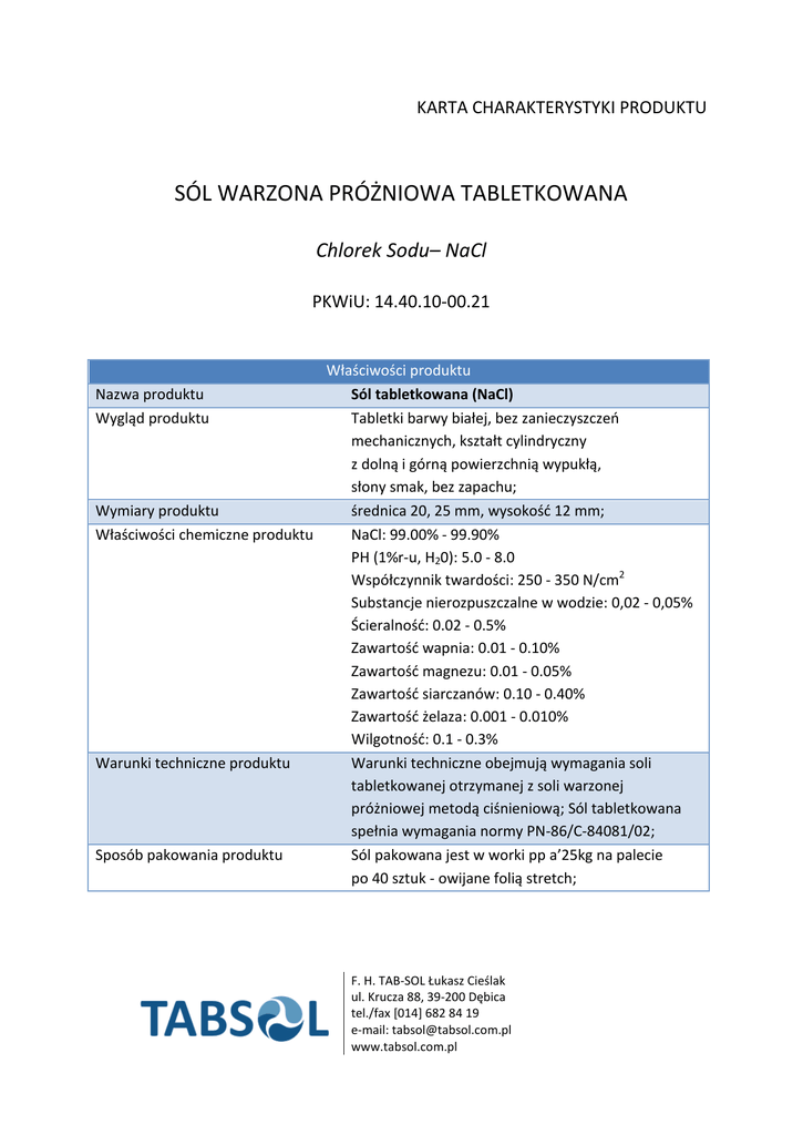 KARTA CHARAKTERYSTYKI PRODUKTU SÓL WARZONA PRÓŻNIOWA TABLETKOWANA Chlorek Sodu– NaCl PKWiU: 14.40.10-00.21 Właściwości produktu Nazwa produktu Sól tabletkowana (NaCl) Wygląd produktu Tabletki barwy białej, bez zanieczyszczeo mechanicznych, kształt cylindryczny z dolną i górną powierzchnią wypukłą, słony smak, bez zapachu; Wymiary produktu średnica 20, 25 mm, wysokośd 12 mm; Właściwości chemiczne produktu NaCl: 99.00% - 99.90% PH (1%r-u, H20): 5.0 - 8.0 Współczynnik twardości: 250 - 350 N/cm2 Substancje nierozpuszczalne w wodzie: 0,02 - 0,05% Ścieralnośd: 0.02 - 0.5% Zawartośd wapnia: 0.01 - 0.10% Zawartośd magnezu: 0.01 - 0.05% Zawartośd siarczanów: 0.10 - 0.40% Zawartośd żelaza: 0.001 - 0.010% Wilgotnośd: 0.1 - 0.3% Warunki techniczne produktu Warunki techniczne obejmują wymagania soli tabletkowanej otrzymanej z soli warzonej próżniowej metodą ciśnieniową; Sól tabletkowana spełnia wymagania normy PN-86/C-84081/02; Sposób pakowania produktu Sól pakowana jest w worki pp a’25kg na palecie po 40 sztuk - owijane folią stretch; F. H. TAB-SOL Łukasz Cieślak ul. Krucza 88, 39-200 Dębica tel./fax [014] 682 84 19 e-mail: [email protected] www.tabsol.com.pl