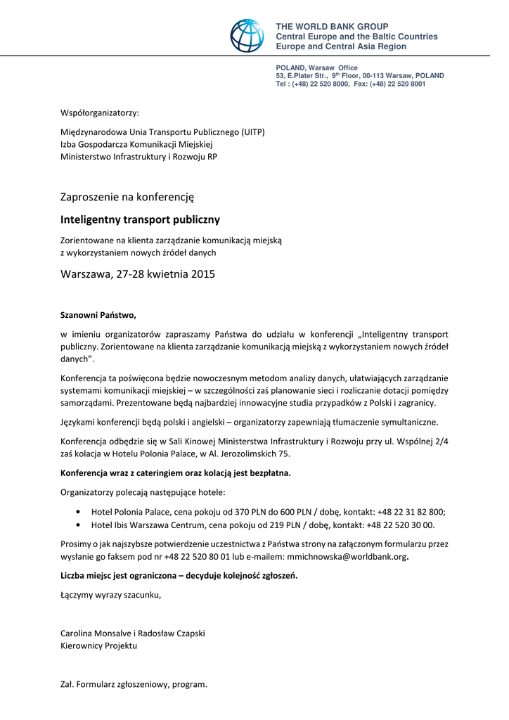 THE WORLD BANK GROUP Central Europe and the Baltic Countries Europe and Central Asia Region POLAND, Warsaw Office 53, E.Plater Str., 9th Floor, 00-113 Warsaw, POLAND Tel : (+48) 22 520 8000, Fax: (+48) 22 520 8001 Współorganizatorzy: Międzynarodowa Unia Transportu Publicznego (UITP) Izba Gospodarcza Komunikacji Miejskiej Ministerstwo Infrastruktury i Rozwoju RP Zaproszenie na konferencję Inteligentny transport publiczny Zorientowane na klienta zarządzanie komunikacją miejską z wykorzystaniem nowych źródeł danych Warszawa, 27-28 kwietnia 2015 Szanowni Państwo, w imieniu organizatorów zapraszamy Państwa do udziału w konferencji „Inteligentny transport publiczny. Zorientowane na klienta zarządzanie komunikacją miejską z wykorzystaniem nowych źródeł danych”. Konferencja ta poświęcona będzie nowoczesnym metodom analizy danych, ułatwiających zarządzanie systemami komunikacji miejskiej – w szczególności zaś planowanie sieci i rozliczanie dotacji pomiędzy samorządami. Prezentowane będą najbardziej innowacyjne studia przypadków z Polski i zagranicy. Językami konferencji będą polski i angielski – organizatorzy zapewniają tłumaczenie symultaniczne. Konferencja odbędzie się w Sali Kinowej Ministerstwa Infrastruktury i Rozwoju przy ul. Wspólnej 2/4 zaś kolacja w Hotelu Polonia Palace, w Al. Jerozolimskich 75. Konferencja wraz z cateringiem oraz kolacją jest bezpłatna. Organizatorzy polecają następujące hotele: • • Hotel Polonia Palace, cena pokoju od 370 PLN do 600 PLN / dobę, kontakt: +48 22 31 82 800; Hotel Ibis Warszawa Centrum, cena pokoju od 219 PLN / dobę, kontakt: +48 22 520 30 00. Prosimy o jak najszybsze potwierdzenie uczestnictwa z Państwa strony na załączonym formularzu przez wysłanie go faksem pod nr +48 22 520 80 01 lub e-mailem: [email protected]. Liczba miejsc jest ograniczona – decyduje kolejność zgłoszeń. Łączymy wyrazy szacunku, Carolina Monsalve i Radosław Czapski Kierownicy Projektu Zał. Formularz zgłoszeniowy, program.
