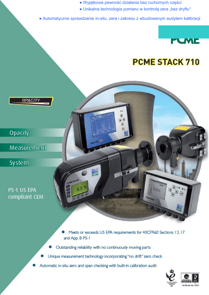 ● Wyjątkowa Spełnia lub pewność przekracza działania wymagania bez ruchomych US EPA dlaczęści 40CFR60 System CEM zgodnyrozdziały 13, 17 i Załącznika B, PS-1 ● Unikalna technologia pomiaru w kontrolą zera „bez dryftu” z US EPA PS- 1 Pomiaru ● Automatyczne sprawdzenie in-situ, zera i zakresu z wbudowanym audytem kalibracji Opis systemu Monitor przeźroczystości PCME STACK 710 spełnia lub przekracza wymagania US EPA PS-1 w zakresie monitorowania przeźroczystości spalin kominowych, dzięki znakomitym osiągom tego kompaktowego, lekkiego i łatwego w użyciu przyrządu. Będąc częścią rodziny produktów PCME Ltd, PCME Stack 710 dopełnia funkcjonalności po podłączeniu do modułu interfejsu lub MultiControllera (jako wieloczujnikowego interfejsu użytkownika, do komunikacji Ethernetowej, tworzenia wykresów, dla wizualizacji tendencji danych archiwalnych oraz rejestracji danych i raportowania, uchwycenia zależności i analizy funkcji). Ponadto, przyrząd może stanowić element monitorującej sieci PCME Ltd, zawierającej monitory cząstek, monitory nieszczelności i skuteczności działania filtrów, nie mającego sobie równych wśród systemów monitorowania pyłów dla całych instalacji. Zaprojektowany dla zapewnienia zgodności • Spełnia lub przekracza wymagania US EPA, rozdziału 13, 17 40CFR60 oraz Załącznika B do PS-1 • Spełnia lub przekracza wymagania zaproponowane w Załączniku F 40CFR60, Procedury 3. • Spełnia lub przekracza normę D6216 ASTM. Legenda: To other sensors – do innych czujników PC Software – oprogramowanie komputera Multi-Controller – sterownik wieloczujnikowy Other dust sensors – inne czujniki pyłowe Analogue input module – moduł wejść analogowych Relay output module – moduł wejść przekaźnikowych Analogue output module – moduł wyjść analogowych Relays – przekaźniki Spur – izolator galwaniczny Funkcje zaawansowane i zalety Ułatwiony audyt Niezwykle ułatwiona okresowa weryfikacja parametrów. Wbudowany uchwyt audytowy przystosowany do mocowania standardowych filtrów optycznych, zerowe osiowanie nie wymagające usuwania przyrządu z komina. Ikony ułatwiające ustawianie przyrządu Przyrząd może być ustawiany i konfigurowany za pomocą integralnego panelu sterowania. Interfejs użytkownika z intuicyjnym uniwersalnym menu wykorzystującym ikony. Gęstość pyłu Monitory gęstości pyłu muszą być kalibrowane przez porównanie w teście próbki izokinetycznej, podobnie jak w PS-11. Automatyczna samokontrola PCME Stack 710 posiada w pełni zautomatyzowany system zerowania i kompensacji dryftu. Automatyczny mechanizm kontroli zakresu, potwierdza kalibracje przyrządu dla przedziałów definiowanych przez użytkownika. Koncepcja systemu • • • • • • • • • • • • • • • Wyświetlanie chwilowej i średniej emisji (wykres słupkowy, opis i wykres liniowy). Ekran grupowania kanałów przystosowywanego do potrzeb użytkownika w celu wyświetlania powiązanych danych np.: pył, prędkość, O2. Wielojęzykowy i wyposażony w ikony interfejs użytkownika Monitorowanie danych z zewnętrznych czujników celu normalizacji i dokonywania centralnej analizy np.: prędkości, O2, temperatury, itp. Ekran statusu dla zwięzłej informacji o stanach alarmowych. Ekran pokazujący tryb wytrząsania Możliwość sterowania do 16 czujników PCME pod elektrofiltrów warunkiem zapewnienia odpowiedniego zasilania (wyłącznie dla opcji z MultiControllerem). Dwa poziomy alarmowe ze zwłoką alarmową. Pełny podgląd trzech pamięci równoległych przyrządu. (długookresowej, krótkookresowej i impulsowej) Rejestr alarmów przyrządu i emisji. Opcjonalne oprogramowanie zgodne z systemem MS Windows, ładowane do komputera dla generowania raportów. Możliwość kalibracji dla wielu współczynników Duży wyświetlacz graficzny (320 x 240 pikseli) dla ułatwienia interpretacji danych graficznych. Wizualizacja emisji w wielu kanałach za pomocą wykresów, w odniesieniu do poziomów alarmowych. Ułatwione porównanie źródeł emisji Zabezpieczenie hasłem Charakterystyka układów optycznych Pomiary Metoda Robocza długość fali Źródło światła Zakres Dokładność Dryft (długookresowy) Stabilność termiczna Kąt projekcji Kąt widzenia Czas reakcji Uśrednianie Długość drogi pomiaru Kalibracja Korekcja zera Migawka bezusterkowa Charakterystyka Pomiar przepuszczalności światła w dwóch przejściach 525 ±20nm Impulsowa dioda LED o wysokim natężeniu światła Nieprzeźroczystość 0-10% do 0-100% Gęstość optyczna 0 - 0,1 do 0 - 3,0 ±2% nieprzeźroczystości <0,3% nieprzeźroczystości/miesiąc <0,3% nieprzeźroczystości/22oC zmiany otoczenia <2o <2o ≤ 10s do 95% Wybierane w zakresie 10s do 24h (min. przyrost 1s) 1 do 10m (należy określić w zamówieniu) Automatyczna kontrola zera i skali (przedział wyboru 1 do 24h, min przyrost 1h Automatyczna korekta dryftu zera Podzespół opcjonalny Dane techniczne Zespół nadawczo-odbiorczy/zwierciadło wsteczne Czujnik Liczba kanałów Wyświetlacz 128 x 64 pikseli , podświetlony LCD Ekrany użytkownika Ustawianie/wyniki Klawiatura 4 klawisze do wprowadzania danych Wskaźniki Zasilanie, kalibracja Obudowa Temperatura pracy Maksymalna temp. gazów odlotowych Maksymalna temp. kołnierza Zgodność z normą Zgodność elektromagnetyczna Stopień ochrony Interfejs modbus Wyjścia Dane nominalne przekaźnika Napięcie zasilania Prąd Wymiary (mm): Zespół nadawczo-odbiorczy Zwierciadło wsteczne Złącze kominowe Dmuchawa płucząca Filtry kalibracji Opcjonalny moduł interfejsu Pojedynczy kanał Odlew aluminiowy malowany proszkowo farbą epoksydową -20 do +55 oC (-4o do +113oF) 600oc/ 1100oF Klawiatura do obsługi menu ikonowego Zasilanie. status systemu, alarmy i podświetlany wyświetlacz graficzny Odlew aluminiowy malowany proszkowo farbą epoksydową -20 do +55 oC (-4o do +113oF) Nie dotyczy 1-16 Podświetlony LCD wyświetla