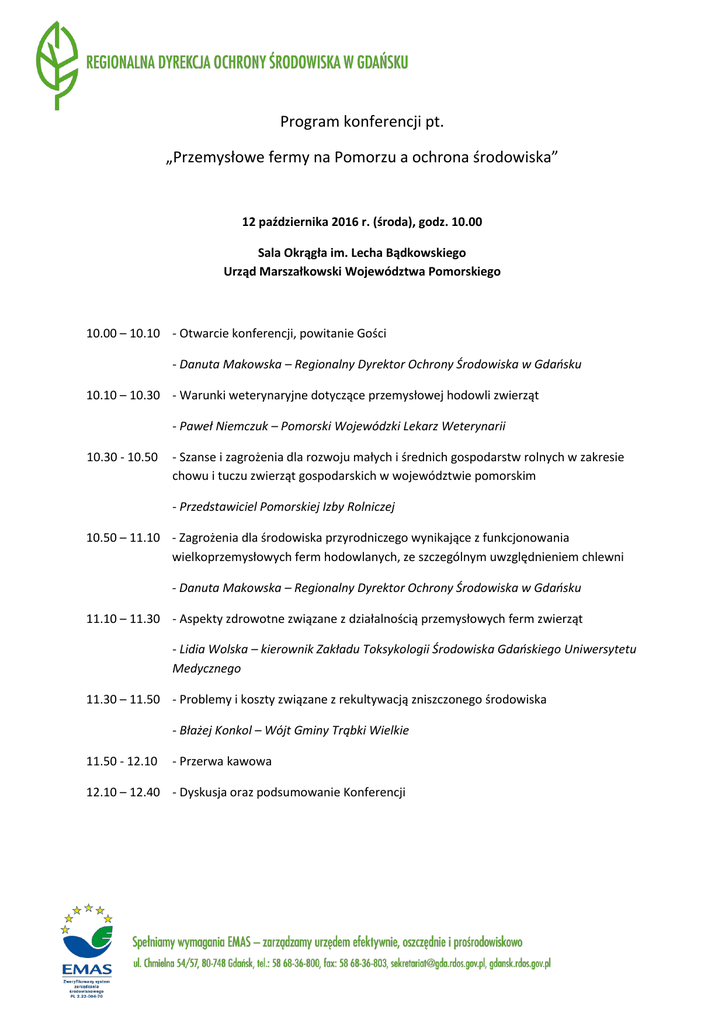 Program konferencji pt. „Przemysłowe fermy na Pomorzu a ochrona środowiska” 12 października 2016 r. (środa), godz. 10.00 Sala Okrągła im. Lecha Bądkowskiego Urząd Marszałkowski Województwa Pomorskiego 10.00 – 10.10 - Otwarcie konferencji, powitanie Gości - Danuta Makowska – Regionalny Dyrektor Ochrony Środowiska w Gdańsku 10.10 – 10.30 - Warunki weterynaryjne dotyczące przemysłowej hodowli zwierząt - Paweł Niemczuk – Pomorski Wojewódzki Lekarz Weterynarii 10.30 - 10.50 - Szanse i zagrożenia dla rozwoju małych i średnich gospodarstw rolnych w zakresie chowu i tuczu zwierząt gospodarskich w województwie pomorskim - Przedstawiciel Pomorskiej Izby Rolniczej 10.50 – 11.10 - Zagrożenia dla środowiska przyrodniczego wynikające z funkcjonowania wielkoprzemysłowych ferm hodowlanych, ze szczególnym uwzględnieniem chlewni - Danuta Makowska – Regionalny Dyrektor Ochrony Środowiska w Gdańsku 11.10 – 11.30 - Aspekty zdrowotne związane z działalnością przemysłowych ferm zwierząt - Lidia Wolska – kierownik Zakładu Toksykologii Środowiska Gdańskiego Uniwersytetu Medycznego 11.30 – 11.50 - Problemy i koszty związane z rekultywacją zniszczonego środowiska - Błażej Konkol – Wójt Gminy Trąbki Wielkie 11.50 - 12.10 - Przerwa kawowa 12.10 – 12.40 - Dyskusja oraz podsumowanie Konferencji