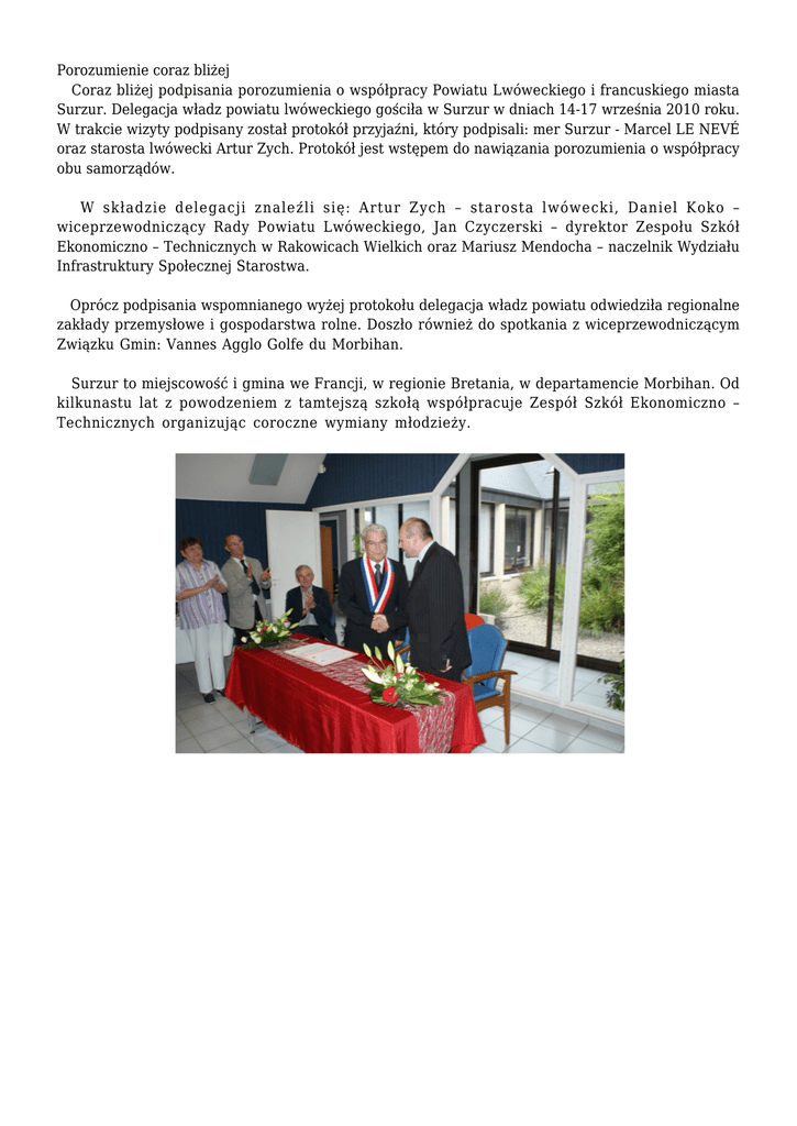Porozumienie coraz bliżej Coraz bliżej podpisania porozumienia o współpracy Powiatu Lwóweckiego i francuskiego miasta Surzur. Delegacja władz powiatu lwóweckiego gościła w Surzur w dniach 14-17 września 2010 roku. W trakcie wizyty podpisany został protokół przyjaźni, który podpisali: mer Surzur - Marcel LE NEVÉ oraz starosta lwówecki Artur Zych. Protokół jest wstępem do nawiązania porozumienia o współpracy obu samorządów. W składzie delegacji znaleźli się: Artur Zych – starosta lwówecki, Daniel Koko – wiceprzewodniczący Rady Powiatu Lwóweckiego, Jan Czyczerski – dyrektor Zespołu Szkół Ekonomiczno – Technicznych w Rakowicach Wielkich oraz Mariusz Mendocha – naczelnik Wydziału Infrastruktury Społecznej Starostwa. Oprócz podpisania wspomnianego wyżej protokołu delegacja władz powiatu odwiedziła regionalne zakłady przemysłowe i gospodarstwa rolne. Doszło również do spotkania z wiceprzewodniczącym Związku Gmin: Vannes Agglo Golfe du Morbihan. Surzur to miejscowość i gmina we Francji, w regionie Bretania, w departamencie Morbihan. Od kilkunastu lat z powodzeniem z tamtejszą szkołą współpracuje Zespół Szkół Ekonomiczno – Technicznych organizując coroczne wymiany młodzieży. Fot. Adam Horanin