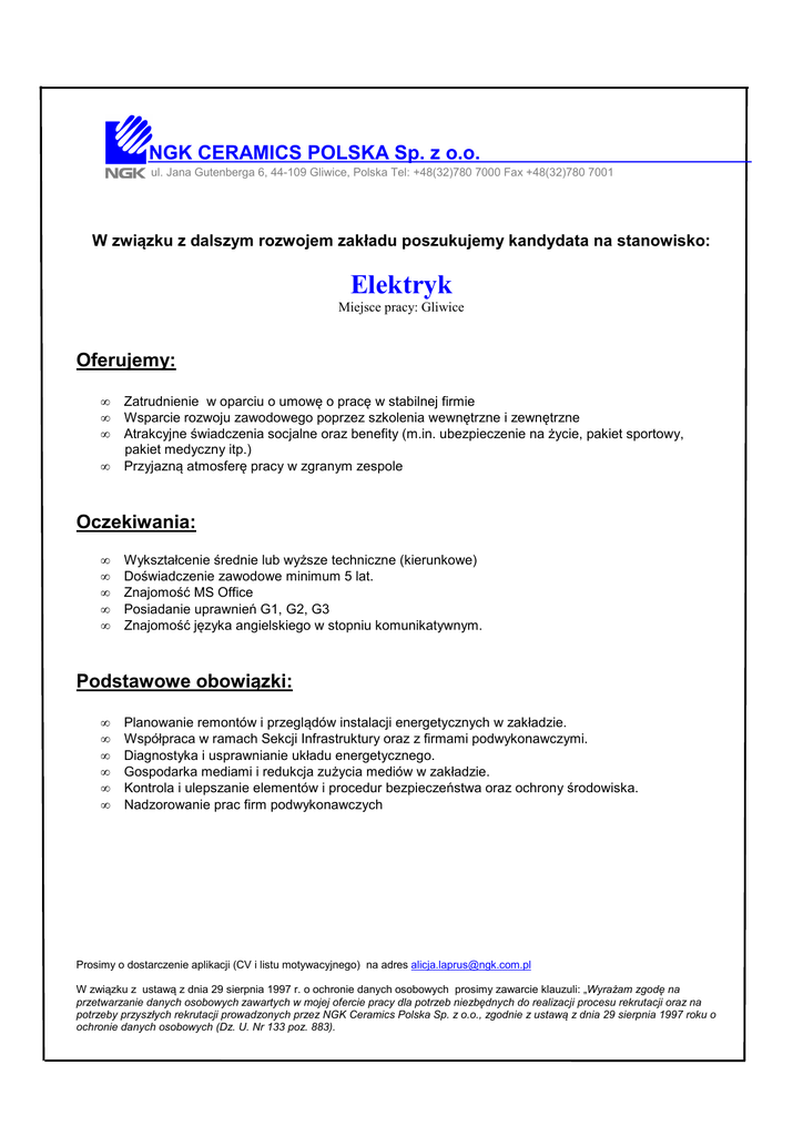 NGK CERAMICS POLSKA Sp. z o.o. ul. Jana Gutenberga 6, 44-109 Gliwice, Polska Tel: +48(32)780 7000 Fax +48(32)780 7001 W związku z dalszym rozwojem zakładu poszukujemy kandydata na stanowisko: Elektryk Miejsce pracy: Gliwice Oferujemy: • • • • Zatrudnienie w oparciu o umowę o pracę w stabilnej firmie Wsparcie rozwoju zawodowego poprzez szkolenia wewnętrzne i zewnętrzne Atrakcyjne świadczenia socjalne oraz benefity (m.in. ubezpieczenie na życie, pakiet sportowy, pakiet medyczny itp.) Przyjazną atmosferę pracy w zgranym zespole Oczekiwania: • • • • • Wykształcenie średnie lub wyższe techniczne (kierunkowe) Doświadczenie zawodowe minimum 5 lat. Znajomość MS Office Posiadanie uprawnień G1, G2, G3 Znajomość języka angielskiego w stopniu komunikatywnym. Podstawowe obowiązki: • • • • • • Planowanie remontów i przeglądów instalacji energetycznych w zakładzie. Współpraca w ramach Sekcji Infrastruktury oraz z firmami podwykonawczymi. Diagnostyka i usprawnianie układu energetycznego. Gospodarka mediami i redukcja zużycia mediów w zakładzie. Kontrola i ulepszanie elementów i procedur bezpieczeństwa oraz ochrony środowiska. Nadzorowanie prac firm podwykonawczych Prosimy o dostarczenie aplikacji (CV i listu motywacyjnego) na adres [email protected] W związku z ustawą z dnia 29 sierpnia 1997 r. o ochronie danych osobowych prosimy zawarcie klauzuli: „Wyrażam zgodę na przetwarzanie danych osobowych zawartych w mojej ofercie pracy dla potrzeb niezbędnych do realizacji procesu rekrutacji oraz na potrzeby przyszłych rekrutacji prowadzonych przez NGK Ceramics Polska Sp. z o.o., zgodnie z ustawą z dnia 29 sierpnia 1997 roku o ochronie danych osobowych (Dz. U. Nr 133 poz. 883).