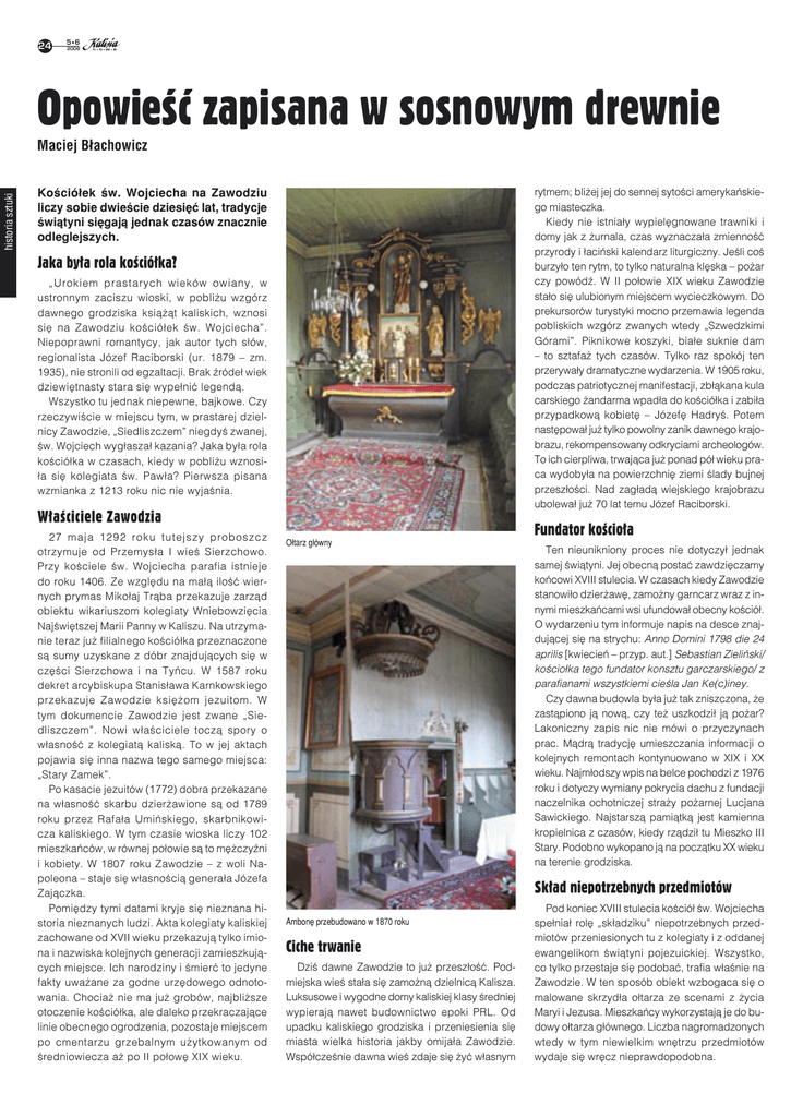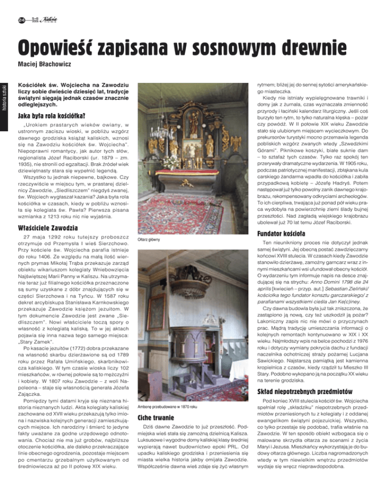 24 5•6 2008 Opowieść zapisana w sosnowym drewnie historia sztuki Maciej Błachowicz rytmem; bliżej jej do sennej sytości amerykańskiego miasteczka. Kiedy nie istniały wypielęgnowane trawniki i domy jak z żurnala, czas wyznaczała zmienność przyrody i łaciński kalendarz liturgiczny. Jeśli coś burzyło ten rytm, to tylko naturalna klęska – pożar czy powódź. W II połowie XIX wieku Zawodzie stało się ulubionym miejscem wycieczkowym. Do prekursorów turystyki mocno przemawia legenda pobliskich wzgórz zwanych wtedy „Szwedzkimi Górami”. Piknikowe koszyki, białe suknie dam – to sztafaż tych czasów. Tylko raz spokój ten przerywały dramatyczne wydarzenia. W 1905 roku, podczas patriotycznej manifestacji, zbłąkana kula carskiego żandarma wpadła do kościółka i zabiła przypadkową kobietę – Józefę Hadryś. Potem następował już tylko powolny zanik dawnego krajobrazu, rekompensowany odkryciami archeologów. To ich cierpliwa, trwająca już ponad pół wieku praca wydobyła na powierzchnię ziemi ślady bujnej przeszłości. Nad zagładą wiejskiego krajobrazu ubolewał już 70 lat temu Józef Raciborski. Kościółek św. Wojciecha na Zawodziu liczy sobie dwieście dziesięć lat, tradycje świątyni sięgają jednak czasów znacznie odleglejszych. Jaka była rola kościółka? „Urokiem prastarych wieków owiany, w ustronnym zaciszu wioski, w pobliżu wzgórz dawnego grodziska książąt kaliskich, wznosi się na Zawodziu kościółek św. Wojciecha”. Niepoprawni romantycy, jak autor tych słów, regionalista Józef Raciborski (ur. 1879 – zm. 1935), nie stronili od egzaltacji. Brak źródeł wiek dziewiętnasty stara się wypełnić legendą. Wszystko tu jednak niepewne, bajkowe. Czy rzeczywiście w miejscu tym, w prastarej dzielnicy Zawodzie, „Siedliszczem” niegdyś zwanej, św. Wojciech wygłaszał kazania? Jaka była rola kościółka w czasach, kiedy w pobliżu wznosiła się kolegiata św. Pawła? Pierwsza pisana wzmianka z 1213 roku nic nie wyjaśnia. Właściciele Zawodzia 27 maja 1292 roku tutejszy proboszcz otrzymuje od Przemysła I wieś Sierzchowo. Przy kościele św. Wojciecha parafia istnieje do roku 1406. Ze względu na małą ilość wiernych prymas Mikołaj Trąba przekazuje zarząd obiektu wikariuszom kolegiaty Wniebowzięcia Najświętszej Marii Panny w Kaliszu. Na utrzymanie teraz już filialnego kościółka przeznaczone są sumy uzyskane z dóbr znajdujących się w części Sierzchowa i na Tyńcu. W 1587 roku dekret arcybiskupa Stanisława Karnkowskiego przekazuje Zawodzie księżom jezuitom. W tym dokumencie Zawodzie jest zwane „Siedliszczem”. Nowi właściciele toczą spory o własność z kolegiatą kaliską. To w jej aktach pojawia się inna nazwa tego samego miejsca: „Stary Zamek”. Po kasacie jezuitów (1772) dobra przekazane na własność skarbu dzierżawione są od 1789 roku przez Rafała Umińskiego, skarbnikowicza kaliskiego. W tym czasie wioska liczy 102 mieszkańców, w równej połowie są to mężczyźni i kobiety. W 1807 roku Zawodzie – z woli Napoleona – staje się własnością generała Józefa Zajączka. Pomiędzy tymi datami kryje się nieznana historia nieznanych ludzi. Akta kolegiaty kaliskiej zachowane od XVII wieku przekazują tylko imiona i nazwiska kolejnych generacji zamieszkujących miejsce. Ich narodziny i śmierć to jedyne fakty uważane za godne urzędowego odnotowania. Chociaż nie ma już grobów, najbliższe otoczenie kościółka, ale daleko przekraczające linie obecnego ogrodzenia, pozostaje miejscem po cmentarzu grzebalnym użytkowanym od średniowiecza aż po II połowę XIX wieku. Ołtarz główny Fundator kościoła Ten nieunikniony proces nie dotyczył jednak samej świątyni. Jej obecną postać zawdzięczamy końcowi XVIII stulecia. W czasach kiedy Zawodzie stanowiło dzierżawę, zamożny garncarz wraz z innymi mieszkańcami wsi ufundował obecny kościół. O wydarzeniu tym informuje napis na desce znajdującej się na strychu: Anno Domini 1798 die 24 aprilis [kwiecień – przyp. aut.] Sebastian Zieliński/ kościołka tego fundator konsztu garczarskiego/ z parafianami wszystkiemi cieśla Jan Ke(c)iney. Czy dawna budowla była już tak zniszczona, że zastąpiono ją nową, czy też uszkodził ją pożar? Lakoniczny zapis nic nie mówi o przyczynach prac. Mądrą tradycję umieszczania informacji o kolejnych remontach kontynuowano w XIX i XX wieku. Najmłodszy wpis na belce pochodzi z 1976 roku i dotyczy wymiany pokrycia dachu z fundacji naczelnika ochotniczej straży pożarnej Lucjana Sawickiego. Najstarszą pamiątką jest kamienna kropielnica z czasów, kiedy rządził tu Mieszko III Stary. Podobno wykopano ją na początku XX wieku na terenie grodziska. Skład niepotrzebnych przedmiotów Ambonę przebudowano w 1870 roku Ciche trwanie Dziś dawne Zawodzie to już przeszłość. Podmiejska wieś stała się zamożną dzielnicą Kalisza. Luksusowe i wygodne domy kaliskiej klasy średniej wypierają nawet budownictwo epoki PRL. Od upadku kaliskiego grodziska i przeniesienia się miasta wielka historia jakby omijała Zawodzie. Współcześnie dawna wieś zdaje się żyć własnym Pod koniec XVIII stulecia kościół św. Wojciecha spełniał rolę „składziku” niepotrzebnych przedmiotów przeniesionych tu z kolegiaty i z oddanej ewangelikom świątyni pojezuickiej. Wszystko, co tylko przestaje się podobać, trafia właśnie na Zawodzie. W ten sposób obiekt wzbogaca się o malowane skrzydła ołtarza ze scenami z życia Maryi i Jezusa. Mieszkańcy wykorzystają je do budowy ołtarza głównego. Liczba nagromadzonych wtedy w tym niewielkim wnętrzu przedmiotów wydaje się wręcz nieprawdopodobna. 5•6 2008 Przez pewien czas przechowuje się tu portret arcybiskupa Stanisława Karnkowskiego i wielki obraz „Suplikacje do świętego Józefa” (dzisiaj oba w kolegiacie kaliskiej). Dodajmy dziewięć niemałych figurek apostołów, ambonę i przynajmniej jed