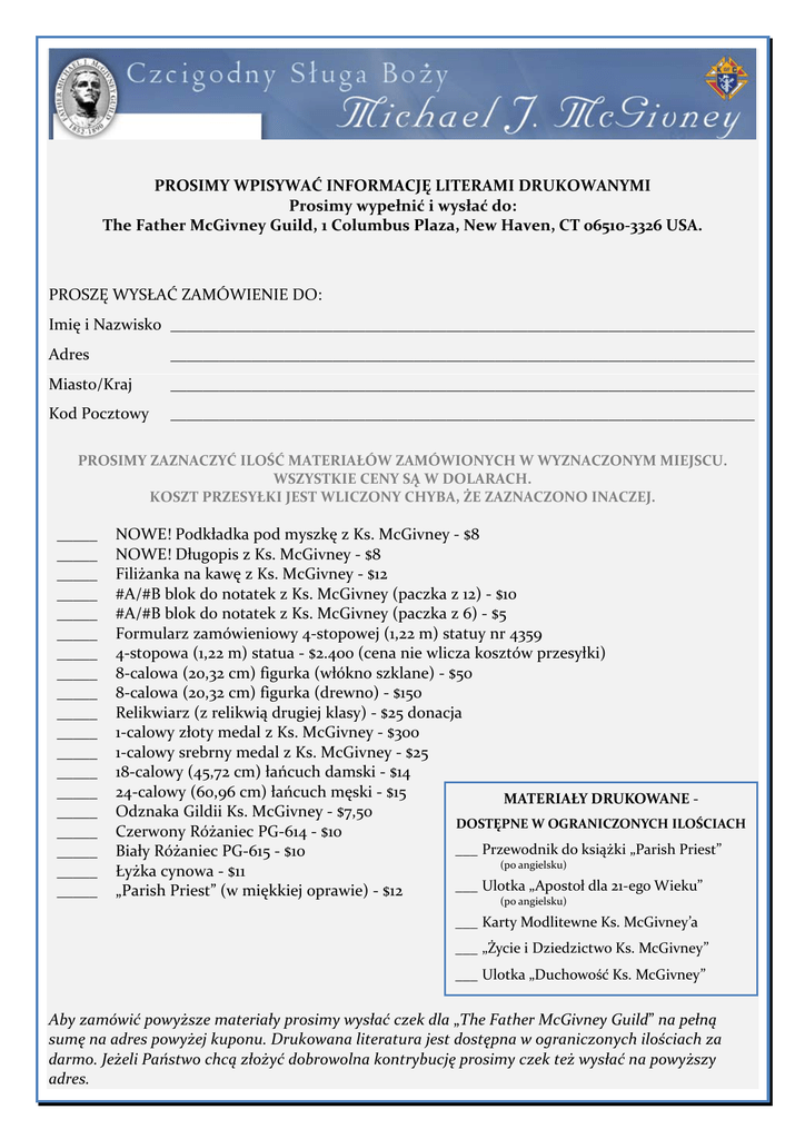 PROSIMY WPISYWAĆ INFORMACJĘ LITERAMI DRUKOWANYMI Prosimy wypełnić i wysłać do: The Father McGivney Guild, 1 Columbus Plaza, New Haven, CT 06510‐3326 USA. PROSZĘ WYSŁAĆ ZAMÓWIENIE DO: Imię i Nazwisko ________________________________________________________________________ Adres ________________________________________________________________________ Miasto/Kraj ________________________________________________________________________ Kod Pocztowy ________________________________________________________________________ PROSIMY ZAZNACZYĆ ILOŚĆ MATERIAŁÓW ZAMÓWIONYCH W WYZNACZONYM MIEJSCU. WSZYSTKIE CENY SĄ W DOLARACH. KOSZT PRZESYŁKI JEST WLICZONY CHYBA, ŻE ZAZNACZONO INACZEJ. _____ _____ _____ _____ _____ _____ _____ _____ _____ _____ _____ _____ _____ _____ _____ _____ _____ _____ _____ NOWE! Podkładka pod myszkę z Ks. McGivney ‐ $8 NOWE! Długopis z Ks. McGivney ‐ $8 Filiżanka na kawę z Ks. McGivney ‐ $12 #A/#B blok do notatek z Ks. McGivney (paczka z 12) ‐ $10 #A/#B blok do notatek z Ks. McGivney (paczka z 6) ‐ $5 Formularz zamówieniowy 4‐stopowej (1,22 m) statuy nr 4359 4‐stopowa (1,22 m) statua ‐ $2.400 (cena nie wlicza kosztów przesyłki) 8‐calowa (20,32 cm) figurka (włókno szklane) ‐ $50 8‐calowa (20,32 cm) figurka (drewno) ‐ $150 Relikwiarz (z relikwią drugiej klasy) ‐ $25 donacja 1‐calowy złoty medal z Ks. McGivney ‐ $300 1‐calowy srebrny medal z Ks. McGivney ‐ $25 18‐calowy (45,72 cm) łańcuch damski ‐ $14 24‐calowy (60,96 cm) łańcuch męski ‐ $15 MATERIAŁY DRUKOWANE ‐ Odznaka Gildii Ks. McGivney ‐ $7,50 DOSTĘPNE W OGRANICZONYCH ILOŚCIACH Czerwony Różaniec PG‐614 ‐ $10 ___ Przewodnik do książki „Parish Priest” Biały Różaniec PG‐615 ‐ $10 (po angielsku) Łyżka cynowa ‐ $11 ___ Ulotka „Apostoł dla 21‐ego Wieku” „Parish Priest” (w miękkiej oprawie) ‐ $12 (po angielsku) ___ Karty Modlitewne Ks. McGivney’a ___ „Życie i Dziedzictwo Ks. McGivney” ___ Ulotka „Duchowość Ks. McGivney” Aby zamówić powyższe materiały prosimy wysłać czek dla „The Father McGivney Guild” na pełną sumę na adres powyżej kuponu. Drukowana literatura jest dostępna w ograniczonych ilościach za darmo. Jeżeli Państwo chcą złożyć dobrowolna kontrybucję prosimy czek też wysłać na powyższy adres.