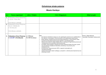 Ochotnicze straże pożarne Miasto Kwidzyn Lp. Nazwa organizacji Adres i Telefon 1. Ochotnicza Straż Pożarna w ZEM “POLMO” Likwidacja zakładu 2. Ochotnicza Straż Pożarna M.S.P. MEBLOS w Kwidzynie Cele i Osiągnięcia Skład zarządu - - Likwidacja zakładu 3. Ochotnicza Straż Pożarna ul. Miłosna 82-500 Kwidzyn w S.O.SP w Kwidzynie Cele: Prezes: Adam Jańczyk prowadzenie działalności mającej na celu zapobieganie pożarom oraz współdziałanie w Naczelnik: Kazimierz Szalczewski tym zakresie z instytucjami, stowarzyszeniami oraz organizacjami społecznymi, branie udziału w akcjach ratowniczych przeprowadzanych w czasie pożarów, klęsk żywiołowych lub innych miejscowych zagrożeń w tym ekologicznych, informowanie ludności (załogi zakładu pracy) o istniejących zagrożeniach pożarowych i ekologicznych oraz sposobach ochrony przed nimi, rozwijanie wśród członków ochotniczych straży pożarnych kultury fizycznej i sportu oraz prowadzenie działalności kulturalno-oświatowej i rozrywkowej oraz samopomocowej, uczestniczenie i reprezentowanie OSP w organach samorządowych i przedstawicielskich, wykonywanie innych zadań wynikający z przepisów o ochronie przeciwpożarowej oraz niniejszego statutu. 1 Lp. Nazwa organizacji Adres i Telefon Miłosna 18 4. Ochotnicza Straż Pożarna 82-500 Kwidzyn w Kwidzynie Cele i Osiągnięcia Skład zarządu Cele: - prowadzenie działalności mającej na celu zapobieganie pożarom oraz współdziałanie w tym Prezes: Ryszard Mówiński zakresie z PSP, organami samorządowymi i innymi podmiotami, Sekretarz: Andrzej Szpala - udział w akcjach ratowniczych przeprowadzanych w czasie pożarów, zagrożeń Skarbnik: Stanisław Piłat ekologicznych związanych z ochrona środowiska oraz innych klęsk i zdarzeń, - informowanie ludności o istniejących zagrożeniach pożarowych i ekologicznych oraz sposobach ochrony przed nimi, - rozwijanie wśród członków osp kultury fizycznej i sportu oraz prowadzenie działalności kulturalno – oświatowej i rozrywkowej, - wykonywanie innych zadań wynikających z przepisów o ochronie przeciwpożarowej oraz statutu, - działania na rzecz ochrony środowiska. 2 Miasto i Gmina Prabuty Lp. Nazwa organizacji Adres i Telefon 1 Ochotnicza Straż Pożarna ul. Reymonta 82-550 Prabuty w Prabutach 2. Ochotnicza Straż Pożarna Sypanica 36 B 82-550 Prabuty w Sypanicy 3. Ochotnicza Straż Pożarna w Kołodziejach Cele i Osiągnięcia Cele: prowadzenie działalności mającej na celu zapobieganie pożarom oraz współdziałanie w tym zakresie z instytucjami, stowarzyszeniami oraz organizacjami społecznymi, branie udziału w akcjach ratowniczych przeprowadzanych w czasie pożarów, klęsk żywiołowych lub innych miejscowych zagrożeń w tym ekologicznych, informowanie ludności (załogi zakładu pracy) o istniejących zagrożeniach pożarowych i ekologicznych oraz sposobach ochrony przed nimi, rozwijanie wśród członków ochotniczych straży pożarnych kultury fizycznej i sportu oraz prowadzenie działalności kulturalno-oświatowej i rozrywkowej oraz samopomocowej, uczestniczenie i reprezentowanie OSP w organach samorządowych i przedstawicielskich, wykonywanie innych zadań wynikający z przepisów o ochronie przeciwpożarowej oraz niniejszego statutu. Cele: prowadzenie działalności mającej na celu zapobieganie pożarom oraz współdziałanie w tym zakresie z instytucjami, stowarzyszeniami oraz organizacjami społecznymi, branie udziału w akcjach ratowniczych przeprowadzanych w czasie pożarów, klęsk żywiołowych lub innych miejscowych zagrożeń w tym ekologicznych, informowanie ludności (załogi zakładu pracy) o istniejących zagrożeniach pożarowych i ekologicznych oraz sposobach ochrony przed nimi, rozwijanie wśród członków ochotniczych straży pożarnych kultury fizycznej i sportu oraz prowadzenie działalności kulturalno-oświatowej i rozrywkowej oraz samopomocowej, uczestniczenie i reprezentowanie OSP w organach samorządowych i przedstawicielskich, wykonywanie innych zadań wynikający z przepisów o ochronie przeciwpożarowej oraz niniejszego statutu. Cele: prowadzenie działalności mającej na celu zapobieganie pożarom oraz współdziałanie w tym zakresie z instytucjami, stowarzyszeniami oraz organizacjami społecznymi, branie udziału w akcjach ratowniczych przeprowadzanych w czasie pożarów, klęsk żywiołowych lub innych miejscowych zagrożeń w tym ekologicznych, informowanie ludności (załogi zakładu pracy) o istniejących zagrożeniach pożarowych i ekologicznych oraz sposobach ochrony przed nimi, rozwijanie wśród członków ochotniczych straży pożarnych kultury fizycznej i sportu oraz prowadzenie działalności kulturalno-oświatowej i rozrywkowej oraz samopomocowej, uczestniczenie i reprezentowanie OSP w organach samorządowych i przedstawicielskich, wykonywanie innych zadań wynikający z przepisów o ochronie przeciwpożarowej oraz niniejszego statutu. Skład zarządu Prezes: Stanisław Urbanowicz Naczelnik: Mirosław Stępka Sekretarz: Krzysztof Schledź Skarbnik: Mieczysław Markowski Prezes: Marek Król Naczelnik: Witold Basaj Sekretarz: Marcin Pacocha Skarbnik: Tadeusz Ochocki Prezes: Paweł Pajewski Naczelnik: Romuald Sobolewski Sekretarz: Piotr Pajewski Skarbnik: Sławomir Orzechowski 3 Lp. Nazwa organizacji Adres i Telefon 4. Ochotnicza Straż Pożarna Obrzynowo 82-550 Prabuty w Obrzynowie 5. Ochotnicza Straż Pożarna w Jakubowie 6. Ochotnicza Straż Pożarna 82-550 Laskowice w Laskowicach Cele i Osiągnięcia Cele: prowadzenie działalności mającej na celu zapobieganie pożarom oraz współdziałanie w tym zakresie z instytucjami, stowarzyszeniami oraz organizacjami społecznymi, branie udziału w akcjach ratowniczych przeprowadzanych w czasie pożarów, klęsk żywiołowych lub innych miejscowych zagrożeń w tym ekologicznych, informowanie ludności (załogi zakładu pracy) o istniejących zagrożeniach pożarowych i ekologicznych oraz sposobach oc