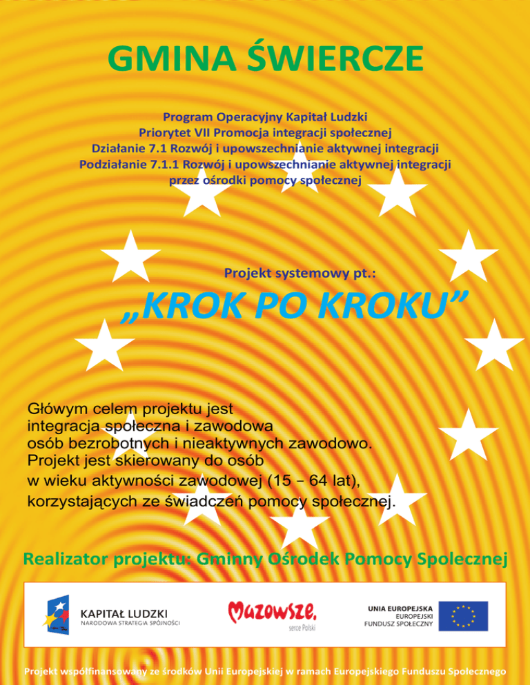 GMINA ŒWIERCZE Program Operacyjny Kapita³ Ludzki Priorytet VII Promocja integracji spo³ecznej Dzia³anie 7.1 Rozwój i upowszechnianie aktywnej integracji Podzia³anie 7.1.1 Rozwój i upowszechnianie aktywnej integracji przez oœrodki pomocy spo³ecznej Projekt systemowy pt.: „KROK PO KROKU” G³ówym celem projektu jest integracja spo³eczna i zawodowa osób bezrobotnych i nieaktywnych zawodowo. Projekt jest skierowany do osób w wieku aktywnoœci zawodowej (15 – 64 lat), korzystaj¹cych ze œwiadczeñ pomocy spo³ecznej. Realizator projektu: Gminny Oœrodek Pomocy Spolecznej Projekt wspó³finansowany ze œrodków Unii Europejskiej w ramach Europejskiego Funduszu Spo³ecznego czne j Spole i n m n G y : O u t œ k r e o j d o r e k p r P o o t mocy a z i l a e R GMINA ŒWIERCZE Program Operacyjny Kapita³ Ludzki Priorytet VII Promocja integracji spo³ecznej Dzia³anie 7.1 Rozwój i upowszechnianie aktywnej integracji Podzia³anie 7.1.1 Rozwój i upowszechnianie aktywnej integracji przez oœrodki pomocy spo³ecznej Projekt systemowy pt.: „KROK PO KROKU” G³ówym celem projektu jest: integracja spo³eczna i zawodowa osób bezrobotnych i nieaktywnych zawodowo. Projekt jest skierowany do osób w wieku aktywnoœci zawodowej (15 – 64 lat), korzystaj¹cych ze œwiadczeñ pomocy spo³ecznej. Projekt wspó³finansowany ze œrodków Unii Europejskiej w ramach Europejskiego Funduszu Spo³ecznego