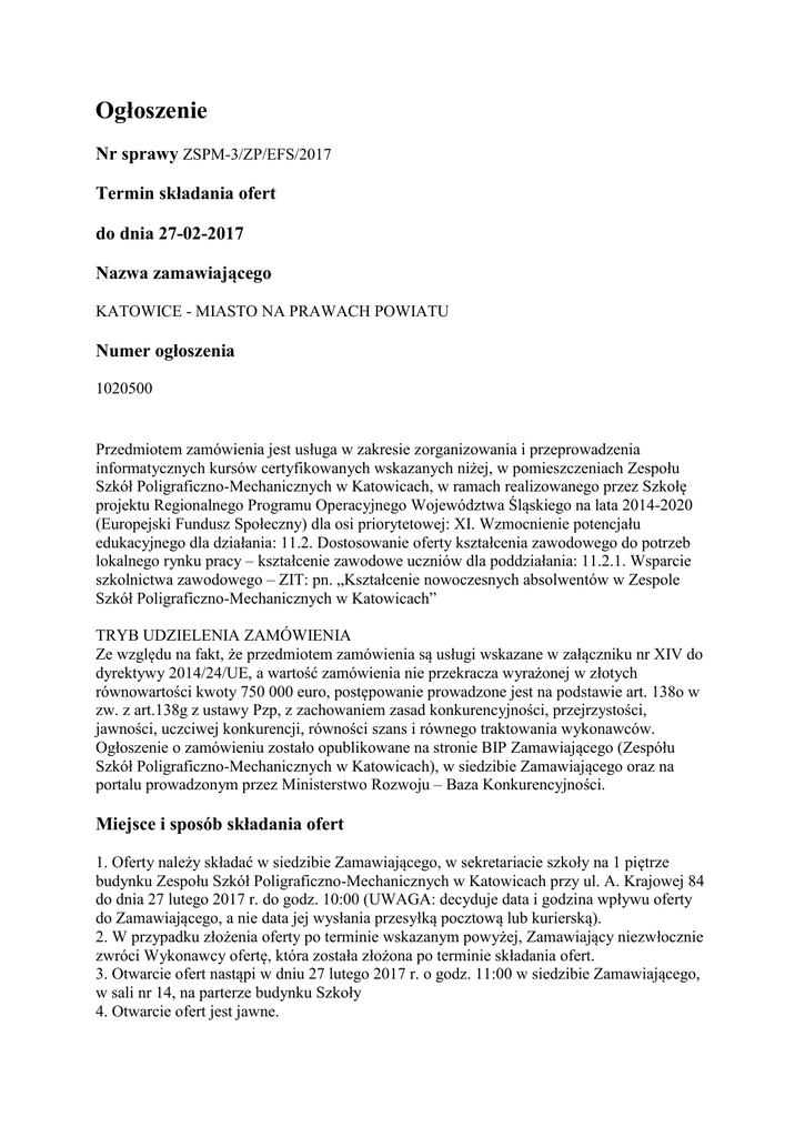 Ogłoszenie Nr sprawy ZSPM-3/ZP/EFS/2017 Termin składania ofert do dnia 27-02-2017 Nazwa zamawiającego KATOWICE - MIASTO NA PRAWACH POWIATU Numer ogłoszenia 1020500 Przedmiotem zamówienia jest usługa w zakresie zorganizowania i przeprowadzenia informatycznych kursów certyfikowanych wskazanych niżej, w pomieszczeniach Zespołu Szkół Poligraficzno-Mechanicznych w Katowicach, w ramach realizowanego przez Szkołę projektu Regionalnego Programu Operacyjnego Województwa Śląskiego na lata 2014-2020 (Europejski Fundusz Społeczny) dla osi priorytetowej: XI. Wzmocnienie potencjału edukacyjnego dla działania: 11.2. Dostosowanie oferty kształcenia zawodowego do potrzeb lokalnego rynku pracy – kształcenie zawodowe uczniów dla poddziałania: 11.2.1. Wsparcie szkolnictwa zawodowego – ZIT: pn. „Kształcenie nowoczesnych absolwentów w Zespole Szkół Poligraficzno-Mechanicznych w Katowicach” TRYB UDZIELENIA ZAMÓWIENIA Ze względu na fakt, że przedmiotem zamówienia są usługi wskazane w załączniku nr XIV do dyrektywy 2014/24/UE, a wartość zamówienia nie przekracza wyrażonej w złotych równowartości kwoty 750 000 euro, postępowanie prowadzone jest na podstawie art. 138o w zw. z art.138g z ustawy Pzp, z zachowaniem zasad konkurencyjności, przejrzystości, jawności, uczciwej konkurencji, równości szans i równego traktowania wykonawców. Ogłoszenie o zamówieniu zostało opublikowane na stronie BIP Zamawiającego (Zespółu Szkół Poligraficzno-Mechanicznych w Katowicach), w siedzibie Zamawiającego oraz na portalu prowadzonym przez Ministerstwo Rozwoju – Baza Konkurencyjności. Miejsce i sposób składania ofert 1. Oferty należy składać w siedzibie Zamawiającego, w sekretariacie szkoły na 1 piętrze budynku Zespołu Szkół Poligraficzno-Mechanicznych w Katowicach przy ul. A. Krajowej 84 do dnia 27 lutego 2017 r. do godz. 10:00 (UWAGA: decyduje data i godzina wpływu oferty do Zamawiającego, a nie data jej wysłania przesyłką pocztową lub kurierską). 2. W przypadku złożenia oferty po terminie wskazanym powyżej, Zamawiający niezwłocznie zwróci Wykonawcy ofertę, która została złożona po terminie składania ofert. 3. Otwarcie ofert nastąpi w dniu 27 lutego 2017 r. o godz. 11:00 w siedzibie Zamawiającego, w sali nr 14, na parterze budynku Szkoły 4. Otwarcie ofert jest jawne. Osoba do kontaktu w sprawie ogłoszenia Zamawiający wyznacza do kontaktowania się z Wykonawcami następujących pracowników Zespołu Szkół Poligraficzno-Mechanicznych: Andrzej Szromek, Izabella Jarzmik. Nr telefonu osoby upoważnionej do kontaktu w sprawie ogłoszenia Andrzej Szromek tel. 503 309 390, Izabella Jarzmik tel. 501 255 583 Skrócony opis przedmiotu zamówienia Przedmiotem zamówienia jest usługa w zakresie zorganizowania i przeprowadzenia informatycznych kursów certyfikowanych wskazanych niżej, w pomieszczeniach Zespołu Szkół Poligraficzno-Mechanicznych w Katowicach : 1. Kursy certyfikowane AutoCad zakończone egzaminem na tytuł Autodesk Certified Userdla uczniów łącznie 60 godzin, 2 grupy po 10 osób 2. Kurs certyfikowany Microsoft - MS 20411 „Administrowanie Windows Server 2012” zakończony egzaminem MS72411- dla uczniów, łącznie 40 godzin, 1 grupa 10 osób 3. Kursy certyfikowane Microsoft - Kurs Microsoft MS 20461 „Wykonywanie zapytań do Microsoft SQL Server” zakończony egzaminem MS72461- dla uczniów, łącznie 40 godzin, 2 grupy po 10 osób, 4. Kursy certyfikowane Microsoft - Kurs Microsoft MS 20480 „Projektowanie aplikacji webowych za pomocą HTML5, JavaScript i CSS3” zakończony egzaminem MS72480- dla uczniów, łącznie 40 godzin, 1 grupa 10 osób, 5. Kursy certyfikowane Novell - Kurs administrator Novell SUSE Linux Enterprise 12 NW 3124 „Administracja SUSE Linux Enterprise” 12 zakończony egzaminem 050-733 - dla uczniów, łącznie 40 godzin, 2 grupy po 12 osób Kategoria ogłoszenia Usługi Podkategoria ogłoszenia Usługi szkoleniowe Miejsce realizacji zamówienia Województwo: śląskie Powiat: Katowice Miejscowość: Katowice Opis przedmiotu zamówienia Cel zamówienia Celem zamówienia jest poniesienie efektywności i skuteczności kształcenia zawodowego w Zespole Szkół PoligraficznoMechanicznych w Katowicach poprzez wzmocnienie potencjału kadrowego i technicznego szkoły, poszerzenie oferty edukacyjnej kierowanej do uczennic/uczniów szkoły oraz efektywną współpracę z otoczeniem społeczno-gospodarczym szkoły Przedmiot zamówienia 1. Przedmiotem zamówienia jest usługa w zakresie zorganizowania i przeprowadzenia informatycznych kursów certyfikowanych wskazanych niżej, w pomieszczeniach Zespołu Szkół Poligraficzno-Mechanicznych w Katowicach: a. Kursy certyfikowane AutoCad zakończone egzaminem na tytuł Autodesk Certified Userdla uczniów łącznie 60 godzin, 2 grupy po 10 osób b. Kurs certyfikowany Microsoft - MS 20411 „Administrowanie Windows Server 2012” zakończony egzaminem MS72411- dla uczniów, łącznie 40 godzin, 1 grupa 10 osób c. Kursy certyfikowane Microsoft - Kurs Microsoft MS 20461 „Wykonywanie zapytań do Microsoft SQL Server” zakończony egzaminem MS72461- dla uczniów, łącznie 40 godzin, 2 grupy po 10 osób, d. Kursy certyfikowane Microsoft - Kurs Microsoft MS 20480 „Projektowanie aplikacji webowych za pomocą HTML5, JavaScript i CSS3” zakończony egzaminem MS72480- dla uczniów, łącznie 40 godzin, 1 grupa 10 osób, e. Kursy certyfikowane Novell - Kurs administrator Novell SUSE Linux Enterprise 12 NW 3124 „Administracja SUSE Linux Enterprise” 12 zakończony egzaminem 050-733 - dla uczniów, łącznie 40 godzin, 2 grupy po 12 osób 2. W ramach szkolenia Wykonawca zobowiązany jest do przygotowania sali wykładowej (pomieszczania mieszczące się w budynkach ZSPM przy ul. Armii Krajowej 84, zapewnienia materiałów szkoleniowych dla każdego uczestnika, zorganizowanie poczęstunku kawowego, a także przygotowania imiennych świadectw ukończenia kursu wraz