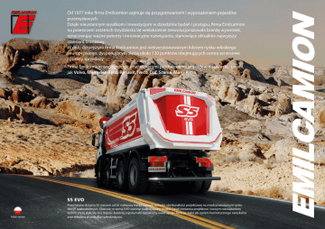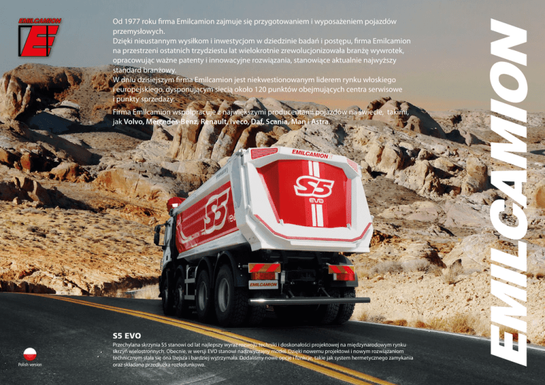 Od 1977 roku firma Emilcamion zajmuje się przygotowaniem i wyposażeniem pojazdów przemysłowych. Dzięki nieustannym wysiłkom i inwestycjom w dziedzinie badań i postępu, firma Emilcamion na przestrzeni ostatnich trzydziestu lat wielokrotnie zrewolucjonizowała branżę wywrotek, opracowując ważne patenty i innowacyjne rozwiązania, stanowiące aktualnie najwyższy standard branżowy. W dniu dzisiejszym firma Emilcamion jest niekwestionowanym liderem rynku włoskiego i europejskiego, dysponującym siecią około 120 punktów obejmujących centra serwisowe i punkty sprzedaży. Firma Emilcamion współpracuje z największymi producentami pojazdów na świecie, takimi, jak Volvo, Mercedes-Benz, Renault, Iveco, Daf, Scania, Man i Astra. S5 EVO Polish version Przechylana skrzynia S5 stanowi od lat najlepszy wyraz rozwoju techniki i doskonałości projektowej na międzynarodowym rynku skrzyń wielostronnych. Obecnie, w wersji EVO stanowi nadzwyczajny model. Dzięki nowemu projektowi i nowym rozwiązaniom technicznym stała się ona lżejsza i bardziej wytrzymała. Dodaliśmy nowe opcje i funkcje, takie jak system hermetycznego zamykania oraz składana przedłużka rozładunkowa. M5 - S5 TRIPOST Przechylane skrzynie typu S5 i M5 są wyposażone w 1 cylinder hydrauliczny przedniego podnoszenia; dolna rama jest wykonana zgodnie z zaleceniami producentów i posiada krzyżak tylnego wzmocnienia oraz system przechylania z poszerzoną obrotową burtą tylną tak, aby zwiększyć stabilność podczas przechylania. Układ hydrauliczny umożliwia przechylenie i otwarcie burty z wnętrza kabiny. TRIPOST to jednocześnie tylna skrzynia i trójstronna nadbudowa; hydrauliczny cylinder przedniego podnoszenia wahliwego z trzech stron i 2 tylne cylindry napędowe, uruchamiające się tylko w trakcie przechyłu bocznego, sprawiają, że TRIPOST odznacza się tymi zaletami. T5 P6 Trójstronna przechylana skrzynia wyposażona w cylinder podnoszenia umieszczony pod skrzynią stanowi od zawsze najbardziej wszechstronne rozwiązanie stosowane w budownictwie, transporcie i pracach naziemnych. Właśnie ze względu na swoją wszechstronność zastosowania, trójstronna skrzynia przechylana stanowi sztandarowy produkt firmy Emilcamion. W tym zakresie nasza firma zainwestowała w nowe rozwiązania konstrukcyjne, mające na celu zachowanie niezawodności roboczej przy jednoczesnym zwiększeniu lekkości i dodaniu nowych funkcji. Model tylnej wywrotki P6 powstał w celu zaspokojenia potrzeb klientów wymagających tylnej przechylanej nadbudowy wyposażonej w przedni cylinder (co oznacza niski środek ciężkości) i prostolinijną powierzchnię załadunkową, umożliwiającą maksymalne wykorzystanie szerokości. Model P6 dziedziczy technologię wersji S5 (ta sama dolna rama i system przechylania) oraz wymiary wewnętrzne modelu T5 w wersji z otwieraną książkowo tylną burtą. Model P6 został tak opracowany w taki sposób, aby mógł być realizowany w zestawie z demontowaną podłogą i bocznymi i tylnymi burtami. Umożliwia to ekonomiczny transport na rynku krajowym i międzynarodowym. EMILCAMION srl • via dell’Industria 1 - 40050 Argelato, Bologna • WŁOCHY Telefon +39 051 6633911 Faks +39 051 6633922 Niniejsza prezentacja została zredagowana w Państwa języku. Ewentualna korespondencja może odbywać się w j. angielskim. Dziękujemy za uwagę. [email protected] www.emilcamion.it