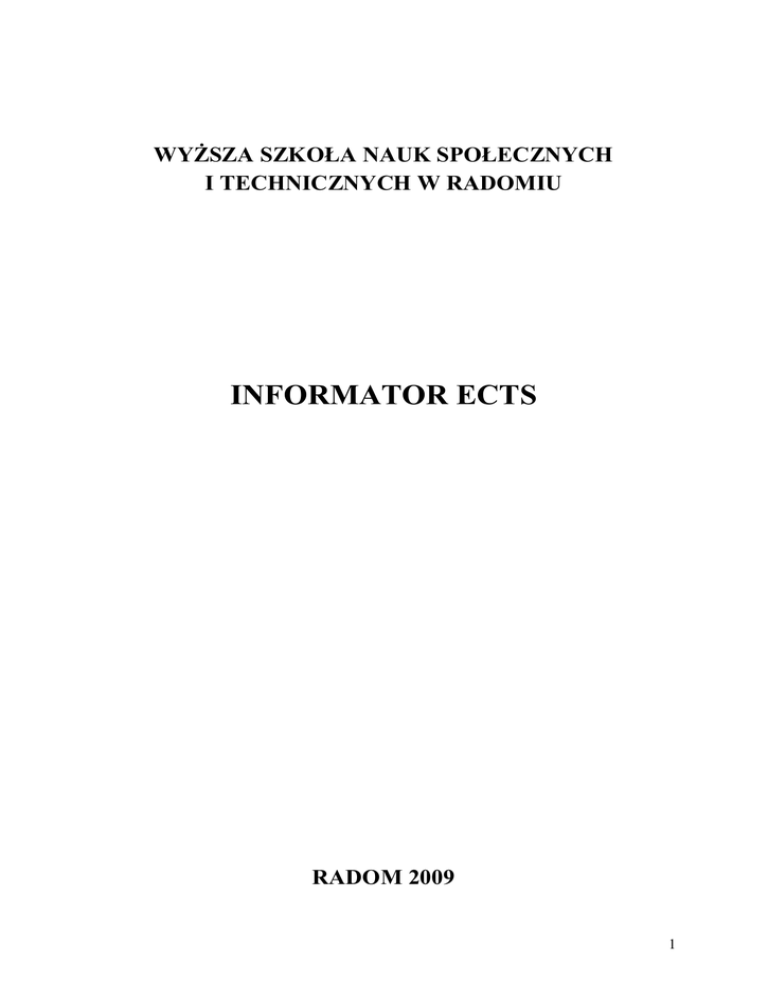 WYŻSZA SZKOŁA NAUK SPOŁECZNYCH I TECHNICZNYCH W RADOMIU INFORMATOR ECTS RADOM 2009 1 SPIS TREŚCI 1. Po co i skąd ECTS ? 2. Karta bolońska 3. Informacje o szkole 4. Baza dydaktyczna 5. Misja Uczelni 6. Relacje z otoczeniem 7. Władze uczelni 8. Oferta dydaktyczna 9. Charakterystyka kierunków 10. Czesne 11. Studia podyplomowe 12. Regulamin praktyk 13. Program praktyk poszczególnych kierunków 14. Charakterystyka programu Erasmus 15. Stosowane metody dydaktyczne i organizacja kształcenia 16. Nauka j. obcych 17. Niepełnosprawni w WSNSIT 18. Konsultacje 19. Zasady dyplomowania 20. Sprawy studenckie 21. Działalność społeczna 2 PO CO I SKĄD ECTS ? Europejski System Transferu Punktów (ECTS od angielskiej nazwy European Credit Transfer System) jest od 1989 roku wprowadzany w szkołach wyższych krajów Europy Zachodniej. Opracowany został z myślą o ułatwieniu dostępu do informacji o programach studiów w uczelniach zagranicznych oraz usprawnieniu wymiany studentów między uczelniami. Każda uczelnia, która chce brać udział w wymianie studentów, przygotowuje informator o studiach, zawierający m.in. plan studiów oraz opisy poszczególnych przedmiotów wraz z przypisanymi im punktami. W związku z postanowieniami Deklaracji Bolońskiej (1999), zaistniała potrzeba stworzenia systemu akumulacji punktów takich jak w ECTS. Wynikiem komunikatu praskiego (2001), a następnie konferencji w Zurichu (2002) było zatwierdzenie ECTS, jako systemu transferu i akumulacji punktów. Komunikat berliński (http://www.bologna-berlin2003.de) z września 2003 podkreślił, że ECTS stanowi podstawę narodowych systemów akumulacji punktów. Obecnie, na podstawie podpisanych porozumień akronim ECTS (European Credit Transfer and Accumulation System) jest rozumiany jako system transferu i akumulacji punktów a w przyszłości prawdopodobnie jako system akumulacji wraz z narzędziami służącymi do transferu. Punkty ECTS są względnym miernikiem nakładu pracy studenta potrzebnej do zaliczenia danego przedmiotu. Ustalane są na podstawie całkowitego obciążenia studenta, a nie tylko na podstawie liczby godzin zajęć. Ilość pracy wymaganej w całym roku akademickim odpowiada 60 punktom ECTS; na semestr przypada średnio 30 punktów. Studentowi, pragnącemu odbyć część swoich studiów w innej uczelni, system punktowy umożliwia rozsądny wybór zajęć ze względu na wkład wymaganej pracy. Oczywiście, student powinien wybrać program zbliżony do programu studiów w uczelni macierzystej, kierując się opisem poszczególnych przedmiotów przedstawionych w informatorze o studiach na danej uczelni. W przypadku wyjazdu studenta na inną uczelnię przygotowuje się dla niego wykaz zaliczeń przed jego wyjazdem i po powrocie. Punkty przyznawane są po uzyskaniu zaliczenia przedmiotu, ale na uczelni macierzystej nie wpisuje się ich do indeksu. Punkty za przedmioty zaliczone za granicą zastępują punkty, które student uzyskałby normalnie w uczelni macierzystej. Podstawowe zasady ECTS: Zasady systemu są wspólne dla wszystkich rodzajów i form prowadzenia studiów. Przydziałem punktów są objęte wszystkie przewidziane programem przedmioty oraz elementy programu studiów, które podlegają ocenie. Punkty przypisywane są całym przedmiotom, a nie poszczególnym formom zajęć. Uzyskanie pozytywnych ocen z wszystkich zajęć wchodzących w skład danego przedmiotu w określonym semestrze (roku) jest równoznaczne z przypisaniem do indywidualnego konta studenta liczby wszystkich punktów przyporządkowanych temu przedmiotowi. Rok zajęć przewidzianych danym programem jest równoważny 60 punktom. Uzyskanie dyplomu, poza spełnieniem wymagań programowych, wymaga zdobycia liczby punktów proporcjonalnej do nominalnego czasu trwania studiów, np. trzyletnich studiów licencjackich jest to 3 x 60, czyli 180 punktów, a dla pięcioletnich studiów magisterskich 5 x 60 czyli 300 punktów. Kluczową rolę w systemie ECTS pełnią trzy dokumenty: 3 Pakiet informacyjny (Information package) zawiera ogólne informacje na temat uczelni przyjmującej, kalendarza akademickiego, procedur administracyjnych oraz szczegółowy opis programu studiów i dostępnych zajęć na jednym lub kilku (zwykle pokrewnych) kierunkach studiów. Opis ten dotyczy przede wszystkim formuły zajęć, ich problematyki, wymagań wstępnych, okresu trwania, sposobu oceny, wartości punktowej oraz innych istotnych danych na temat przedmiotów proponowanych przez uczestniczącą w systemie ECTS instytucję. Pakiet jest formą przewodnika dla studentów i nauczycieli akademickich w uczelniach partnerskich (tzn. takich, z którymi uczelnia macierzysta ma podpisaną umowę dwustronną). Winien być aktualizowany co rok i dostępny w formie elektronicznej oraz w wersji obcojęzycznej. Porozumienie o programie zajęć (Learning agreement) jest to rodzaj kontraktu pomiędzy studentem, a współpracującymi uczelniami (wysyłającą i przyjmującą). Porozumienie to musi zostać podpisane przez wszystkie strony przed wyjazdem studenta za granicę. Student zobowiązuje się w tym dokumencie do zrealizowania określonego programu zajęć wybranych z oferty uczelni przyjmującej. Zatwierdzając porozumienie uczelnia przyjmująca zobowiązuje się zapewnić studentowi udział w wymienionych tamże zajęciach, zaś uczelnia wysyłająca potwierdza wolę uznania zaliczonych przedmiotów według uzgodnionej punktacji i skali ocen zgodnej z systemem ECTS. Wykaz zaliczeń (Transcript of records) opisuje osiągnięcia studenta w nauce przed i po okresie studiów za granicą. W wykazie wymienione są wszystkie studiowane przedmioty, ilość zdobytych punktów oraz uzyskane oceny, przyznawane według skali ocen danej uczelni, a także według skali ocen ECTS. Wszelkie informacje o systemie punktowym (w tym formularze, które są potrzebne przy wymianie studentów) można otrzymać u uczelnianego koordynatora Procesu Bolońskiego i ECTS. Pom