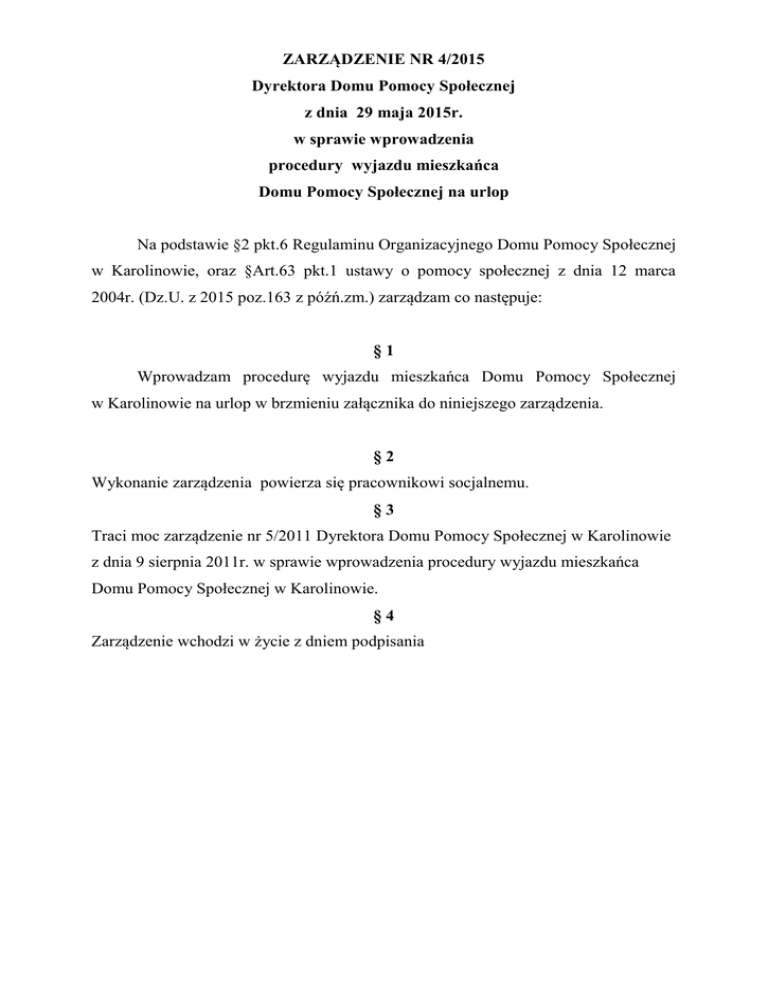 ZARZĄDZENIE NR 4/2015 Dyrektora Domu Pomocy Społecznej z