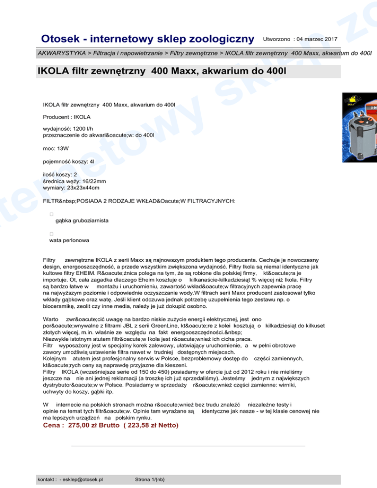Otosek - internetowy sklep zoologiczny p le Utworzono : 04 marzec 2017 o z AKWARYSTYKA > Filtracja i napowietrzanie > Filtry zewnętrzne > IKOLA filtr zewnętrzny 400 Maxx, akwarium do 400l k s IKOLA filtr zewnętrzny 400 Maxx, akwarium do 400l y w to IKOLA filtr zewnętrzny 400 Maxx, akwarium do 400l Producent : IKOLA wydajność: 1200 l/h przeznaczenie do akwariów: do 400l e n r e t n moc: 13W pojemność koszy: 4l ilość koszy: 2 średnica węży: 16/22mm wymiary: 23x23x44cm FILTR POSIADA 2 RODZAJE WKŁADÓW FILTRACYJNYCH: � gąbka gruboziarnista � wata perlonowa Filtry zewnętrzne IKOLA z serii Maxx są najnowszym produktem tego producenta. Cechuje je nowoczesny design, energooszczędność, a przede wszystkim zwiększona wydajność. Filtry Ikola są niemal identyczne jak kultowe filtry EHEIM. Różnica polega na tym, że są robione dla polskiej firmy, która je importuje. Ot, cała zagadka dlaczego Eheim kosztuje o kilkanaście-kilkadziesiąt % więcej niż Ikola. Filtry są bardzo łatwe w montażu i uruchomieniu, zawartość wkładów filtracyjnych zapewnia pracę na najwyższym poziomie i odpowiednie oczyszczanie wody.W filtrach serii Maxx producent zastosował tylko wkłady gąbkowe oraz watę. Jeśli klient odczuwa jednak potrzebę uzupełnienia tego zestawu np. o bioceramikę, zeolit czy inne media, należy je już dokupić osobno. Warto zwrócić uwagę na bardzo niskie zużycie energii elektrycznej, jest ono porównywalne z filtrami JBL z serii GreenLine, które z kolei kosztują o kilkadziesiąt do kilkuset złotych więcej, m.in. właśnie ze względu na fakt energooszczędności. Niezwykle istotnym atutem filtrów Ikola jest również ich cicha praca. Filtr wyposażony jest w specjalny korek zalewowy, ułatwiający uruchomienie, a w pełni obrotowe zawory umożliwią ustawienie filtra nawet w trudniej dostępnych miejscach. Kolejnym atutem jest profesjonalny serwis w Polsce, bezproblemowy dostęp do części zamiennych, których ceny są naprawdę przyjazne dla kieszeni. Filtry IKOLA (wcześniejsze serie od 150 do 450) posiadamy w ofercie już od 2012 roku i nie mieliśmy jeszcze na nie ani jednej reklamacji (a troszkę ich już sprzedaliśmy). Jesteśmy jednym z największych dystrybutorów w Polsce. Posiadamy w sprzedaży również części zamienne: wirniki, uchwyty do koszy, gąbki itp. W internecie na polskich stronach można również bez trudu znaleźć niezależne testy i opinie na temat tych filtrów. Opinie tam wyrażane są identyczne jak nasze - w tej klasie cenowej nie ma lepszych urządzeń na polskim rynku. Cena : 275,00 zł Brutto ( 223,58 zł Netto) kontakt : - [email protected] Strona 1/{nb} Model : CF- Otosek - internetowy sklep zoologiczny p le Utworzono : 04 marzec 2017 o z AKWARYSTYKA > Filtracja i napowietrzanie > Filtry zewnętrzne > IKOLA filtr zewnętrzny 400 Maxx, akwarium do 400l k s IKOLA filtr zewnętrzny 400 Maxx, akwarium do 400l y w to Dostępność: Produkt dostępny w naszym sklepie od 13 maj 2016 e n r e t n kontakt : - [email protected] Strona 2/{nb}