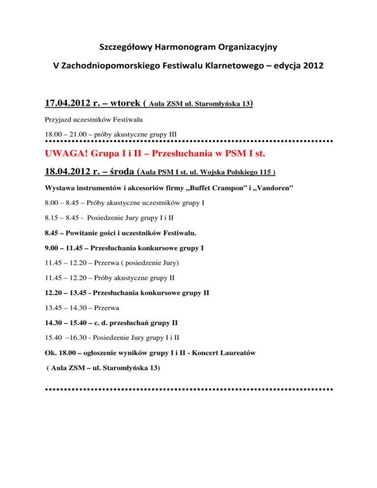 Szczegółowy Harmonogram Organizacyjny V Zachodniopomorskiego Festiwalu Klarnetowego – edycja 2012 17.04.2012 r. – wtorek ( Aula ZSM ul. Staromłyńska 13) Przyjazd uczestników Festiwalu 18.00 – 21.00 – próby akustyczne grupy III UWAGA! Grupa I i II – Przesłuchania w PSM I st. 18.04.2012 r. – środa (Aula PSM I st. ul. Wojska Polskiego 115 ) Wystawa instrumentów i akcesoriów firmy „Buffet Crampon” i „Vandoren” 8.00 – 8.45 – Próby akustyczne uczestników grupy I 8.15 – 8.45 - Posiedzenie Jury grupy I i II 8.45 – Powitanie gości i uczestników Festiwalu. 9.00 – 11.45 – Przesłuchania konkursowe grupy I 11.45 – 12.20 – Przerwa ( posiedzenie Jury) 11.45 – 12.20 – Próby akustyczne grupy II 12.20 – 13.45 - Przesłuchania konkursowe grupy II 13.45 – 14.30 – Przerwa 14.30 – 15.40 – c. d. przesłuchań grupy II 15.40 –16.30 - Posiedzenie Jury grupy I i II Ok. 18.00 – ogłoszenie wyników grupy I i II - Koncert Laureatów ( Aula ZSM – ul. Staromłyńska 13) Grupa III 18.04.2012 r. – środa (Aula ZSM ul. Staromłyńska 13) Wystawa instrumentów i akcesoriów firmy „Selmer” i „Yamaha” 8.00 – 9.30 – Próby akustyczne uczestników grupy III ( występ w godz. 10.30 – 13.00) 9.00 – 10.00 - Posiedzenie Jury 10.00 – Oficjalne otwarcie Festiwalu. 10.30 – 13.00 – Przesłuchania konkursowe grupy III – soliści 13.00 – 14.30 - Przerwa 13.00 – 14.30 – Próby akustyczne uczestników grupy III ( występ w godz. 14.30 – 16.00) 14.30 – 16.00 – c.d. przesłuchań grupy III – soliści 16.00 – 18.00 – Próby akustyczne grupy III ( występ w dniu 19.04.2012r.) 18.00 – Ogłoszenie wyników grupy I i II i Koncert Laureatów ( Aula ZSM) 19.30 – Koncert Inauguracyjny Festiwalu (Sala Anny Jagiellonki - Zamek Książąt Pomorskich) Gwiazda Festiwalu - Florent Heau (Francja) – klarnet, Karolina Stańczyk – fortepian Zespół rytmiki ZSM w Szczecinie przygotowany pod kierunkiem Artemidy Ikonomu – Cichockiej Główny Sponsor Koncertu – Buffet Crampon ok. 21.00 – Kolacja 19.04.2012 r. - czwartek (Aula ZSM ul. Staromłyńska 13) Wystawa instrumentów i akcesoriów firmy „Buffet Crampon” i „Vandoren” Wystawa instrumentów i akcesoriów Firmy „Selmer” i „Yamaha” 8.00 – 9.30 – Próby akustyczne grupy III – soliści ( występ w godz. 10.00 – 12.00) 10.00 – 12.00 – Przesłuchania konkursowe grupy III – soliści 12.00 – 13.00 – Posiedzenie Jury grupy III 12.00 – 13.00 – Wykład na temat: „Klarnet i fortepian - Polska Muzyka Kameralna od Dobrzyńskiego do Góreckiego” Prowadzenie dr hab. Roman Widaszek – AM Katowice ( Sala Kameralna ZSM) 13.00 – 14.30 – Przerwa 13.00 – 14.30 – Próby akustyczne grupy III –soliści i zespoły kameralne (występ w godz. 14.30 – 16.30) 14.30 – 17.00 – c.d. przesłuchań grupy III –soliści i zespoły kameralne 17.00 – 18.00 – Posiedzenie Jury grupy III 15.00 – 18.00 – Master Class – prowadzenie prof. Patric Messina - Francja (Sala Kameralna ZSM) 18.00 – 19.00 – Kolacja 19.00 – 20.00 – Koncert przy świecach ( Sala koncertowa Akademii Sztuki, Plac Orła Białego 1) Mozartowski Zespół Bassethornowy Roman Widaszek - bassethorn Paweł Krauzowicz - bassethorn Bogdan Ocieszak - bassethorn Grzegorz Wieczorek - klarnet Radosław Herdzik - klarnet Ok. godz. 20.30 – Ogłoszenie wyników grupy III i Koncert Laureatów ( Aula ZSM) 20.04.2012 r. - piątek ( Aula ZSM ul. Staromłyńska 13) Wystawa instrumentów i akcesoriów firmy „Buffet Crampon” i „Vandoren” Wystawa instrumentów i akcesoriów Firmy „Selmer” i „Yamaha” 8.00 – 9.30 – Próby akustyczne grupy IV- soliści ( występ w godz. 9.30 – 13.00) 9.30 – 10.00 – Posiedzenie Jury grupy IV 10.00 – 13.00 – Przesłuchania konkursowe grupy IV - soliści 9.30 – 11.30 – Warsztaty klarnetowe dla uczniów i nauczycieli ( lekcje otwarte) Prowadzenie dr hab. Roman Widaszek – AM Katowice ( Sala Kameralna ZSM) 12.15 -13.00 – Pokaz Multimedilany RICO ( Sala kameralna ZSM ) 13.00 – 14.30 – Przerwa 13.00 - 14.30- Próby akustyczne grupy IV – soliści ( występ w godz. 14.30 – 17.30) 14.30 – 17.15 – c.d. przesłuchań grupy IV- soliści 15.30 – 17.30 - Warsztaty klarnetowe dla studentów i pedagogów Akademii Muzycznych (lekcje otwarte) Prowadzenie dr hab. Roman Widaszek – AM Katowice ( Sala Kameralna ZSM) 19.00 – 21.00 – Koncert Festiwalowy ( Filharmonia Szczecińska) Orkiestra Symfoniczna Filharmonii im. Mieczysława Karłowicza w Szczecinie Solista – Patrick Messina (Francja) Dyrygent – Mykola Diadiura (Ukraina) Ok. 21.30 – kolacja 21.04.2012 r. sobota (Aula ZSM ul. Staromłyńska 13) Wystawa instrumentów i akcesoriów firmy „Buffet Crampon” i „Vandoren” Wystawa instrumentów i akcesoriów Firmy „Selmer” i „Yamaha” 8.00 – 9.15 – Próby akustyczne grupy IV – soliści ( występ w godz. 10.00 – 13.00) 8.30 – 9.30 – Posiedzenie Jury grupy IV 9.30 – 13.00 – Przesłuchania konkursowe grupy IV - soliści 13.00 – 14.30 – Przerwa 14.30 - 16.15– c. d. przesłuchań grupy IV - soliści 16.15 – 17.00 – Posiedzenie Jury grupy IV 17.00 – 19.00 – Master Class - prowadzenie prof. Guy Dangain - Francja ( Aula ZSM) 19.30 – Ogłoszenie wyników grupy IV (soliści) i Koncert Laureatów 20.30– Kolacja 22.04.2012 r. niedziela ( Aula ZSM ul. Staromłyńska 13) 8.00 – 9.00 – Próby akustyczne grupy IV – zespoły kameralne 9.00- 11.15 – Przesłuchania konkursowe grupy IV – zespoły kameralne 11.15 – 13.00 – Posiedzenie Jury grupy IV 13.00 –14.00 – Przerwa 14.00 - Ogłoszenie wyników grupy IV- zespoły kameralne ( Aula ZSM ) 14.15 - Zakończenie Festiwalu i Koncert Laureatów grupy IV ( zespoły kameralne)