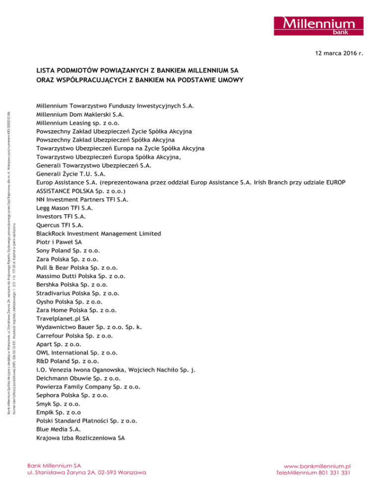 12 marca 2016 r. Numer identyfikacji podatkowej (NIP): 526-02-12-931. Wysokość kapitału zakładowego: 1 213 116 777,00 zł. Kapitał w pełni wpłacony. Bank Millennium Spółka Akcyjna z siedzibą w Warszawie, ul. Stanisława Żaryna 2A, wpisana do Krajowego Rejestru Sądowego prowadzonego przez Sąd Rejonowy dla m. st. Warszawy pod numerem KRS 0000010186. LISTA PODMIOTÓW POWIĄZANYCH Z BANKIEM MILLENNIUM SA ORAZ WSPÓŁPRACUJĄCYCH Z BANKIEM NA PODSTAWIE UMOWY Millennium Towarzystwo Funduszy Inwestycyjnych S.A. Millennium Dom Maklerski S.A. Millennium Leasing sp. z o.o. Powszechny Zakład Ubezpieczeń Życie Spółka Akcyjna Powszechny Zakład Ubezpieczeń Spółka Akcyjna Towarzystwo Ubezpieczeń Europa na Życie Spółka Akcyjna Towarzystwo Ubezpieczeń Europa Spółka Akcyjna, Generali Towarzystwo Ubezpieczeń S.A. Generali Życie T.U. S.A. Europ Assistance S.A. (reprezentowana przez oddział Europ Assistance S.A. Irish Branch przy udziale EUROP ASSISTANCE POLSKA Sp. z o.o.) NN Investment Partners TFI S.A. Legg Mason TFI S.A. Investors TFI S.A. Quercus TFI S.A. BlackRock Investment Management Limited Piotr i Paweł SA Sony Poland Sp. z o.o. Zara Polska Sp. z o.o. Pull & Bear Polska Sp. z o.o. Massimo Dutti Polska Sp. z o.o. Bershka Polska Sp. z o.o. Stradivarius Polska Sp. z o.o. Oysho Polska Sp. z o.o. Zara Home Polska Sp. z o.o. Travelplanet.pl SA Wydawnictwo Bauer Sp. z o.o. Sp. k. Carrefour Polska Sp. z o.o. Apart Sp. z o.o. OWL International Sp. z o.o. R&D Poland Sp. z o.o. I.O. Venezia Iwona Oganowska, Wojciech Nachiło Sp. j. Deichmann Obuwie Sp. z o.o. Powierza Family Company Sp. z o.o. Sephora Polska Sp. z o.o. Smyk Sp. z o.o. Empik Sp. z o.o Polski Standard Płatności Sp. z o.o. Blue Media S.A. Krajowa Izba Rozliczeniowa SA Bank Millennium SA ul. Stanisława Żaryna 2A, 02-593 Warszawa www.bankmillennium.pl TeleMillennium 801 331 331