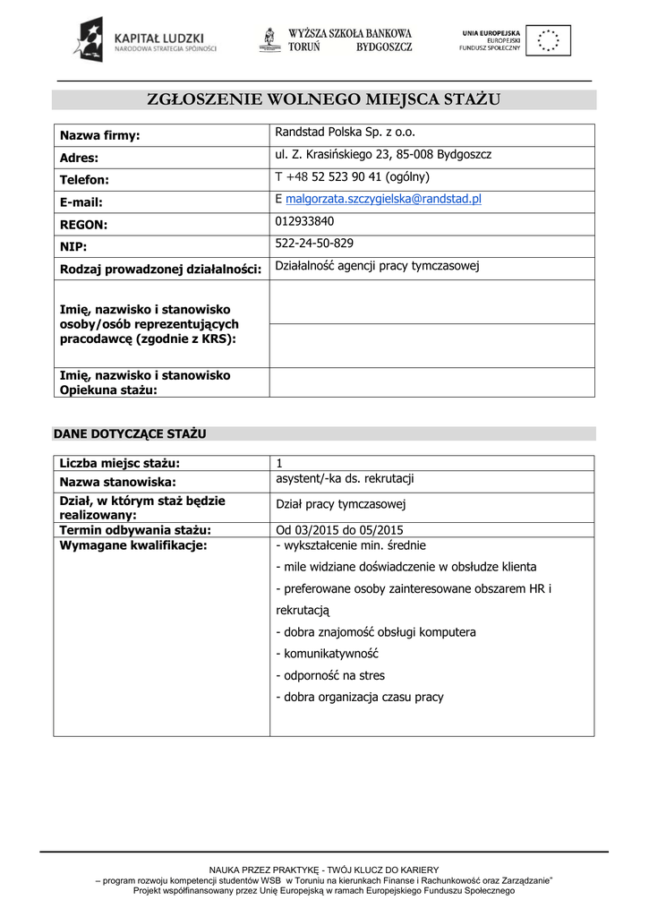 ZGŁOSZENIE WOLNEGO MIEJSCA STAŻU Nazwa firmy: Randstad Polska Sp. z o.o. Adres: ul. Z. Krasińskiego 23, 85-008 Bydgoszcz Telefon: T +48 52 523 90 41 (ogólny) E-mail: E [email protected] REGON: 012933840 NIP: 522-24-50-829 Rodzaj prowadzonej działalności: Działalność agencji pracy tymczasowej Imię, nazwisko i stanowisko osoby/osób reprezentujących pracodawcę (zgodnie z KRS): Imię, nazwisko i stanowisko Opiekuna stażu: DANE DOTYCZĄCE STAŻU Liczba miejsc stażu: Nazwa stanowiska: Dział, w którym staż będzie realizowany: Termin odbywania stażu: Wymagane kwalifikacje: 1 asystent/-ka ds. rekrutacji Dział pracy tymczasowej Od 03/2015 do 05/2015 - wykształcenie min. średnie - mile widziane doświadczenie w obsłudze klienta - preferowane osoby zainteresowane obszarem HR i rekrutacją - dobra znajomość obsługi komputera - komunikatywność - odporność na stres - dobra organizacja czasu pracy NAUKA PRZEZ PRAKTYKĘ - TWÓJ KLUCZ DO KARIERY – program rozwoju kompetencji studentów WSB w Toruniu na kierunkach Finanse i Rachunkowość oraz Zarządzanie” Projekt współfinansowany przez Unię Europejską w ramach Europejskiego Funduszu Społecznego Oświadczam, że: - zakład nie jest w stanie upadłości, likwidacji; - organizacja stażu dla skierowanego studenta nie będzie przyczyną zwolnień pracowników zatrudnionych w przedsiębiorstwie. SZCZEGÓŁOWY PROGRAM STAŻU Zakres obowiązków Stażysty - zapoznanie ze specyfiką działania agencji pracy tymczasowej udzielanie informacji kandydatom tworzenie ogłoszeń o pracę obsługa bazy danych kandydatów selekcja aplikacji wywiady telefoniczne z kandydatami prowadzenie spotkań rekrutacyjnych archiwizacja teczek personalnych uzupełnianie dokumentów kadrowych Wymiar godzinowy Liczba godzin dziennie: 6-8 Godziny pracy: od 9:00 do 17:00 Praca przy monitorze ekranowym co najmniej połowę dobowego wymiaru czasu pracy TAK x NIE □ Cele edukacyjne Nauka procesów rekrutacji i selekcji oraz zatrudnienia pracowników tymczasowych (zakładanie teczek personalnych, podstawy prawa pracy, selekcja CV, konstruowanie ogłoszeń rekrutacyjnych). NAUKA PRZEZ PRAKTYKĘ - TWÓJ KLUCZ DO KARIERY – program rozwoju kompetencji studentów WSB w Toruniu na kierunkach Finanse i Rachunkowość oraz Zarządzanie” Projekt współfinansowany przez Unię Europejską w ramach Europejskiego Funduszu Społecznego Zobowiązuję się do: - dostarczenia, wraz z wypełnionym Zgłoszeniem wolnego miejsca stażu, kserokopii wpisu do KRS - wzięcia udziału w spotkaniu informacyjnym dla studentów, podczas którego zostanie zaprezentowana firma/instytucja, którą reprezentuję ………………………….. Miejscowość i data …………………..………………………………….. Podpis osoby reprezentującej i pieczątka firm NAUKA PRZEZ PRAKTYKĘ - TWÓJ KLUCZ DO KARIERY – program rozwoju kompetencji studentów WSB w Toruniu na kierunkach Finanse i Rachunkowość oraz Zarządzanie” Projekt współfinansowany przez Unię Europejską w ramach Europejskiego Funduszu Społecznego