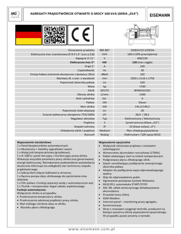 AGREGATY PR DOTWÓRCZE OTWARTE O MOCY 160 kVA (SERIA „014”) Oznaczenie produktu Elektryczna moc znamionowa (P.R.P.) 3~ (cos 0,8) Napi cie 3~/1~ Elektryczna moc 3~ Pr d 3~ Cz stotliwo Emisja ha asu (ci nienie akustyczne z dystansu 10m) Wymiary d . x szer. x wysoko Pojemno zbiornika paliwa Masa Silnik Obroty silnika Ilo cylindrów Paliwo Moc silnika Pojemno miski olejowej Zu ycie paliwa przy obci eniu 75%/100% Regulator obrotów Pr dnica Stopie ochrony Ch odzenie silnik / p dnica Rozruch Wyposa enie standardowe 1 x Panel bezpieczników automatycznych. 1 x Akustyczny + wietlny sygnalizator awarii. 1 x Wy cznik bezpiecze stwa (grzybkowy). 1 x IS-10(PL): panel steruj cy i monitoruj cy prac silnika. Wskazuje wszystkie parametry pracy silnika oraz generowanej energii elektrycznej. Ró nobarwne pod wietlenie wy wietlacza skutecznie informuje (na odleg ) stan techniczny zespo u pr dotwórczego. 1 x Sekcja klem (z cze kablowe) w skrzynce. 1 x R czna pompa oleju silnikowego do opró niania misy olejowej. 1 x Filtr paliwa z funkcj separacji wody z automatycznym wy . 1 x T umik + kompensator drga uk adu wydechowego. Funkcje automatyczne: Wy czenie silnika w przypadku: Przekroczenia temperatury silnika. Przekroczenia za onej pr dko ci pracy silnika. Zbyt niskiego ci nienia oleju w silniku. Wycieku p ynu ch odz cego. 985 807 kVA V kW A Hz dB(A) mm Ltr kg DEUTZ U/min Szt. ON kW Ltr l/h Typ S IP Medium Rodzaj 150014 ED-S/DEDA 160 (+10% przeci enia) 400/230 128 (moc ci a) 230 50 102 2503 x 1116 x 1756 520 1760 BF6M1013EC 1500 6 Diesel 142,2/149,2 20 28,9 / 38,5 Elektroniczny / Mechaniczny Synchroniczna (Klasa „G3”) 23 (klasa izolacji „H”) yn ch odz cy/powietrze Elektrostart / SZR opcja NS10 Wyposa enie opcjonalne Wy cznik ró nicowo-pr dowy z zestawem uziemiaj cym. Wzmocniony akumulator rozruchowy (170Ah). Pakiet u atwiaj cy start w niskich temperaturach. Podgrzewacz p ynu ch odz cego silnik. Zawór umo liwiaj cy pod czenie zewn trznego zbiornika paliwa. Adapter do pod czenia w a odprowadzaj cego spaliny. do odprowadzenia spalin. Ogrzewanie postojowe (zestaw Webasto). NS10 (PL): automatyka START/STOP. ASC-48: uk ad samoczynnego do adowywania akumulatora. Przewód mocy (10m). GSM-Modem. Internet-panel – monitoring pracy agregatu. Synchronizacja. Wraz z rozwojem osi gni techniki, producent na bie co poszerza ofert wyposa enia opcjonalnego. W przypadku pyta prosimy o kontakt. www.eisemann.com.pl Alarmy: Defekt pr dnicy, wype niony zanieczyszczeniami lub wod filtr separacyjny. Zalety: Czas pracy bez tankowania (na jednym zbiorniku) do 18 godzin przy 75% obci eniu agregatu. Doskona e parametry generowanego pr du (zaawansowana technologia AVR). Po zastosowaniu zaworu 3-dro nego i pod czenia zewn trznego zbiornika paliwa maksymalny czas nieprzerwanej pracy ograniczony jest tylko serwisem technicznym (olejowym). Agregat mo e by eksploatowany w temperaturze otoczenia -30 /+45°C (bez pakietu u atwiaj cego start silnika w niskich temperaturach 904 714) po zastosowaniu zimowego paliwa. Korzy ci z zastosowania opcji samoczynnego za czania rezerwy: automatyka pracuje w trybie ci ym w obie strony. Oznacza to, e uk ad zbiera potrzebne informacje z sieci i agregatu, przetwarza je i informuje administratora ró nym kolorem panelu IS10. Mo na zamontowa modem GSM i informowa za pomoc SMS. Szafka ze stali lakierowanej proszkowo, w której zainstalowane wszystkie elementy kontrolno-pomiarowe wraz z modu em IS/NS-10 (PL) opcja: zestaw styczników SZR. Tankowanie i obs uga serwisowa silnika tylko z jednej strony agregatu. Panel steruj cy IS/NS-10 (PL) umo liwia pe obs ug i monitoring parametrów pracy agregatu pr dotwórczego. Dobrze widoczny panel umieszczony w drzwiczkach u atwia kontrol pracy agregatu. W przypadku informacji ostrzegawczych lub alarmowych zmienia si kolorystyka pod wietlenia wy wietlacza Status kolorów pod wietlenia: kit – system w czony, zielony – prawid owa praca agregatu, czerwony – alarm awaria silnika/pr dnicy. www.eisemann.com.pl ty – alarm uwaga,