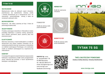 TYTAN 75 SG HERBICYDY SKUTECZNOŚĆ Środki do zwalczania chwastów. Błyskawicznie wnika do zielonych części chwastów, przemieszcza się systemicznie. Zwalcza miotłę i chwasty dwuliścienne już w temperaturze 5-6oC. Do stosowania powschodowego wiosną, a także we wczesnych zasiewach zbóż. BEZPIECZEŃSTWO Bezpieczny dla rośliny uprawnej od fazy 3 liścia do pierwszego kolanka zbóż. SELEKTYWNOŚĆ FUNGICYDY Środki do ochrony roślin przed chorobami. Produkty zawierające metsulfuron i tifensulfuron metylu posiadają rejestracje w pszenicy ozimej, pszenżycie, życie ozimym, jęczmieniu jarym, pszenicy jarej oraz pszenżycie jarym. INSEKTYCYDY ELASTYCZNOŚĆ Może być stosowany z innymi herbicydami co zwiększa skuteczność przy dużym nasileniu chwastów, np. do zwalczania przytulii może być stosowany w mieszaninie ze środkiem zawierającym fluroksypyr, a do zwalczania miotła ze środkami zawierającymi np. izoproturon lub chlorotoluron. Środki do ochrony roślin przed szkodnikami. KOMFORT Formulacja SG zapewnia natychmiastowe rozpuszczenie herbicydu w opryskiwaczu, dzięki czemu przygotowanie cieczy roboczej jest prostsze, a mycie opryskiwacza łatwiejsze i oszczędniejsze. INNVIGO Sp. z o.o. Al. Jerozolimskie 178 02-486 Warszawa tel. +48 (22) 468 26 70 email: [email protected] www.innvigo.com facebook.com/innvigo TWÓJ SKUTECZNY POMOCNIK! Zwalcza miotłę zbożową i chwasty dwuliścienne www.innvigo.com TYTAN 75 SG Tytan 75 SG Rekomendacje stosowanie herbicydu Tytan 75 SG w zależności od poziomu zachwaszczenia. Zachwaszczenie podstawowe (miotła zbożowa, chwasty dwuliścienne w tym przytulia) Powschodowy herbicyd zwalczający miotłę i chwasty dwuliścienne w zbożach ozimych, zawierający dwie wyjątkowo skuteczne i znakomicie uzupełniające się substancje aktywne. Metsulfuron i tifensulfuron metylu - połączone w nowoczesnej formulacji SG, tworzą herbicyd bezpieczny dla zbóż od najwcześniejszych faz rozwojowych, który błyskawicznie wnika do zielonych części chwastów. Silne występowanie miotły zbożowej. LISTA ZWALCZANYCH CHWASTÓW (DOŚWIADCZENIA WŁASNE) CHWAST CHWAST Miotła zbożowa +++ Komosa biała +++ Fiołek polny +++ Przetacznik perski ++ Gwiazdnica pospolita +++ Rdest powojowaty +++ Mak polny +++ Dymnica pospolita +++ Maruna bezwonna +++ Rumianek pospolity +++ Samosiewy rzepaku +++ Rzodkiew świerzepa +++ Bodziszek drobny +++ Gorczyca polna +++ Niezapominajka polna +++ Kurzyślad polny +++ Jasnota purpurowa +++ Sporek polny +++ Jasnota różowa +++ Chaber bławatek + Poziewnik szorstki +++ Ostrożeń polny + Tasznik pospolity +++ Przytulia czepna ++ Tobołki polne +++ Skuteczność: Wysoka +++ Średnia ++ Słaba + Informacje Dodatkowe PROFIL PRODUKTU WG ETYKIETY REJESTRACYJNEJ Stosowanie substancji o różnych mechanizmach działania w przedstawionych technologiach ochrony herbicydowej zwiększa skuteczność zabiegu, a także przeciwdziała powstawaniu odporności chwastów. ZWALCZANE CHWASTY Wrażliwe: chaber bławatek, fiołek polny, gwiazdnica pospolita, jasnota purpurowa, mak polny, maruna bezwonna, miotła zbożowa, niezapominajka polna, przetacznik trójlistkowy, przytulia czepna, samosiewy rzepaku, tasznik pospolity, tobołki polne. Średnio wrażliwe: przetacznik bluszczykowy, przetacznik perski. ZALECANA DAWKA Uwaga: przy sporządzaniu, a następnie stosowaniu mieszanin zbiornikowych z innymi produktami, należy przestrzegać zaleceń z etykiet produktów wchodzących w skład mieszaniny zbiornikowej. Warto zawsze zrobić próbę mieszania przed wykonaniem zabiegu. Pamiętaj! Ze środków ochrony roślin należy korzystać z zachowaniem bezpieczeństwa. Przed każdym użyciem przeczytaj informacje zamieszczone w etykiecie i informacje dotyczące produktu. Zwróć uwagę na zwroty wskazujące rodzaj zagrożenia oraz przestrzegaj środków bezpieczeństwa zamieszczonych w etykiecie. Silne występowanie miotły zbożowej, przytulii czepnej i innych chwastów dwuliściennych. Maksymalna dawka dla jednorazowego zastosowania: 90 g/ha. Zalecana dawka dla jednorazowego zastosowania: 70-90 g/ha. TERMIN STOSOWANIA W pszenicy ozimej, życie ozimym i pszenżycie ozimym środek stosować wiosną po ruszeniu wegetacji do fazy 1-go kolanka (BBCH 21-30). ZAREJESTROWANE MIESZANINY ZBIORNIKOWE Żyto ozime i pszenżyto ozime Tytan 75 SG 70 g/ha + GALAPER 200 EC 0,25 l/ha + Partner+ 0,5l/ha Tytan 75 SG 70 g/ha + HERBISTAR 200 EC 0,25 l/ha + Partner+ 0,5l/ha Tytan 75 SG 70 g/ha + FLUROHERB 200 EC0,25 l/ha + Partner+ 0,5l/ha REKOMENDOWANY ADIUWANT w warunkach niesprzyjających działaniu środka ASYSTENT+90 EC - w pszenicy ozimej Partner+ - w życie ozimym i pszenżycie ozimym * zaleca się stosowanie środka Tytan 75 SG z dodatkiem adiuwanta SILITOP w dawce 0,1 l/ha ZALECANA ILOŚĆ WODY: 200-300 l/ha ZALECANE OPRYSKIWANIE: Średniokropliste