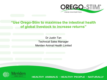 “Use Orego-Stim to maximise the intestinal health of global livestock to increase returns” Dr Justin Tan Technical Sales Manager Meriden Animal Health Limited Co to jest Orego-Stim® I dlaczego daje takie efekty ? EU Patent 0835120 USA Patent 6106838 Patented as “a medical and veterinary pharmaceutical comprising active ingredients from Origanum vulgare ssp. hirtum, capable of substituting antibiotic and sulphonamide drugs, through activity against germs causing inflammations, infections and diarrhoea in humans and animals.” Orego-Stim® Origanum aetheroleum Produkowane z unikalnej odmiany Oregano Origanum vulgare ssp. hirtum Carvacrol i Thymol • Głowne składniki Orego-Stim® to Carvacrol i Thymol • (85%) Szerokie spektrum działania Carvacrolu i Thymolu in Orego-Stim® • • • wspomagają wzrost oraz ma silne działanie antybakteryjne zapobiegają biegunkom działają antystersowo Active Components of Orego-Stim® Origanum vulgare ssp. hirtum Origanum vulgare ssp. hirtum Compound Aristotle universit y 1995 Batch 0199 April 2000 (RSSL) Compound Aristotle university 1995 Batch 0199 April 2000 (RSSL) -Thujene/-Pinene 0 1.01 Trans-Sabinene hydrate 0.15 0.12 -Thujene 0 0 -Bourbonene 0 0.01 -Pinene 0.86 0 Linalool 0.12 0.06 Camphine 0.15 0.09 Cis-Sabinene hydrate 0.22 0.07 -Pinene 0.08 0.07 Terpinen-4-ol 0 0.33 Sabinene 0.04 0.04 Carvacrol methyl ether 0.08 0.22 Myrecene 0.61 0.96 -Caryophyllene 1.5 1.13 -Phellandrene 0.07 0.11 Dihydrocarvone 0 0.1 -Terpinene 0.62 0.83 -Humulene 0 0.13 Limonene 0.14 0.11 -Terpineol 0.42 0.13 1,8-Cineole (+-Phellandrene) 0 0.11 Borneol 0 0.26 1,8-Cineole 0.18 0 -Bisabolene 0 0.56 -Phellandrene 0.08 0 Caryophyllene oxide 0 0.04 -Ocimene 0.09 0.05 γ-Terpinene 2.07 5.1 Terpinolene 0.05 0.05 -Cymene 8.76 3.76 3-Octanol 0 0.01 Thymol 2.45 2.42 1-Octen-3-ol 0.37 0.24 Carvacrol 79.58 81.89 Dimethyl styrene 0 0.01 FAKTY Orego-Stim® 1. Działanie antybakteryjne Sposób działania Jak działa Orego-Stim® ? Ze względu na na specyfike działania bakterie nie mogą nabyć odporności na Orego-Stim. Mikroskop elektronowy Bakterie przed użyciem Orego-stim Bakterie po zastosowaniu Oregostim . CELL LYSIS 3. Polepszanie strawności paszy Wzrost kosmków jelitowych wymiar Source: Prof. Chae Chan Hee Dept of Vet Pathology, College of Vet Med, Seoul National University, Republic of Korea Działanie w jelicie cienkim Source: Prof. Chae Chan Hee Dept of Vet Pathology, College of Vet Med, Seoul National University, Republic of Korea KONTROLA OREGO-STIM Source: C. Ariza-Nieto et al, University of Minnesota 4. Działanie antyoksydacyjne Działanie antyoksydacyjne Orego-Stim® Carvacrol Thymol Schemat działania zawartych w Orego-Stim®, fenoli Carvacrolu i Thymolu, jako substancji silnie antyoksydacyjnych. Pomocna w niszczeniu wolnych rodników & zapobiegają procesom peroksydacyjnym. Orego-Stim® zabezpiecza lipidy i witaminy takie jak A, D and E zawarte w paszy