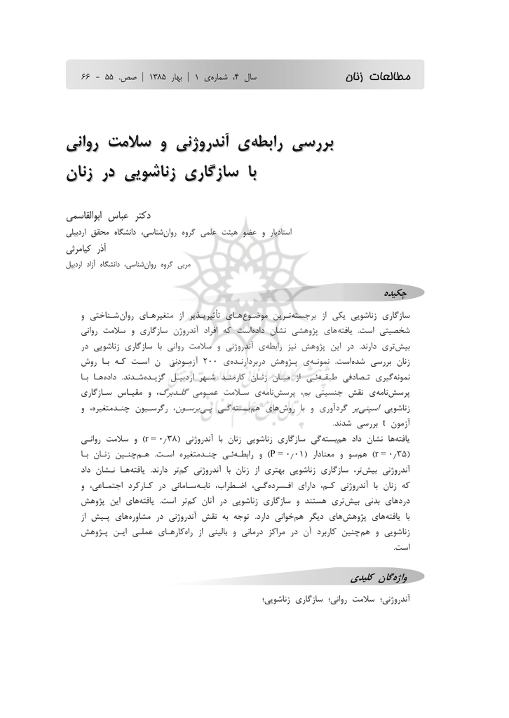 66 - êê .ƆƇ | æèíê ŹŚƸŝ | æ įƵŹŚưƃ é ƩŚſ ƱŚƳŻ šŚƘƫŚƐƯ İƳřƹŹ ŢƯLjſ ƹ İƳĥƹŹŶƳō įƶƐŝřŹ İſŹźŝ ƱŚƳŻ Źŵ İƿƺƃŚƳŻ įŹŚĭŻŚſ Śŝ İưſŚƤƫřƺŝř ŽŚŞƗ źŤĩŵ İƬǀŝŵŹř ƢƤŰƯ ƵŚĮƄƳřŵ İſŚƴƃƱřƹŹ Ƶƹźĭ İưƬƗ ŢŘǀƷ ƺƌƗ ƹ ŹŚƿŵŚŤſř İŧźƯŚǀĩ Źŷō ƪǀŝŵŹř ŵřŻō ƵŚĮƄƳřŵ İſŚƴƃƱřƹŹ Ƶƹźĭ İŝźƯ ƵŶǀĪģ ƹ İŤųŚƴºƃ ƱřƹŹ įŚºƷźǀƜŤƯ Żř źƿŸºěźǀŧŐţ įŚºƷ ƕƺºƋƺƯ ƲƿźºţƶŤƀūźŝ Żř İĪƿ İƿƺƃŚƳŻ įŹŚĭŻŚſ İƳřƹŹ ŢƯLjſ ƹ įŹŚĭŻŚſ ƱĥƹŹŶƳō ŵřźƟř ƶĩ ŢſřƵŵřŵ ƱŚƄƳ İƄƷƹĦě įŚƷ ƶŤƟŚƿ .Ţſř İŤǀƈŴƃ Źŵ İƿƺƃŚƳŻ įŹŚĭŻŚſ Śŝ İƳřƹŹ ŢƯLjſ ƹ İƳĥƹŹŶƳō įƶƐŝřŹ żǀƳ ƂƷƹĦě Ʋƿř Źŵ .ŶƳŹřŵ įźţƂǀŝ ƁƹŹ Śºŝ ƶºĩ Ţºſř Ʊ İŻ ƳŵƺºƯŻō çåå įƵŶºƳŹřŵźŝŹŵ ƂƷƹĦºě įƶºƳƺưƳ .ŢſřƵŶƃ İſŹźŝ ƱŚƳŻ Śºŝ ŚºƷƵŵřŵ .ŶƳŶºƃƵŶºƿżĭ ƪºǀŝŵŹř źƸºƃ ŶºƴƯŹŚĩ ƱŚºƳŻ ƱŚºǀƯ Żř ݺŗƶºƤŞƏ İƟŵŚƈºţ įźǀĭƶƳƺưƳ įŹŚĭŻŚºſ ŽŚºǀƤƯ ƹ īźŝŶºƬĭ İƯƺºưƗ ŢƯLjºſ įƶƯŚƳƂſźě Ʈŝ İŤǀƀƴū ƂƤƳ įƶƯŚƳƂſźě ƹ ƵźǀƜŤƯŶºƴģ ƱƺǀºſźĭŹ Ʊƺºſźƿݺě ݺĭƶŤƀºŝ ƮƷ įŚƷƁƹŹ Śŝ ƹ įŹƹōŵźĭ źƿİƴĜſř İƿƺƃŚƳŻ .ŶƳŶƃ İſŹźŝ t ƱƺƯŻō ݺƳřƹŹ ŢƯLjſ ƹ (r = åǕèí) İƳĥƹŹŶƳō Śŝ ƱŚƳŻ İƿƺƃŚƳŻ įŹŚĭŻŚſ İĭƶŤƀŝƮƷ ŵřŵ ƱŚƄƳ ŚƷƶŤƟŚƿ Śºŝ ƱŚºƳŻ ƲǀºƴģƮºƷ .Ţºſř ƵźǀƜŤƯŶºƴģ ݺŗƶºƐŝřŹ ƹ (P = åǕåæ) ŹřŵŚƴƘƯ ƹ ƺſƮƷ (r = åǕèê) ŵřŵ ƱŚƄºƳ ŚºƷƶŤƟŚƿ .ŶƳŹřŵ źţƮĩ İƳĥƹŹŶƳō Śŝ ƱŚƳŻ Żř įźŤƸŝ İƿƺƃŚƳŻ įŹŚĭŻŚſ źţƂǀŝ İƳĥƹŹŶƳō ƹ İƗŚºưŤūř ŵźĩŹŚºĩ Źŵ İƳŚƯŚºſƶºŝŚƳ śřźƐºƋř ݺĭƵŵźƀºƟř įřŹřŵ Ʈºĩ İƳĥƹŹŶƳō Śŝ ƱŚƳŻ ƶĩ ƂƷƹĦě Ʋƿř įŚƷƶŤƟŚƿ .Ţſř źţƮĩ ƱŚƳō Źŵ İƿƺƃŚƳŻ įŹŚĭŻŚſ ƹ ŶƴŤƀƷ įźţƂǀŝ İƳŶŝ įŚƷŵŹŵ Żř Ƃǀºě įŚƷƵŹƹŚƄƯ Źŵ İƳĥƹŹŶƳō ƂƤƳ ƶŝ ƶūƺţ .ŵŹřŵ İƳřƺųƮƷ źĮƿŵ įŚƷƂƷƹĦě įŚƷƶŤƟŚƿ Śŝ ƂƷƹĦºě Ʋºƿř ݺƬưƗ įŚºƷŹŚĩƵřŹ Żř İƴǀƫŚŝ ƹ İƳŚƯŹŵ żĩřźƯ Źŵ Ʊō ŵźŝŹŚĩ Ʋǀƴģ ƮƷ ƹ İƿƺƃŚƳŻ .Ţſř įŶǀƬĩ ƱŚĭƵĥřƹ İƿƺƃŚƳŻ įŹŚĭŻŚſ İƳřƹŹ ŢƯLjſ İƳĥƹŹŶƳō æèíê ŹŚƸŝ æ įƵŹŚưƃ é ƩŚſ ƱŚƳŻ šŚƘƫŚƐƯ êë ŹŚŤƠĭƂǀě ŶºƳƺǀě ŵźºƟ ŵƺºų Śºŝ źºĮƿŵ įƺºſ Żř ƹ ƶƘƯŚū Śŝ ƺſ Ĩƿ Żř ƶĩ Ţſř įŵŚƸƳ ƵŵřƺƳŚų ŵƺºƃݺƯƵŵźưƃ ƶƘƯŚū ƲƿŵŚǀƴŝ įŚƷƶƿŚě Żř ƶĩ Ţſř İŗƵŻřŶƳř ƶŝ ŵŚƸƳ Ʋƿř ŢǀưƷř .ŵŹřŵ ƹ ƲąǀºţžƳŹƺºŝ) Ţºſř ƮƫŚſ İŗƵŵřƺƳŚų ƶŝ İŝŚƿŢſŵ ƹźĭ Źŵ ƮƫŚſ İŗƶƘƯŚū ƶŝ ƱŶǀſŹ ƹ .(æèíå ÎƲąǀţžƳŹƺŝ Ţſř İƳŚƀƳř įƶƘƯŚū ƁźĮƳ įŚƷƕƺƋƺƯ ƲƿźţƶŤƀūźŝ Żř İĪƿ ÏİƿƺƃŚƳŻ įŹŚĭŻŚſ ƶƳŚŤºſƹŵ įŶºƳƺǀě İƿƺºƃŚƳŻ įŹŚĭŻŚºſ .ŵŹřŸºĭݺƯ źŧř ƵŵřƺƳŚų įƶŤƀƿŚƃ ŵźĩŹŚĩ źŝ ƶĩ įƺºƴƘƯ ƹ įŵŚºƯ įŚºƷŻŚǀƳ ƱŚºǀƯ ݺƤƐƴƯ İƫŵŚƘţ ƹ źĮƿŵĨƿ ħŹŵ ƹ ƮƷŚƠţ Śŝ ƵřŹƮƷ ƭŚºƔƳ Źŵ ŵřźºƟř ݺƳřƹŹ ŢƯLjºſ ƱƺŤºſ ƲƿźºţįŵŚǀƴŝ İƿƺƃŚƳŻ įŹŚĭŻŚſ .Ţſř ƱřźƀưƷ ƹ įŹŚĩ ƖƋƹ İƿƺƃŚƳŻ Ʋſ İƫŚƯ ƖƋƹ ŶƴƳŚƯ İƳƺĭŚƳƺĭ įŚƷƪƯŚƗ Żř ƶĩ Ţſř ƵŵřƺƳŚų ƱřŶººŝ źººţƮººĩ Ʊřźººƿř Źŵ ƶººĩ ƶººģƱō .(æîîå ÐݺūźĪƯ ƹ ŚƸƴǀººſ) ŵźƿŸººěݺºƯ źººŧř ŜƷŸººƯ Ʋºƿř Źŵ ƹŹ Ʋºƿř Żř .Ţºſř İƿƺºƃŚƳŻ įŹŚĭŻŚºſ Źŵ İƳĥƹŹŶºƳō ƂºƤƳ ŢºſřƵŶƃƶŤƀƿźĮƳ .ŵƺƃİƯ İſŹźŝ ƱŚƳŻ İƿƺƃŚƳŻ įŹŚĭŻŚſ Śŝ İƳřƹŹ ŢƯLjſ ƹ İƳĥƹŹŶƳō įƶƐŝřŹ ƂƷƹĦě ƂƷƹĦě įƶƴǀƄǀě įŚºƷƂºƤƳ İƿƺºƃŚƳŻ įŹŚĭŻŚºſ ƹ ݺƳřƹŹ ŢƯLjſ Śŝ ƍŚŞţŹř Źŵ ƮƸƯ įŚƷźǀƜŤƯ Żř İĪƿ Ó İŤǀƀºƴū ƂƤƳ įźǀĭƺſ řŹ İƳĥƹŹŶƳō (æîíæa) ÒƮŝ .Ţſř ÑİƳĥƹŹŶƳō ƵĦƿƹ ƶŝ İŤǀƀƴū Źŵ ݺĭƶºƳřŵźƯ Żř ƮƷ ƹ İĭƶƳŚƳŻ Żř ƮƷ řŹ İƳřƹřźƟ įŚƷƶſŚƴƃ ŵźƟ Ʊō Źŵ ƶĩ ŶƳřŵİƯ įŚºƷݺĭƵĦºƿƹ ƶĩ Ţſř İƀĩ ÔƱĥƹŹŶƳō źĮƿŵ ƲŴſ ƶŝ .ŵŻŚſİƯ ƶģŹŚěĨƿ ŵƺų ƂƴƯ .ŵŹřŵ ƮƷ Śŝ řŹ İƳřƹřźƟ įƶƳŚƳŻ ƹ ƶƳřŵźƯ Żř ƹ ŶƳŹřŵ ƱřźĮƿŵ Żř İŗƶƳŚĭřŶū İŤǀƀƴū įƶƳƺĭ ŚƷƱĥƹŹŶƳō (ƱŚưƷ) Ʈŝ ƵŚĭŶƿŵ Żř ƮǀƷŚººƠƯ Ŷººƴŝ Źŵ ƱŚººƳō .ŶººƳř ŹřŵŹƺººųźŝ įźººţLJřƹ ƂƴººƯ ƹ źººŤƸŝ ݺºƳřƹŹ ŢººƃřŶƸŝ įŚºƷŢºǀƘƣƺƯ ƶºŝ ŶºƯōŹŚĩ ݺƷŵŲºſŚě Źŵ ƹ ŶƴƳŚƯİưƳ İŤǀƀƴū ƂƤƳ įƶƳŚƄƿŶƳřĨƄų įřŹřŵ ŵřźºƟř ƶºĩ ŵřŵ ƱŚƄºƳ İƄƷƹĦě Źŵ (æîíæb) Ʈŝ .ŶƳř źţŵřŻō źţƵŵźŤƀĭ ƹ ƱƺĭŚƳƺĭ 1. Bornstein, Philip H., and Bornstein, Marcy T. 2. Marital Adjustment 3. Sinha, S. P., and Makerjee, N. 4. Androgyny 5. Bem, Sandra Lipsitz 6. Sex Role Orientation 7. Androgynous êì Þ ͂ ƱŚƳŻ Źŵ İƿƺƃŚƳŻ įŹŚĭŻŚſ Śŝ İƳřƹŹ ŢƯLjſ ƹ İƳĥƹŹŶƳō įƶƐŝřŹ İſŹźŝ .ŶºƳř źţŻŹƹźƸƯ żǀƳ ƱŚĩŵƺĩ Śŝ įŻŹƹƂƴĩ Źŵ ƹ ŶƳŹřŵ įźţƂǀŝ ƩLjƤŤſř źţLJŚŝ İƳĥƹŹŶƳō ݺŗƵƺǀºƃ ƶŝ ƶƳřŵźƯ įŚƷŹŚĩ Źŵ ƱŚƃŵźĩŹ