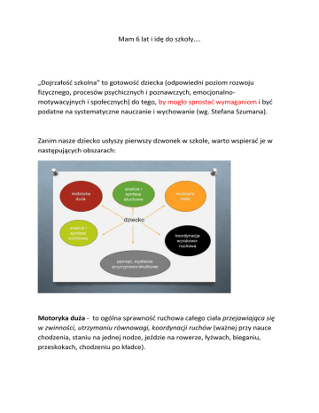 Mam 6 lat i idę do szkoły…. „Dojrzałość szkolna” to gotowość dziecka (odpowiedni poziom rozwoju fizycznego, procesów psychicznych i poznawczych, emocjonalnomotywacyjnych i społecznych) do tego, by mogło sprostać wymaganiom i być podatne na systematyczne nauczanie i wychowanie (wg. Stefana Szumana). Zanim nasze dziecko usłyszy pierwszy dzwonek w szkole, warto wspierać je w następujących obszarach: Motoryka duża - to ogólna sprawność ruchowa całego ciała przejawiająca się w zwinności, utrzymaniu równowagi, koordynacji ruchów (ważnej przy nauce chodzenia, staniu na jednej nodze, jeździe na rowerze, łyżwach, bieganiu, przeskokach, chodzeniu po kładce). Ważna jest tu też automatyzacja czynności, czyli tak dobre jej opanowanie że nie trzeba „myśleć” jak to zrobić, np. wsiąść na rower, pedałować i sterować kierownicą. Motoryka duża jest ważna przy pisaniu i czytaniu! Mam 6 lat i potrafię…… - skakać na obu nogach ok. 3 m - skakać na jednej nodze 2-3 m - przejść stopa za stopą do przodu i do tyłu ok. 3m - zrobić pięć przysiadów, - stać na jednej nodze ok. 20 sekund - stać na jednej nodze z zamkniętymi oczami 10 sekund - rzucać i łapać piłkę, - podbiec i kopnąć piłkę,