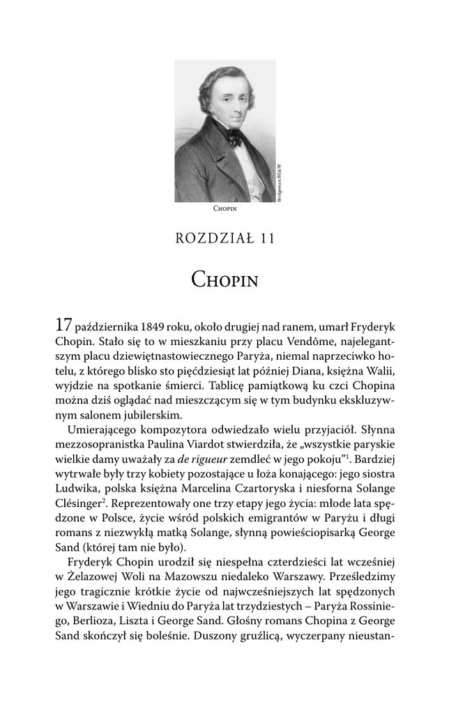 CHOPIN Bridgeman/BE&W 401 Chopin RO Z D Z I A Ł 11 Chopin 17 października 1849 roku, około drugiej nad ranem, umarł Fryderyk Chopin. Stało się to w mieszkaniu przy placu Vendôme, najelegantszym placu dziewiętnastowiecznego Paryża, niemal naprzeciwko hotelu, z którego blisko sto pięćdziesiąt lat później Diana, księżna Walii, wyjdzie na spotkanie śmierci. Tablicę pamiątkową ku czci Chopina można dziś oglądać nad mieszczącym się w tym budynku ekskluzywnym salonem jubilerskim. Umierającego kompozytora odwiedzało wielu przyjaciół. Słynna mezzosopranistka Paulina Viardot stwierdziła, że „wszystkie paryskie wielkie damy uważały za de rigueur zemdleć w jego pokoju”1. Bardziej wytrwałe były trzy kobiety pozostające u łoża konającego: jego siostra Ludwika, polska księżna Marcelina Czartoryska i niesforna Solange Clésinger2. Reprezentowały one trzy etapy jego życia: młode lata spędzone w Polsce, życie wśród polskich emigrantów w Paryżu i długi romans z niezwykłą matką Solange, słynną powieściopisarką George Sand (której tam nie było). Fryderyk Chopin urodził się niespełna czterdzieści lat wcześniej w Żelazowej Woli na Mazowszu niedaleko Warszawy. Prześledzimy jego tragicznie krótkie życie od najwcześniejszych lat spędzonych w Warszawie i Wiedniu do Paryża lat trzydziestych – Paryża Rossiniego, Berlioza, Liszta i George Sand. Głośny romans Chopina z George Sand skończył się boleśnie. Duszony gruźlicą, wyczerpany nieustan- 402 WIELCY KOMPOZYTORZY I ICH CZASY nym kaszlem, przedsięwziął krótką podróż do Anglii i Szkocji. Tuż po powrocie do Francji ostatecznie poddał się chorobie, która trawiła go od dawna. Polska Polska, w której urodził się Chopin i której symbolem się stał, długo była nieszczęśliwym miejscem. Przez stulecia jej granice z Rosją i Turcją wciąż się zmieniały. W swojej burzliwej historii najpierw rozdzierana była na dzielnice, później musiała się zmierzyć z brutalnym połączeniem krzyża i miecza znanym pod eufemistyczną nazwą zakonu krzyżackiego. Dwa stulecia po tym, gdy zagrożenie ze strony owych rycerzy przestało istnieć, Polska doznała ze strony Szwedów i Rosjan szkód równie poważnych jak te, których doświadczyły kraje niemieckie w wojnie trzydziestoletniej*. Znaczną część historii Polski symbolizuje posąg króla Zygmunta III Wazy na kolumnie u wejścia na warszawskie Stare Miasto. Jego głowę zdobi korona, w jednej ręce unosi miecz, w drugiej dzierży ogromny krzyż. Niezwykłym aspektem ustroju Polski był jej paraliżujący system polityczny, zgodnie z którym szlachta wybierała króla, a potem ograniczała jego władzę prawem liberum veto, zasadą umożliwiającą zerwanie sejmu (a w konsekwencji unieważnienie wszystkich jego uchwał) przez jednego posła. Krajem zatem faktycznie nie dało się rządzić, łatwo więc mogli go zdławić potężni sąsiedzi. W XVIII wieku królem była osoba popierana albo przez Rosjan, albo przez Szwedów. Elektorzy Saksonii, którzy w XVIII wieku byli wybierani na królów Polski (to do ich urzędników Bach wysyłał swoje skargi), zawdzięczali polską koronę Rosjanom. Szwedzi próbowali ich odsunąć, doprowadzając do elekcji swego marionetkowego kandydata Stanisława Leszczyńskiego**, jednak Rosjanie dwukrotnie go pokonali, ponownie umieszczając na polskim tronie Wettynów. Jako –––––––––––– * Tocząca się na początku XVII wieku wojna między Moskalami a Polakami jest tłem akcji opery Michała Glinki Życie za cara (Iwan Susanin). Popierany przez Polskę Dymitr Samozwaniec pretendował do moskiewskiego tronu i zajął Moskwę, ale został zabity podczas powstania przeciwko wojskom polskim. Michał Romanow, który został carem w 1613 roku, dał początek dynastii trwającej do XX wieku. ** Leszczyński był ojcem królowej Marii, nudnej żony Ludwika XV, przed którą w Paryżu grał Mozart. CHOPIN 403 rekompensatę Leszczyńskiemu przyznano księstwo Lotaryngii, które na współczesnych mapach można zlokalizować wokół Nancy w północno-wschodniej części Francji graniczącej z Rzeszą Niemiecką. Wydaje się, że przodkowie Chopina podążyli tutaj za królem Stanisławem. Wettynowie jednak nie interesowali się specjalnie swym polskim władztwem. Po śmierci Augusta III Polacy wybrali Stanisława Augusta Poniatowskiego, weterana sypialni carycy Katarzyny Wielkiej, ale zamierzonych przez tego króla reform za wiele było zarówno jego ekskochance na wschodzie, jak i sąsiadom na zachodzie. W roku 1772 pruski król Fryderyk Wielki podzielił Polskę: odciągnął Rosjan i Austriaków od wojny o chylącą się ku upadkowi Turcję, gdzie zwycięstwo którejś ze stron zdestabilizowałoby równowagę sił. Wynagrodził ich za to „kawałkami” Polski, dla siebie biorąc najsmakowitszy, który pozwolił mu połączyć Brandenburgię z Prusami Wschodnimi. To szokujące pociągnięcie zmniejszyło liczbę ludności Polski o jedną piątą3. Po kilku latach niestabilności w roku 1793 nastąpił drugi rozbiór Polski, która teraz została pozbawiona dwóch trzecich swego terytorium i ludności. Mniej więcej w tym czasie ojciec kompozytora Mikołaj (Nicholas) Chopin wrócił do Polski, by podjąć pracę jako księgowy w fabryce tytoniowej. Fabryka zbankrutowała, a Mikołaj, zanim zdołał ponownie wyjechać do Francji, znalazł się w samym środku powstania, na którego czele stanął Tadeusz Kościuszko, który wcześniej walczył o niepodległość Stanów Zjednoczonych. Dowodzeni przez niego polscy chłopi uzbrojeni w piki i kosy nie byli odpowiednim przeciwnikiem dla Rosjan. Powstańcze wojska wycofały się do Warszawy, która po dwóch miesiącach została zdobyta przez generała Suworowa i poddana straszliwej rzezi; w ciągu jednego dnia zamordowano tam dwadzieścia tysięcy ludzi4. Mikołaj miał więc z pewnością wiele szczęścia, że przeżył.
