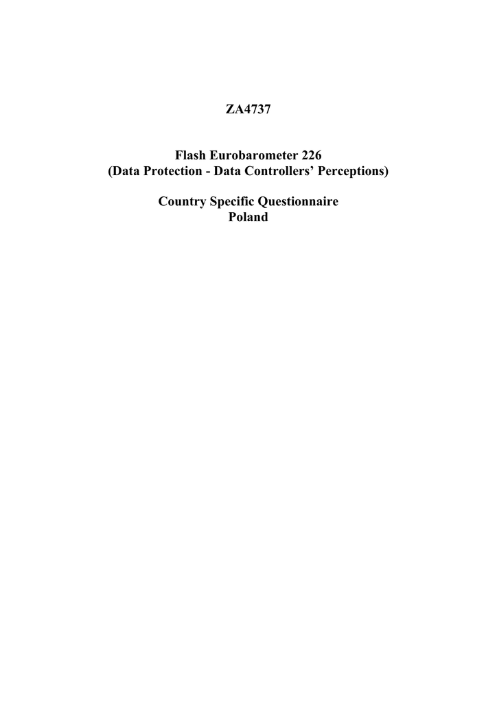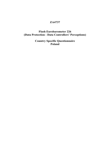ZA4737 Flash Eurobarometer 226 (Data Protection - Data Controllers’ Perceptions) Country Specific Questionnaire Poland FL226 Data Protection, B2B Questionnaire Dzień Dobry, nazywam się....................... i chciał(a)bym rozmawiać z osobą odpowiedzialną za sprawy związane z ochroną danych wewnątrz Pana(i) firmy. Przez to rozumiem osobę odpowiedzialną za obsługiwanie jakiejkolwiek bazy danych zawierającej informacje osobowe na temat klientów, dostawców lub pracowników. [zaakceptowany target: pracownik ochrony danych, lub odpowiedzialny za zagadnienia ochrony danych, IT Menedżer, Menedżer Zasobów Ludzkich, Menedżer ds. Marketingu] Na początek, chciał(a)bym uzyskać kilka informacji na temat Pana(i) firmy. D1. Jakie jest Pana(i) stanowisko w tej firmie? - urzędnik odpowiedzialny za ochronę danych osobowych - dyrektor IT ..................................................................... 2 - dyrektor marketingowy .................................................. 3 - dyrektor personalny....................................................... 4 - dyrektor generalny ........................................................ 5 - [Inne] ............................................................................. 6 1 [Inny] = [ZAKOŃCZYĆ ANKIETĘ - ANKIETA NIEWAŻNA, JEŚLI OSOBA ODPOWIEDZIALNA NIE UWAŻA SAMA SIEBIE ZA ODPOWIEDZIALNĄ ZA SPRAWY OCHRONY DANYCH WEWNĄTRZ FIRMY] D2N. Dla kolejnych pytań, proszę ograniczyć swoje odpowiedzi do działalności, jaką Pana(i) firma prowadzi tylko w Polsce. Ilu pracowników ma Pana(i) firma w Polsce? 99999 - Nie wie/Brak odpowiedzi JEŚLI MNIEJ NIŻ 20 PODZIĘKOWAĆ I ZAKOŃCZYĆ Jeśli D2N=Nie wie/brak odpowiedzi D2. Dla kolejnych pytań, proszę ograniczyć swoje odpowiedzi do działalności, jaką Pana(i) firma prowadzi tylko w Polsce. Ilu pracowników ma Pana(i) firma w Polsce? - mniej niż 20 .................................................................. 0 - 20-49 ............................................................................ 1 - 50-249 .......................................................................... 2 - 250-499 ........................................................................ 3 - 500 lub więcej .............................................................. 4 - [Nie wie/Brak odpowiedzi]............................................. 9 JEŚLI MNIEJ NIŻ 20 PODZIĘKOWAĆ I ZAKOŃCZYĆ D3. Czy Pana(i) firma jest głównie zaangażowana w ..... [ODCZYTAĆ] - [TYLKO JEDNA ODPOWIEDŹ] - budownictwo lub budownictwo lądowe i wodne ........... 1 - górnictwo, przemysł wydobywczy ................................ 2 - produkcję i wytwarzanie dóbr ....................................... 3 - handel i dystrubucję (hurt lub detal) ............................. 4 - transport (dóbr lub ludzi) ............................................... 5 - usługi finansowe (bank, ubezpieczenia, maklerstwo) .. 6 - usługi dla biznesu ......................................................... 7 - usługi dla ludności ........................................................ 8 - inne usługi .................................................................... 9 - administrację .............................................................. 10 - rolnictwo ...................................................................... 11 - [(żaden z tych przypadków, ale nie rolnictwo) Wyjaśnić szczegółowo] - [Nie wie/Brak odpowiedzi] .......................................... 99 Rolnictwo: Zakończyć ankietę - ankieta nieważna Nie wie/Brak odpowiedzi: Zakończyć ankietę - ankieta nieważna 98 JEŚLI D3= żaden z nich D3b. Proszę, powiedzieć szczegółowo JEŚLI RESPONDENT POWIE “DZIAŁALNOŚĆ ROLNICZA, PRZESKOCZ Z POWROTEM DO POPRZEDNIEJ STRONY I WYBIERZ WŁAŚCIWĄ ODPOWIEDŹ (Rolnictwo) D4. Pana(i) firma jest... - niezależną firmą ........................................................... 1 - firmą matką międzynarodowej grupy ........................... 2 - oddziałem wielonarodowej grupy z centralą w Unii Europejskiej - oddziałem wielonarodowej grupy z centralą poza Unią Europejską - [Nie wie/Brak odpowiedzi] ............................................ 9 3 4 Nie wie/Brak odpowiedzi: Zakończyć ankietę - ankieta nieważna Q1. Czy powiedział(a)by Pan(i), że poziom ochrony, oferowany przez polską ustawę o ochronie danych osobowych, jest dla obywateli ....? - Wysoki .......................................................................... 1 - Średni ........................................................................... 2 - Niski .............................................................................. 3 - [Nie wie/Brak odpowiedzi]............................................. 9 Q1a. Jak dobrze jest Pan(i) zaznajomiony(a) z postanowieniami polskiej ustawy o ochronie danych? - Bardzo dobrze zaznajomiony(a) .................................. 1 - Dość dobrze zaznajomiony(a) ..................................... 2 - Raczej niezaznajomiony(a) .......................................... 3 - [Nie wie/Brak odpowiedzi] ............................................ 9 Q2. Z perspektywy Pana(i) biznesu, jak również z ogólnego punktu widzenia, czy powiedział(a)by Pan(i), że raczej się zgadza czy raczej nie zgadza z każdym z poniższych stwierdzeń, dotyczących wymogów prawa ochrony danych osobowych? - Raczej się zgadzam ..................................................... 1 - Raczej się nie zgadzam ............................................... 2 - [Nie wie/Brak odpowiedzi]............................................. 9 a) Wymogi ustawy o ochronie danych osobowych są konieczne by respektować wysoki poziom ochrony konsumentów i podstawowe prawa obywateli.......................................................... 1 2 9 b) Wymogi ustawy o ochronie danych osobowych są w pewnych względach zbyt surowe. .................................................................. 1 2 9 c) Wymo