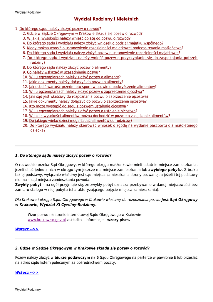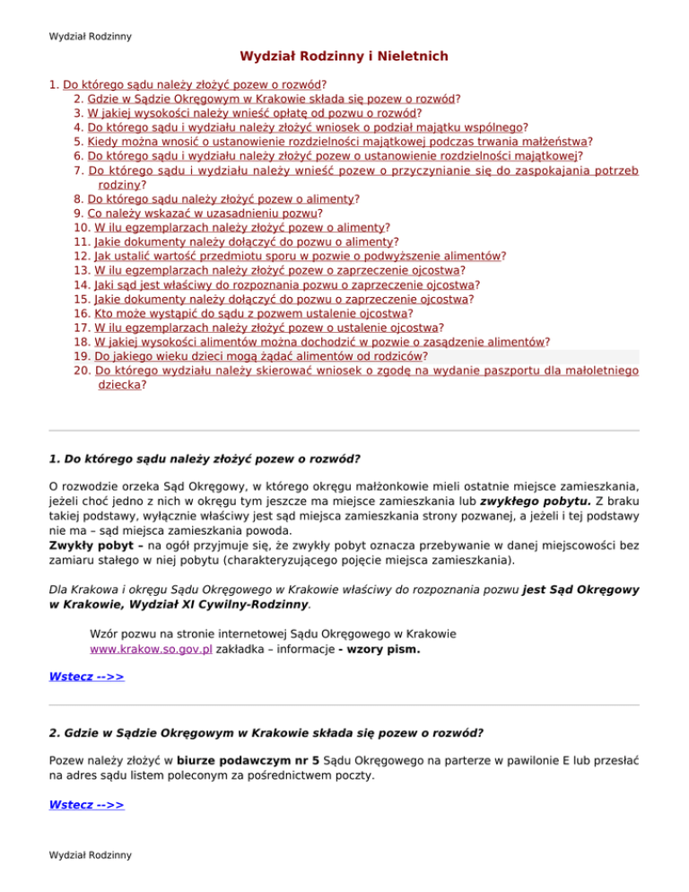 Wydział Rodzinny Wydział Rodzinny i Nieletnich 1. Do którego sądu należy złożyć pozew o rozwód? 2. Gdzie w Sądzie Okręgowym w Krakowie składa się pozew o rozwód? 3. W jakiej wysokości należy wnieść opłatę od pozwu o rozwód? 4. Do którego sądu i wydziału należy złożyć wniosek o podział majątku wspólnego? 5. Kiedy można wnosić o ustanowienie rozdzielności majątkowej podczas trwania małżeństwa? 6. Do którego sądu i wydziału należy złożyć pozew o ustanowienie rozdzielności majątkowej? 7. Do którego sądu i wydziału należy wnieść pozew o przyczynianie się do zaspokajania potrzeb rodziny? 8. Do którego sądu należy złożyć pozew o alimenty? 9. Co należy wskazać w uzasadnieniu pozwu? 10. W ilu egzemplarzach należy złożyć pozew o alimenty? 11. Jakie dokumenty należy dołączyć do pozwu o alimenty? 12. Jak ustalić wartość przedmiotu sporu w pozwie o podwyższenie alimentów? 13. W ilu egzemplarzach należy złożyć pozew o zaprzeczenie ojcostwa? 14. Jaki sąd jest właściwy do rozpoznania pozwu o zaprzeczenie ojcostwa? 15. Jakie dokumenty należy dołączyć do pozwu o zaprzeczenie ojcostwa? 16. Kto może wystąpić do sądu z pozwem ustalenie ojcostwa? 17. W ilu egzemplarzach należy złożyć pozew o ustalenie ojcostwa? 18. W jakiej wysokości alimentów można dochodzić w pozwie o zasądzenie alimentów? 19. Do jakiego wieku dzieci mogą żądać alimentów od rodziców? 20. Do którego wydziału należy skierować wniosek o zgodę na wydanie paszportu dla małoletniego dziecka? 1. Do którego sądu należy złożyć pozew o rozwód? O rozwodzie orzeka Sąd Okręgowy, w którego okręgu małżonkowie mieli ostatnie miejsce zamieszkania, jeżeli choć jedno z nich w okręgu tym jeszcze ma miejsce zamieszkania lub zwykłego pobytu. Z braku takiej podstawy, wyłącznie właściwy jest sąd miejsca zamieszkania strony pozwanej, a jeżeli i tej podstawy nie ma – sąd miejsca zamieszkania powoda. Zwykły pobyt – na ogół przyjmuje się, że zwykły pobyt oznacza przebywanie w danej miejscowości bez zamiaru stałego w niej pobytu (charakteryzującego pojęcie miejsca zamieszkania). Dla Krakowa i okręgu Sądu Okręgowego w Krakowie właściwy do rozpoznania pozwu jest Sąd Okręgowy w Krakowie, Wydział XI Cywilny-Rodzinny. Wzór pozwu na stronie internetowej Sądu Okręgowego w Krakowie www.krakow.so.gov.pl zakładka – informacje - wzory pism. Wstecz -->> 2. Gdzie w Sądzie Okręgowym w Krakowie składa się pozew o rozwód? Pozew należy złożyć w biurze podawczym nr 5 Sądu Okręgowego na parterze w pawilonie E lub przesłać na adres sądu listem poleconym za pośrednictwem poczty. Wstecz -->> Wydział Rodzinny Wydział Rodzinny 3. W jakiej wysokości należy wnieść opłatę od pozwu o rozwód? Opłata od pozwu o rozwód jest stała i wynosi 600 zł. Wstecz -->> 4. Do którego sądu i wydziału należy złożyć wniosek o podział majątku wspólnego? Wniosek o podział majątku wspólnego składa się zawsze do wydziału cywilnego sądu rejonowego właściwego według miejsca położenia majątku, a jeżeli wspólność ustała przez śmierć jednego z małżonków sądu spadku. Sąd spadku – jest to sąd właściwy według ostatniego miejsca zamieszkania spadkodawcy, a jeżeli jego miejsca zamieszkania w Polsce nie da się ustalić, sąd miejsca w którym znajduje się majątek spadkowy lub jego część. Wniosek o podział majątku wspólnego należy złożyć tylko po ustaniu wspólności majątkowej między małżonkami. Ustanie wspólności majątkowej następuje przez: - śmierć jednego z małżonków, - orzeczenie rozwodu, - orzeczenie separacji, - ustanowienie rozdzielności majątkowej orzeczeniem sądu, - powstanie rozdzielności majątkowej z mocy prawa w razie ubezwłasnowolnienia lub ogłoszenia upadłości jednego z małżonków, - ustanowienie rozdzielności majątkowej poprzez umowę zawartą pomiędzy małżonkami. Wzór wniosku na stronie internetowej Sądu Okręgowego w Krakowie www.krakow.so.gov.pl zakładka – informacje - wzory pism. Wstecz -->> 5. Kiedy można wnosić o ustanowienie rozdzielności majątkowej podczas trwania małżeństwa? Taki pozew można wnieść do sądu, jeżeli wystąpią ku temu ważne powody. Z pozwem o ustanowienie rozdzielności majątkowej może wystąpić każdy z małżonków podczas trwania małżeństwa. Ustanowienia przez sąd rozdzielności majątkowej może żądać także wierzyciel jednego z małżonków, jeżeli uprawdopodobni, że zaspokojenie wierzytelności stwierdzonej tytułem wykonawczym wymaga dokonania podziału majątku wspólnego małżonków. Wstecz -->> 6. Do którego sądu i wydziału należy złożyć pozew o ustanowienie rozdzielności majątkowej? Wydział Rodzinny Wydział Rodzinny Powództwo o ustanowienie rozdzielności majątkowej wytacza się wyłącznie przed sąd rejonowy (pozew składa się do Wydziału Rodzinnego i Nieletnich), w którego okręgu małżonkowie mieli ostatnie miejsce zamieszkania, jeżeli choć jedno z nich w okręgu tym jeszcze ma miejsce zamieszkania lub zwykłego pobytu. Z braku takiej podstawy wyłącznie właściwy jest sąd miejsca zamieszkania strony pozwanej, a jeżeli i tej podstawy nie ma – sąd miejsca zamieszkania powoda. Zwykły pobyt – na ogół przyjmuje się, że zwykły pobyt oznacza przebywanie w danej miejscowości bez zamiaru stałego w niej pobytu (charakteryzującego pojęcie miejsca zamieszkania). Wzór wniosku na stronie internetowej Sądu Okręgowego w Krakowie www.krakow.so.gov.pl zakładka informacje - wzory pism. Wstecz -->> 7. Do którego sądu i wydziału należy wnieść pozew o przyczynianie się do zaspokajania potrzeb rodziny? Do kt Pozew należy złożyć do sądu rejonowego (Wydziału Rodzinnego i Nieletnich). Właściwy miejscowo jest sąd według miejsca zamieszkania strony pozwanej jak i sąd rejonowy, w którego okręgu ma miejsce zamieszkania małżonek uprawniony d
