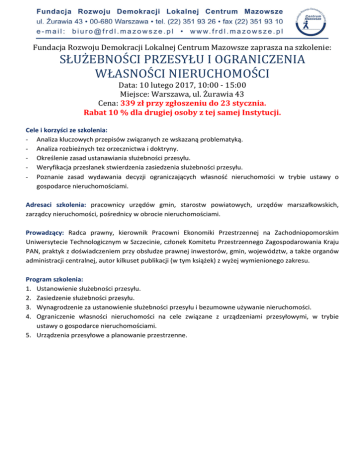 Fundacja Rozwoju Demokracji Lokalnej Centrum Mazowsze zaprasza na szkolenie: SŁUŻEBNOŚCI PRZESYŁU I OGRANICZENIA WŁASNOŚCI NIERUCHOMOŚCI Data: 10 lutego 2017, 10:00 - 15:00 Miejsce: Warszawa, ul. Żurawia 43 Cena: 339 zł przy zgłoszeniu do 23 stycznia. Rabat 10 % dla drugiej osoby z tej samej Instytucji. Cele i korzyści ze szkolenia: - Analiza kluczowych przepisów związanych ze wskazaną problematyką. - Analiza rozbieżnych tez orzecznictwa i doktryny. - Określenie zasad ustanawiania służebności przesyłu. - Weryfikacja przesłanek stwierdzenia zasiedzenia służebności przesyłu. - Poznanie zasad wydawania decyzji ograniczających własność nieruchomości w trybie ustawy o gospodarce nieruchomościami. Adresaci szkolenia: pracownicy urzędów gmin, starostw powiatowych, urzędów marszałkowskich, zarządcy nieruchomości, pośrednicy w obrocie nieruchomościami. Prowadzący: Radca prawny, kierownik Pracowni Ekonomiki Przestrzennej na Zachodniopomorskim Uniwersytecie Technologicznym w Szczecinie, członek Komitetu Przestrzennego Zagospodarowania Kraju PAN, praktyk z doświadczeniem przy obsłudze prawnej inwestorów, gmin, województw, a także organów administracji centralnej, autor kilkuset publikacji (w tym książek) z wyżej wymienionego zakresu. Program szkolenia: 1. Ustanowienie służebności przesyłu. 2. Zasiedzenie służebności przesyłu. 3. Wynagrodzenie za ustanowienie służebności przesyłu i bezumowne używanie nieruchomości. 4. Ograniczenie własności nieruchomości na cele związane z urządzeniami przesyłowymi, w trybie ustawy o gospodarce nieruchomościami. 5. Urządzenia przesyłowe a planowanie przestrzenne. ZGŁOSZENIE SŁUŻEBNOŚCI PRZESYŁU I OGRANICZENIA WŁASNOŚCI NIERUCHOMOŚCI Data: 10 lutego 2017, 10:00 - 15:00 Miejsce: Warszawa, ul. Żurawia 43 Cena: 339 zł przy zgłoszeniu do 27 stycznia. Rabat 10 % dla drugiej osoby z tej samej Instytucji. Instytucja (dane do faktury): ................................................................................................ Adres: ................................................................................................................................. NIP: ..................................................................................................................................... L.p. Imię i nazwisko Wydział tel. e-mail 1.......................................................................................................................................... 2.......................................................................................................................................... 3.......................................................................................................................................... Prosimy o zaznaczenie znakiem x, jeśli dotyczy: Proszę o posiłek wegetariański Szkolenie finansowane w ramach Krajowego Funduszu Szkoleniowego szkolenie w ramach Forum Skarbników szkolenie w ramach Forum Sekretarzy szkolenie w ramach Forum Kadr ........................................................... podpis i pieczątka osoby delegującej Zgłoszenia prosimy przesyłać do 3 lutego 2017 r. fax: (22) 351 93 10, e-mail: [email protected] lub wybrać opcje zapisu przez stronę www.frdl.mazowsze.pl Ewentualną rezygnację ze szkolenia można zgłosić najpóźniej na dwa dni robocze przed szkoleniem. W przypadku niewykorzystania zgłoszonego uczestnictwa - Urząd będzie zobowiązany do sfinansowania 60% odpłatności za uczestnictwo i materiały. FRDL zastrzega sobie prawo odwołania szkolenia. Miejsce szkolenia: Warszawa, ul. Żurawia 43. Lokalizacja 300 metrów od Metra Centrum. Cena: 339 zł netto przy zgłoszeniu do 27 stycznia. Cena po 27 stycznia to 389 zł. Rabat 10 % dla drugiej osoby z tej samej Instytucji. Zwolnienie z VAT w przypadku finansowania ze środków publicznych. W cenie materiały szkoleniowe, zaświadczenie, lunch oraz przerwy kawowe. Płatność przelewem, na podstawie faktury wystawionej w dniu szkolenia. Szkolenia realizujemy również w formie zamkniętej na terenie Instytucji. Zapytania prosimy kierować na adres email: [email protected]