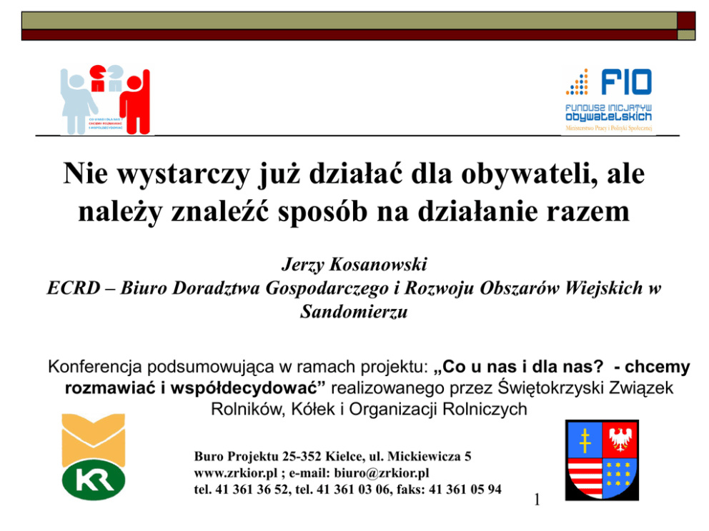 Nie wystarczy już działać dla obywateli, ale należy znaleźć sposób na działanie razem Jerzy Kosanowski ECRD – Biuro Doradztwa Gospodarczego i Rozwoju Obszarów Wiejskich w Sandomierzu Konferencja podsumowująca w ramach projektu: „Co u nas i dla nas? - chcemy rozmawiać i współdecydować” realizowanego przez Świętokrzyski Związek Rolników, Kółek i Organizacji Rolniczych Buro Projektu 25-352 Kielce, ul. Mickiewicza 5 www.zrkior.pl ; e-mail: [email protected] tel. 41 361 36 52, tel. 41 361 03 06, faks: 41 361 05 94 1 Podsumowanie warsztatów aktywności lokalnej we Włoszczowie w dniu 16.12.2014 r. PROBLEMY W OBSZARZE SPOŁECZNO-GOSPODARCZYM o Bariery polityczne, tłumienie aktywności i inicjatyw społecznych mieszkańców przez lokalne władze i „układy” polityczne będące u władzy, upartyjnienie wszelkich inicjatyw lokalnych prowadzące do głębokich podziałów społecznych. o Brak planu zagospodarowania przestrzennego gminy. o Zbyt skromne środki finansowych na utrzymanie obiektów użyteczności publicznej. o Odchodzenie przedsiębiorców z terenu gminy poprzez praktyki dyskryminacyjne podmiotów gospodarczych, powodowane upartyjnianiem inicjatyw lokalnych. 2 o o o o o Brak umiejętności tworzenia partnerskiej współpracy trójsektorowej przyczyniającej się do rozwoju lokalnego. Brak przyjaznego klimatu do rozwoju mikroprzedsiębiorstw na terenie gminy. Brak wsparcia organizacyjnego i merytorycznego do rozwoju i działalności organizacji pozarządowych, w szczególności na obszarach wiejskich. Brak form mecenatu (opieki) nad działalnością tego typu organizacji. Brak wsparcia dla inicjatyw lokalnych w zakresie pozyskiwania środków finansowych. 3 Brak działań w kierunku promocji gminy. PROBLEMY W OBSZARZE INFRASTRUKTURY TECHNICZNEJ o o o o o o Brak koordynacji prac nad utrzymaniem estetyki miasta i gminy oraz zieleni przy drogach i miejscach publicznych. Niedostępne i niewykorzystane możliwości dworca kolejowego wraz z otoczeniem, fatalny dojazd do dworca, jako wizytówki miasta. Nie funkcjonalny system komunikacji miejskiej, brak korelacji z rozkładem jazdy pociągów i autobusów. Nieuzasadnione i zbyteczne rozszerzenie strefy ochrony ujęcia wody, powodujące ograniczenia inwestycyjne. Zagrożenie zapewnienia dostaw energii cieplnej Nie zagospodarowane nieruchomości będące w zasobach 4 komunalnych. PROBLEMY W OBSZARZE KAPITAŁ LUDZKI o o o o o Brak rozumienia idei samorządności przez pracowników samorządowych i radnych. Brak wysokiej jakości kadry w samorządzie lokalnym do sprawowania funkcji publicznych na miarę potrzeb współczesnej rzeczywistości, brak chęci do doskonalenia swoich umiejętności. Brak wymagań w ordynacji wyborczej wobec kandydatów do pełnienia funkcji publicznych, co skutkuje dokonywaniem wyboru nie adekwatnych przedstawicieli do sprawowania mandatu radnego na szczeblu gminy Brak empatii ze strony władzy wobec oddolnych inicjatyw środowiska. 5 Brak liderów rozwoju lokalnego. o o o o Odpływ młodych ludzi z terenu gminy. Niska efektywność staży finansowanych ze środków publicznych, odmienne traktowanie sektora publicznego i prywatnego w odniesieniu do obowiązku zatrudniania stażystów po zakończeniu stażu. Pogłębianie zjawiska pasywności w młodym pokoleniu, brak motywacji do kształcenia, podejmowania pracy, angażowania się w sprawy społeczne i zawodowe. Niski poziom upowszechniania kształcenia ustawicznego wśród dorosłych, niska skuteczność istniejących form edukacji ustawicznej. 6 o o o Niski poziom kompetencji społecznych mieszkańców (umiejętności przydatnych w prywatnych i zawodowych sytuacjach życiowych: komunikacja społeczna, asertywność, motywacja, autoprezentacja, radzenie sobie ze stresem i emocjami, negocjacje, praca zespołowa, rozwiązywanie konfliktów, wytyczanie celów, planowanie, zarządzanie zmianą, itp.). Niski poziom kształcenia zawodowego, niedostosowanego do potrzeb współczesnego rynku pracy. Niska świadomość obywatelska mieszkańców. 7 PROBLEMY W OBSZARZE KULTURY FIZYCZNEJ o Brak infrastruktury do rozwoju rekreacji i turystyki (ścieżki rowerowe, miejsca rekreacji) 8 Podsumowanie warsztatów aktywności lokalnej we Sędziszowie w dniu 17.12.2014 r. PROBLEMY W OBSZARZE SPOŁECZNO-GOSPODARCZYM o Niska aktywność społeczna mieszkańców gminy. o Brak chęci współpracy międzyludzkiej dla budowania wspólnego dobra gminy. o Roszczeniowość postaw mieszkańców we wszelkich przejawach życia społecznego-gospodarczego gminy. o Opór mieszkańców i tworzenie nieuzasadnionych barier do podejmowania inicjatyw gospodarczych – działalności gospodarczej na terenie gminy. o Duża część gminy to obszary chronione, które stanowią barierę do 9 rozwoju nowych inwestycji. o o o o o Problemy z dostępem do specjalistycznych usług służby zdrowia. Mało szczelny system przyznawania zasiłków z pomocy społecznej (ukrywanie dochodów, wyłudzanie zasiłków i innych form pomocy socjalnej). Bierność społeczna i brak aktywności i zaangażowania w prace organizacji pozarządowych. Brak przygotowanych liderów do organizowania, aktywizowania, motywowania i koordynowania lokalnych inicjatyw społecznych. Brak akceptacji społecznej w odniesieniu do 10 podejmowanych inicjatyw przez lokalnych liderów. o o o Nieprzygotowanie mieszkańców do kreowania zmian w swoim środowisku, tworzenie barier i brak umiejętności do podejmowania odpowiedzialności za podejmowane inicjatywy lokalne. Ograniczony rynek pracy, brak klimatu do tworzenia nowych miejsc pracy, współpracy na rzecz rozwoju przedsiębiorczości. Niskie umiejętności mieszkańców, brak wsparcia w zakresie pozyskiwania środków finansowych na rozwój inicjatyw gospodarczych. 11 PROBLEMY W OBSZARZE INFRASTRUKTURY TECHNICZNEJ o o o o o o o Brak kanalizacji w części gminy. Brak sieci gazowej w gminie Mało funkcjonalna sieć komunikacji publicznej wieś-miasto. Brak bezkolizyjn