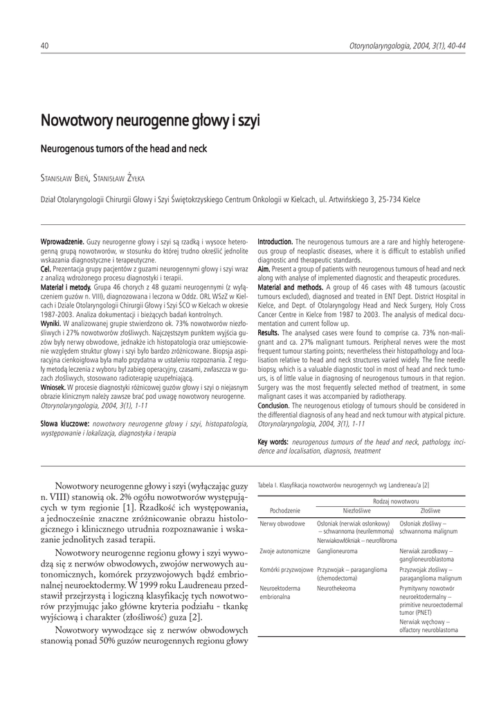 Otorynolaryngologia, 2004, 3(1), 40-44 40 Nowotwor Nowotworyy neurogenne g³owy i szyi Neurogenous tumors of the head and neck STANIS£AW BIEÑ, STANIS£AW ¯Y£KA Dzia³ Otolaryngologii Chirurgii G³owy i Szyi Œwiêtokrzyskiego Centrum Onkologii w Kielcach, ul. Artwiñskiego 3, 25-734 Kielce Wprowadzenie. Guzy neurogenne g³owy i szyi s¹ rzadk¹ i wysoce heterogenn¹ grup¹ nowotworów, w stosunku do której trudno okreœliæ jednolite wskazania diagnostyczne i terapeutyczne. Cel. Prezentacja grupy pacjentów z guzami neurogennymi g³owy i szyi wraz z analiz¹ wdro¿onego procesu diagnostyki i terapii. Materia³ i metody metody.. Grupa 46 chorych z 48 guzami neurogennymi (z wy³¹czeniem guzów n. VIII), diagnozowana i leczona w Oddz. ORL WSzZ w Kielcach i Dziale Otolaryngologii Chirurgii G³owy i Szyi ŒCO w Kielcach w okresie 1987-2003. Analiza dokumentacji i bie¿¹cych badañ kontrolnych. Wyniki. W analizowanej grupie stwierdzono ok. 73% nowotworów niez³oœliwych i 27% nowotworów z³oœliwych. Najczêstszym punktem wyjœcia guzów by³y nerwy obwodowe, jednak¿e ich histopatologia oraz umiejscowienie wzglêdem struktur g³owy i szyi by³o bardzo zró¿nicowane. Biopsja aspiracyjna cienkoig³owa by³a ma³o przydatna w ustaleniu rozpoznania. Z regu³y metod¹ leczenia z wyboru by³ zabieg operacyjny, czasami, zw³aszcza w guzach z³oœliwych, stosowano radioterapiê uzupe³niaj¹c¹. Wniosek. W procesie diagnostyki ró¿nicowej guzów g³owy i szyi o niejasnym obrazie klinicznym nale¿y zawsze braæ pod uwagê nowotwory neurogenne. Otorynolaryngologia, 2004, 3(1), 1-11 S³owa kluczowe: nowotwory neurogenne g³owy i szyi, histopatologia, wystêpowanie i lokalizacja, diagnostyka i terapia Introduction. The neurogenous tumours are a rare and highly heterogeneous group of neoplastic diseases, where it is difficult to establish unified diagnostic and therapeutic standards. Aim. Present a group of patients with neurogenous tumours of head and neck along with analyse of implemented diagnostic and therapeutic procedures. Material and methods. A group of 46 cases with 48 tumours (acoustic tumours excluded), diagnosed and treated in ENT Dept. District Hospital in Kielce, and Dept. of Otolaryngology Head and Neck Surgery, Holy Cross Cancer Centre in Kielce from 1987 to 2003. The analysis of medical documentation and current follow up. Results. The analysed cases were found to comprise ca. 73% non-malignant and ca. 27% malignant tumours. Peripheral nerves were the most frequent tumour starting points; nevertheless their histopathology and localisation relative to head and neck structures varied widely. The fine needle biopsy, which is a valuable diagnostic tool in most of head and neck tumours, is of little value in diagnosing of neurogenous tumours in that region. Surgery was the most frequently selected method of treatment, in some malignant cases it was accompanied by radiotherapy. Conclusion. The neurogenous etiology of tumours should be considered in the differential diagnosis of any head and neck tumour with atypical picture. Otorynolaryngologia, 2004, 3(1), 1-11 Key words: neurogenous tumours of the head and neck, pathology, incidence and localisation, diagnosis, treatment Nowotwory neurogenne g³owy i szyi (wy³¹czaj¹c guzy n. VIII) stanowi¹ ok. 2% ogó³u nowotworów wystêpuj¹cych w tym regionie [1]. Rzadkoœæ ich wystêpowania, a jednoczeœnie znaczne zró¿nicowanie obrazu histologicznego i klinicznego utrudnia rozpoznawanie i wskazanie jednolitych zasad terapii. Nowotwory neurogenne regionu g³owy i szyi wywodz¹ siê z nerwów obwodowych, zwojów nerwowych autonomicznych, komórek przyzwojowych b¹dŸ embrionalnej neuroektodermy. W 1999 roku Laudreneau przedstawi³ przejrzyst¹ i logiczn¹ klasyfikacjê tych nowotworów przyjmuj¹c jako g³ówne kryteria podzia³u - tkankê wyjœciow¹ i charakter (z³oœliwoœæ) guza [2]. Nowotwory wywodz¹ce siê z nerwów obwodowych stanowi¹ ponad 50% guzów neurogennych regionu g³owy Tabela I. Klasyfikacja nowotworów neurogennych wg Landreneau’a [2] Rodzaj nowotworu Pochodzenie Niez³oœliwe Z³oœliwe Nerwy obwodowe Os³oniak (nerwiak os³onkowy) Os³oniak z³oœliwy – – schwannoma (neurilemmoma) schwannoma malignum Nerwiakow³ókniak – neurofibroma Zwoje autonomiczne Ganglioneuroma Komórki przyzwojowe Przyzwojak – paraganglioma (chemodectoma) Neuroektoderma Neurothekeoma embrionalna Nerwiak zarodkowy – ganglioneuroblastoma Przyzwojak z³oœliwy – paraganglioma malignum Prymitywny nowotwór neuroektodermalny – primitive neuroectodermal tumor (PNET) Nerwiak wêchowy – olfactory neuroblastoma Bieñ S., ¯y³ka S.: Nowotwory neurogenne regionu g³owy i szyi i szyi. W grupie tej ok. 45-50% stanowi niez³oœliwy nerwiak os³onkowy (schwannoma) [3,4,5]. Twardy otorebkowany guz, z regu³y zwi¹zany jest z nerwem, b¹dŸ w³ókna nerwu wchodz¹ w sk³ad jego torebki. W przypadku niez³oœliwych otorebkowanych nerwiaków zwi¹zanych z wa¿nymi funkcjonalnie nerwami, rekomendowane jest wewn¹trztorebkowe, mikrochirurgiczne wy³uszczenie guza, aby zachowaæ biegn¹ce w torebce w³ókna nerwowe [5,6,7]. Taka technika nie zawsze jest jednak mo¿liwa z uwagi na wielkoœæ guza, czy trudny dostêp chirurgiczny. Charakterystyczn¹ cech¹ jest, nierzadko spotykane, znaczne pogrubienie pnia nerwu zwi¹zanego z nerwiakiem os³onkowym, a w czêœci przypadków równie¿ innych nerwów widocznych w polu operacyjnym [6,7,8,9]. Drugim, co do czêstoœci, nowotworem neurogennym g³owy i szyi (ok. 30%) jest przyzwojak ( paraganglioma), spotykany najczêœciej w miejscu anatomicznie zdefiniowanych cia³ przyzwojowych – na szyi w okolicy rozwidlenia têtnicy szyjnej wspólnej (carotid body paraganglioma ), w jamie bêbenkowej (paraganglioma tympanicum),w okolicy opuszki ¿y³y szyjnej (paragangloma jugulare) i wyj¹tkowo rzadko – w górnym odcinku szyjnej czêœci nerwu b³êdnego (paraganglioma vagale). Objawy kliniczne przyzwojaka 